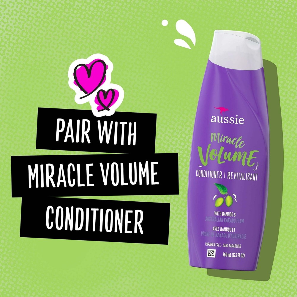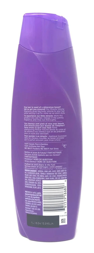 Aussie For Fine Hair, Paraben-free, W/Plum & Bamboo, Miracle Volume Shampoo, 12.1 Ounce (Pack Of 2) NEXT LEVEL VOLUME. Add a little extra oomph to your 'do. Kakadu plum- and bamboo-infused Aussie Miracle Volume Shampoo adds body that gives your hair style lift off. And the scent? Those citrusy bright notes with a hint of florals and ocean are enough to have your head in the clouds. This big body volumizing shampoo, with a touch of Australian Aloe, Jojoba Oil and Sea Kelp, is sure to add some oomph to your do. 24 hour lightweight body. About this item Aussie Miracle moist Shampoo and Conditioner Set Helps moisturize and clean your hair as it soaks your locks in mega-hydration. Infused with avocado and jojoba oil, this amazingly rich shampoo Helps get rid of dull and dry hair leaving you with a delicious scent of luscious citrus. Apply on wet hair and rinse thoroughly. Soft, healthy hair is just a click away. With White Charcoal And Australian Kakadu Plum, Strips Hair Of Build-Up, Paraben Free Perfect for flat hair Infused with Cacadu Plum and bamboo Smells like citrus, floral and aquatic notes Free of parabens & stress The lightweight formula is infused with Cacadu plum and bamboo and easily absorbs into strands for the right amount of softness with over-the-top body. PERFECT FOR flat hair USE IT TO cleanse hair and add height INFUSED WITH Kakadu plum and bamboo SMELLS LIKE citrus, floral and aquatic notes FREE OF parabens & stress Ingredients Water, Sodium Lauryl Sulfate, Sodium Laureth Sulfate, Cocamidopropyl Betaine, Terminalia Ferdinandiana Fruit Extract, Bambusa Vulgaris Shoot Extract, Vitis Vinifera (Grape) Seed Extract, Fragrance/Parfum, Sodium Citrate, Sodium Xylenesulfonate, Sodium Chloride, Citric Acid, Sodium Benzoate, Hydroxypropyl Methylcellulose, Tetrasodium EDTA, Methylchloroisothiazolinone, Methylisothiazolinone, Yellow 5, Red 33.
