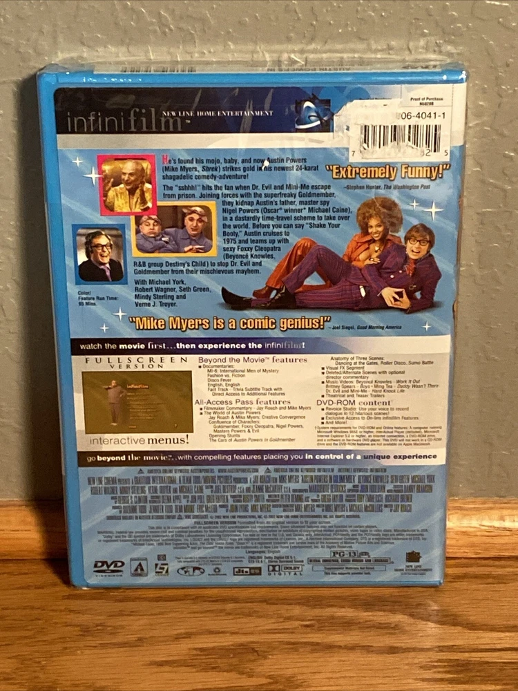 Get ready to laugh out loud with Austin Powers in Goldmember, the hilarious movie that will keep you entertained from start to finish. This DVD is brand new and features a full frame Infinifilm series. Starring Mike Myers and Beyonce Knowles, this comedy movie is a cult classic that you can't miss. With an aspect ratio of 4:3 and a rating of PG-13, this DVD is perfect for the whole family. The movie is in English and includes subtitles in French and Spanish. The special features include a behind-the-scenes featurette that will give you an insight into the making of this iconic movie. Don't forget to add this gem to your collection and enjoy the laughs!