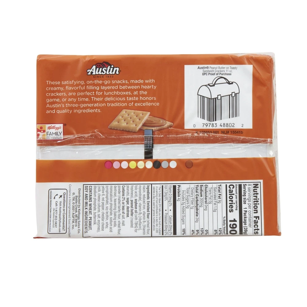 Austin Sandwich Crackers, Single Serve Snack Crackers, Office and Kids Snacks, Peanut Butter on Toasty (12 Trays, 96 Packs) Made with quality ingredients, Austin Peanut Butter on Toasty sandwich crackers are a tasty, peanut butter filled treat for both kids and adults Delicious and creamy real peanut butter filling layered between crispy sandwich crackers for a satisfying salty snack experience Made with real peanut butter; Kosher Dairy; Contains wheat, peanut, soy, and milk ingredients Stock your home pantry, keep on hand at the office, and stow in a lunchbox, backpack, or tote bag; A travel-ready food Includes 12, 11oz trays each containing eight, 1.38oz sandwich cracker packs; 96 individual packs total; Packaged for freshness and great taste Add a flavorful boost to any snacking occasion with Austin Peanut Butter on Toasty sandwich crackers. These crispy, peanut buttery sandwich crackers are made with an irresistible creamy filling, the crave-able taste of peanut butter, and a sprinkle of salt. Austin Peanut Butter on Toasty sandwich crackers provide snacking satisfaction for any occasion, whether you're just hanging out around the house or preparing to head out for an exciting excursion like an outdoor concert; or take one along while you're hiking or camping or grab a pack for game time. Our crackers are conveniently packaged to fit your non-stop lifestyle, making it easier than ever to pack a snack for all kinds of busy, on-the-go moments. Feel free to add some crackers to a packed lunch, stash them in your tote for a well-deserved break at work, enjoy them during a long commute, or as an effortless snack while running errands. Shipping We offer FREE shipping on all orders! We ship within Three business days of payment, usually sooner. We use a selection of shipping services such as UPS, FedEx, USPS etc. We only ship to the lower 48 states, no APO/FPO addresses or PO Boxes allowed. Local pickups and combined shipping options are not provided at this time. Return You can return a product for up to 30 days from the date you purchased it ONLY if it's in the original condition. The product cannot be used or open. Any product you return must be in the exact same condition you received it and in the original packaging. Please keep the receipt. Feedback Customer satisfaction is very important to us. If you have any problem with your order, please contact us and we will do our best to make you satisfied. Contact Us If you have any queries, please contact us via ebay. We usually respond within 24 hours on weekdays. Please visit our eBay store to check out other items for sale! Thank you for shopping at our store.