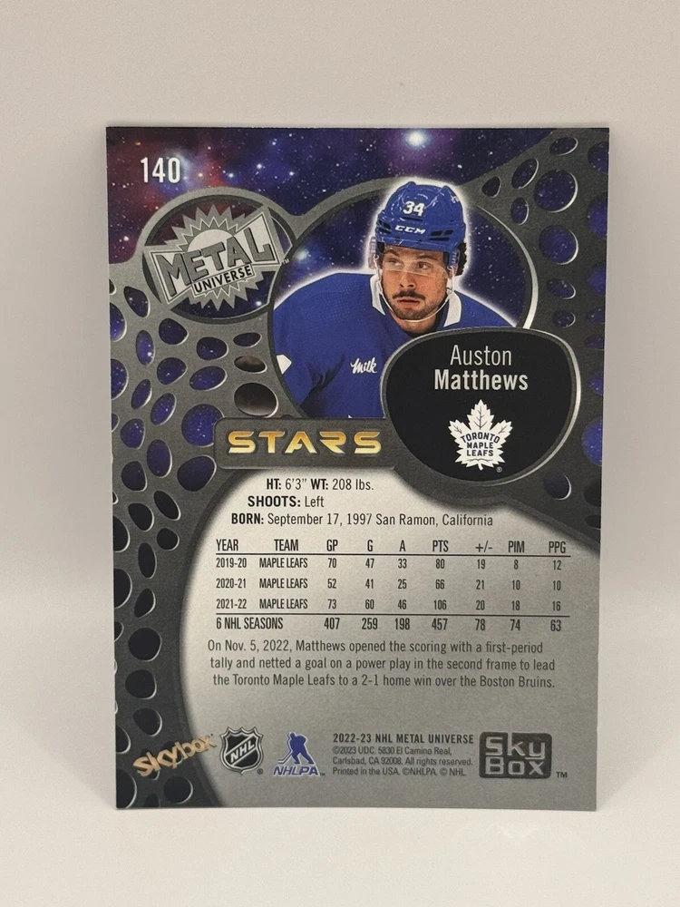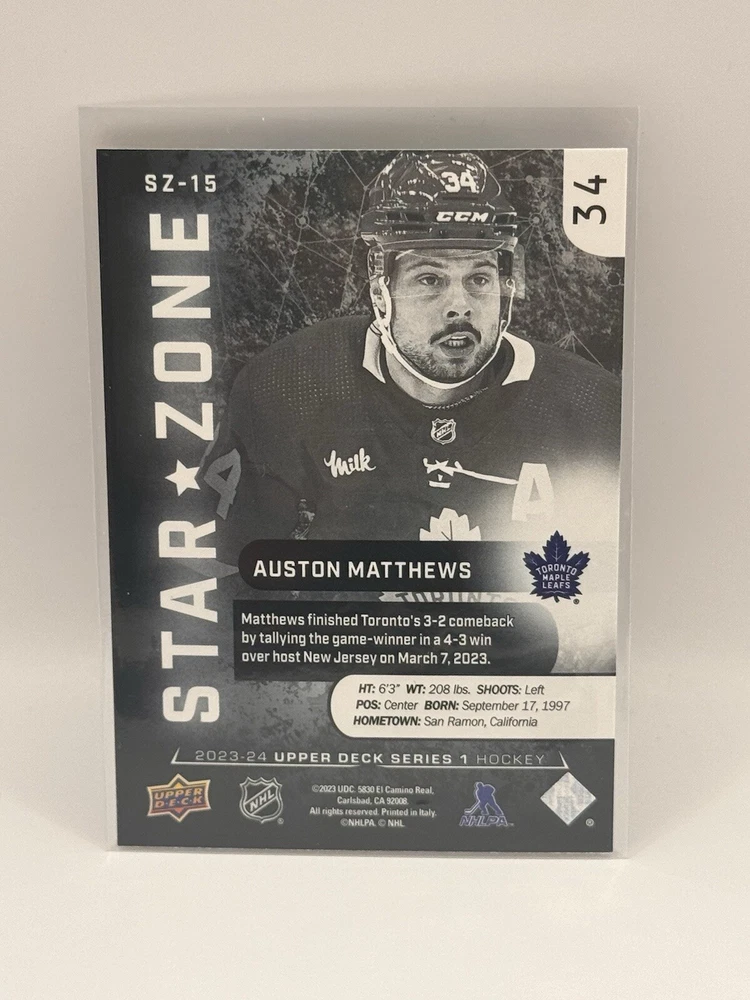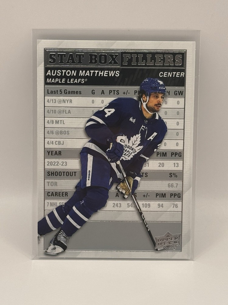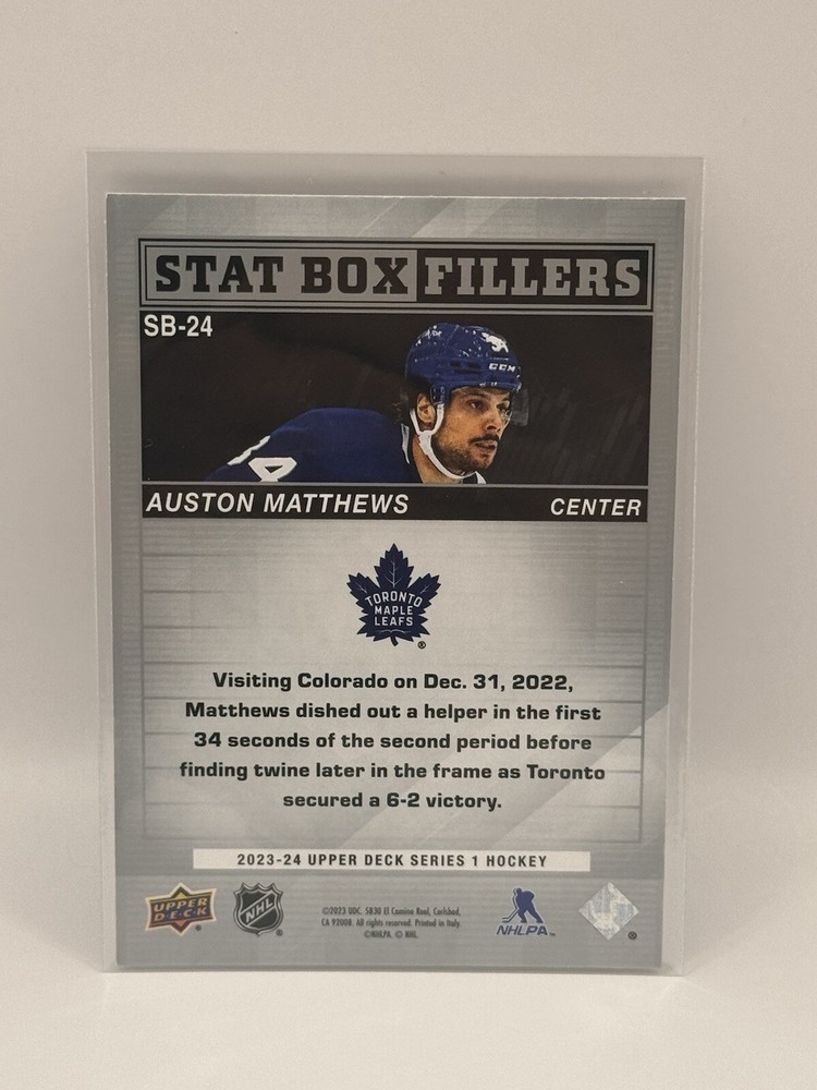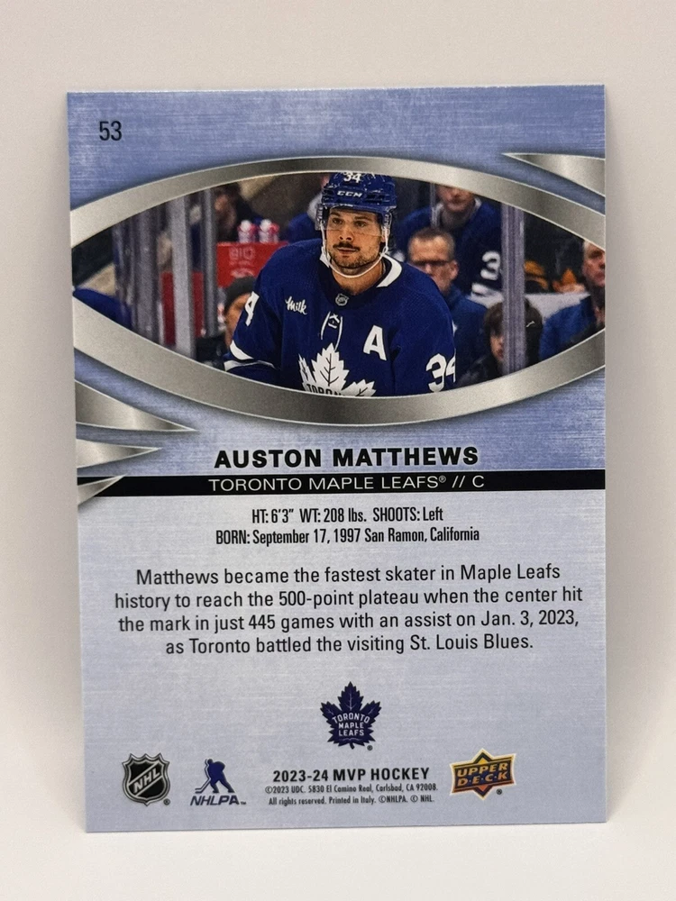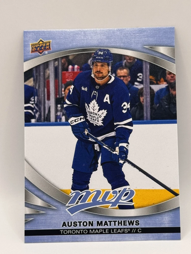 Country of Origin:United StatesSport:Ice HockeyAutograph Authentication:Upper DeckTeam:Toronto Maple LeafsMaterial:MetalSeason:2022-23, 2023-24League:National Hockey League (NHL)Card Size:StandardType:Sports Trading CardFeatures:Insert, Base SetPlayer/Athlete:Auston MatthewsOriginal/Licensed Reprint:OriginalManufacturer:upper deck, skyboxNumber of Cards:11Vintage:No