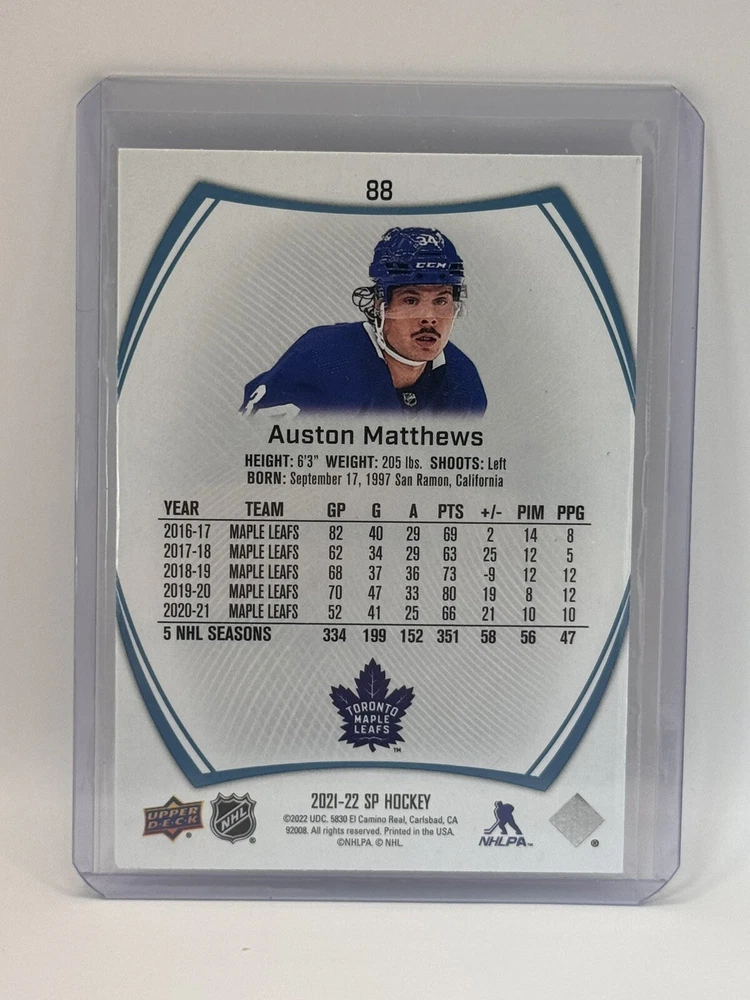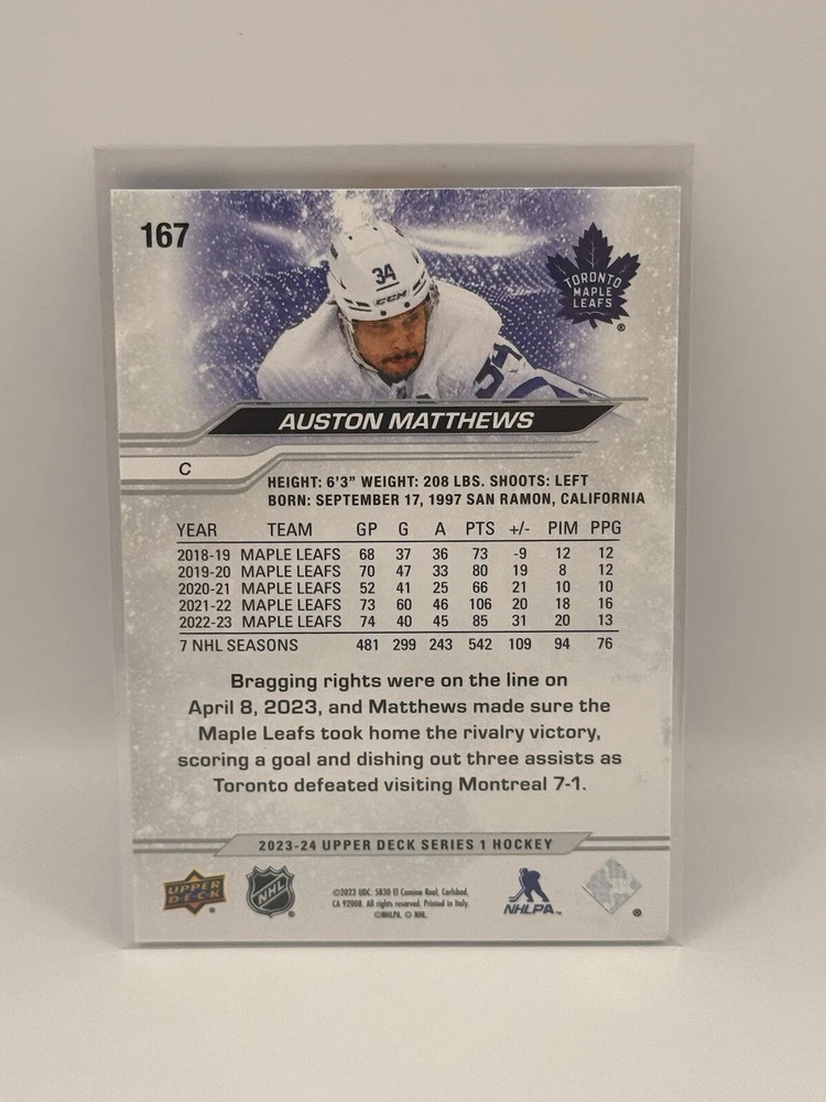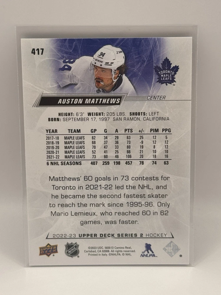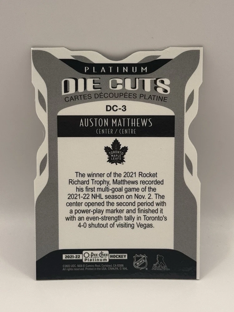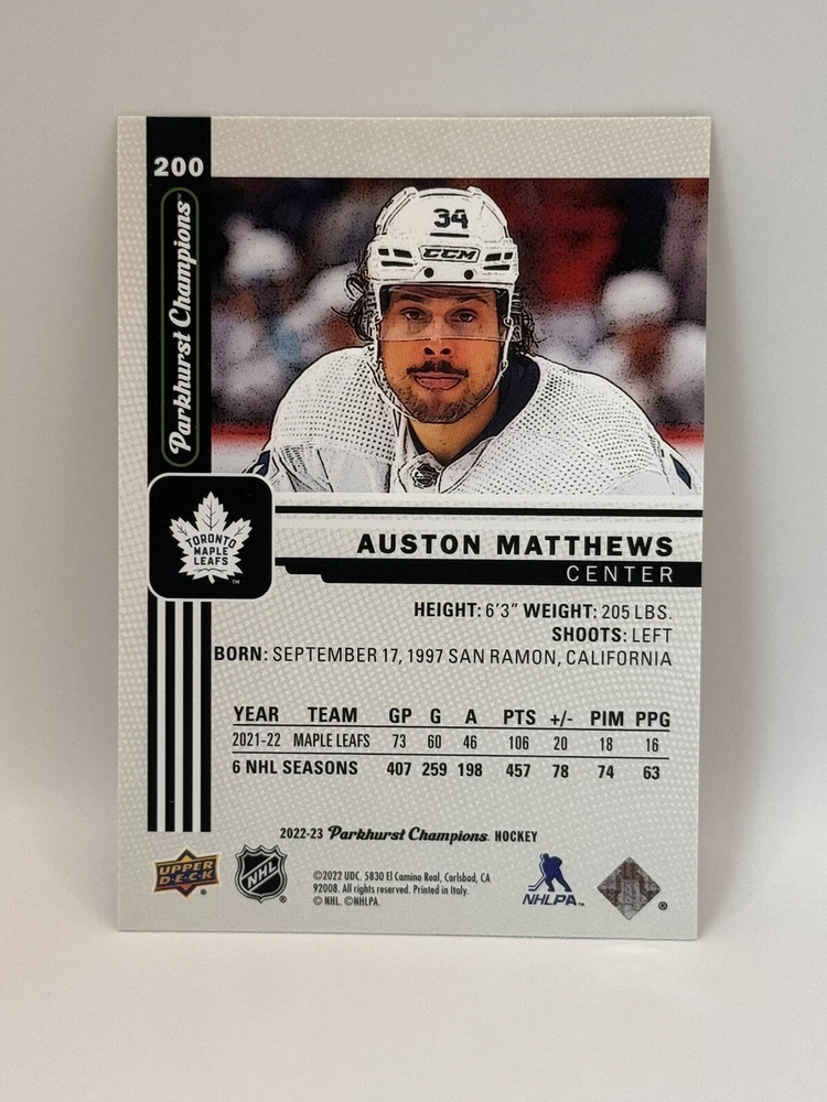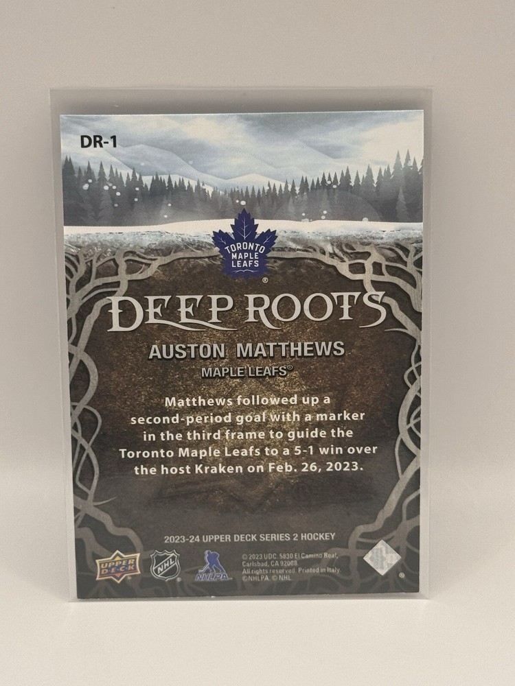 Country of Origin:United StatesSport:Ice HockeyAutograph Authentication:Upper DeckTeam:Toronto Maple LeafsMaterial:MetalSeason:2022-23, 2023-24League:National Hockey League (NHL)Card Size:StandardType:Sports Trading CardFeatures:Insert, Base SetPlayer/Athlete:Auston MatthewsOriginal/Licensed Reprint:OriginalManufacturer:upper deck, skyboxNumber of Cards:11Vintage:No