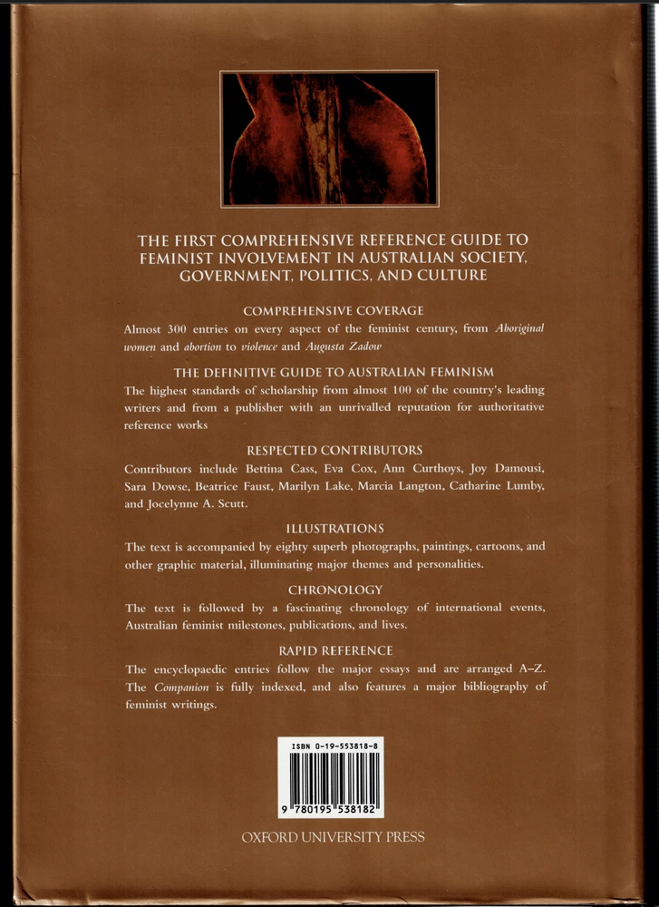 Australian Feminism - A Companion ; Barbara Caine editor - Oxford Hardcover Book Australian Feminism - A Companion ; Barbara Caine editor - Oxford Hardcover Book This copy is in VERY GOOD used condition overall. The dust-jacket has light wear. The boards and binding are in excellent order. There is a small name stamped on the first, free endpaper. The pages DO NOT have any marking of text. Click here to visit PATRICK ANDREAS QUALITY BOOKS Store Home Page . Listing and template services provided by inkFrog