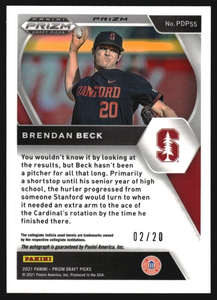 2021 Panini Prizm DP Base Autographs Prizms Neon Orange #55 Brendan Beck/20 Front Back Sport: Baseball Set: 2021 Panini Prizm Draft Picks Base Autographs Prizms Neon Orange Year: 2021 Item#: 55 Player: Brendan Beck Attributes: Autograph, Serial Numbered Brand: Panini Prizm Draft Picks Manufacturer: Panini Group Grading Company: Raw Grade SetType: Parallel Insert Item Condition: Near Mint/Mint 2014 Beckett Collectibles, LLC. All Rights Reserved Powered by: Thank you for choosing Burbank Sportscards, the sports cards superstore. We offer a large selection of singles across all sports. Visit our ebay store to view all our items available. Our Shipping Policy We offer Free Standard Shipping to all Domestic customers. Options for Expedited shipping are also available at checkout. For our international customers, shipping is $9.99 for the first item, and $0.25 for each additional item. Note to all customers: To qualify for combines shipping, we ask our customers to add items into the shopping cart. Please note, we do not combine orders that are placed separately. Our Service: Generally, our turnaround is super quick as we process and send out orders same day payment is received. Stock Availability: We do our best to ensure all items are in stock; however, in case of the rare stock out, the customer will have the option for a replacement card, or we will process a refund so the order is not held up. Our Images: Many of our images are stock photos from Beckett archives. They are a representation of the actual card you would receive. If you have any questions regarding the item you're interested in, please feel free to ask (serial numbers and relic pieces may vary) Moreover, in a case of a wrong or defective photo, please notify us, so we can adjust it. Other FAQ's: -When buying multiple cards, do you top load each item? No; however, we do try to insure all items are shipped securely. If you wish to have all of your cards top loaded it is a paid service and can be arranged. Please email for more details. For other questions, please feel free to ask. Thank you.