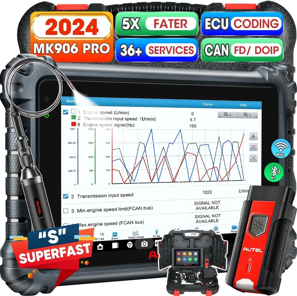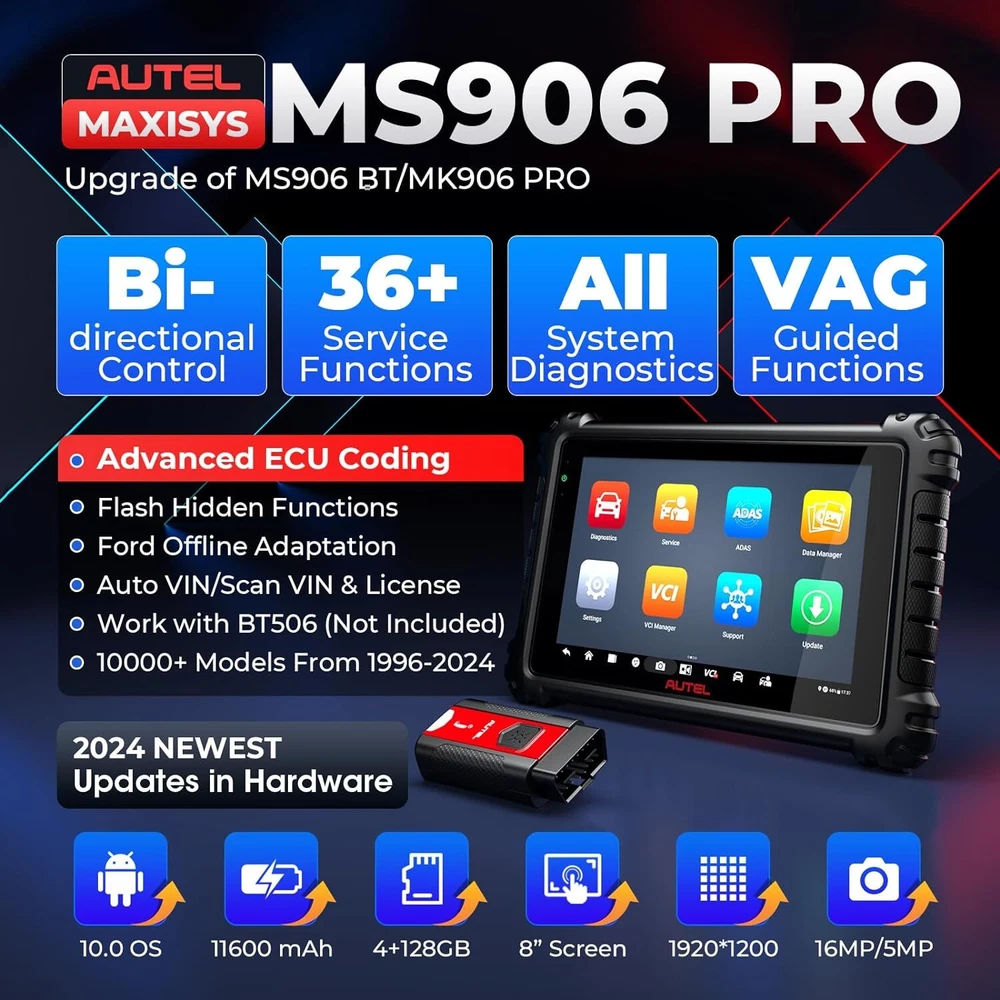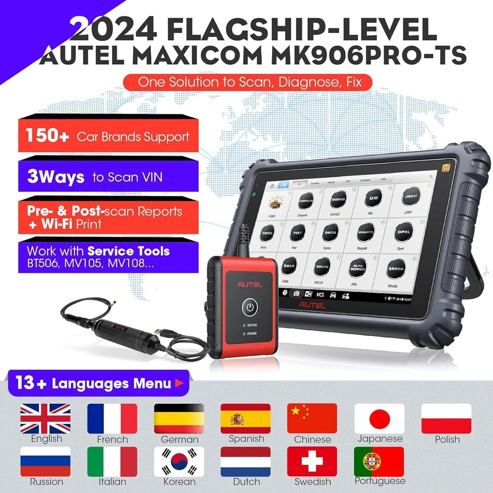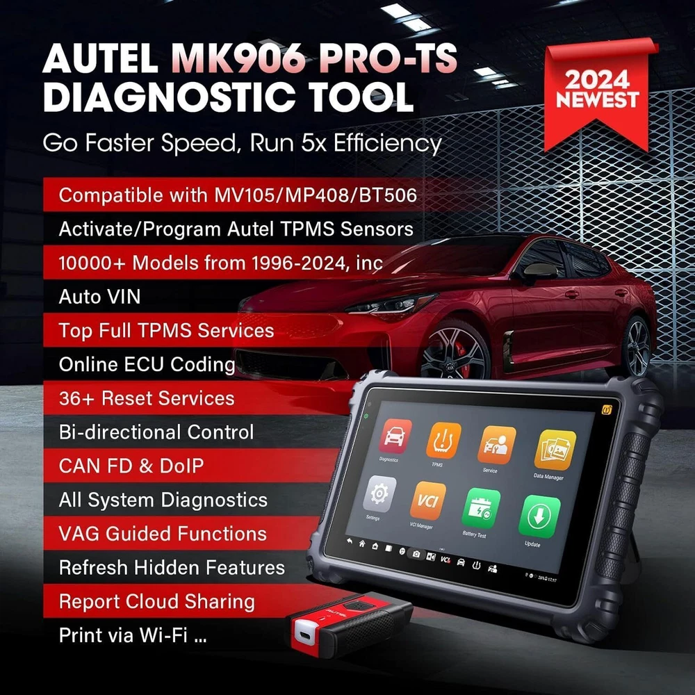 Autel Maxisys MK906 PRO-TS Full TPMS Car Diagnostic Scanner Tool Key Coding 2024 Autel MaxiCOM MK906 Pro-TS Scanner: 2024 Updated of MaxiSYS MS906 Pro-TS MS906TS with CAN FD/DoIP, ECU Coding, Full TPMS, Bidirectional Control, 36+ Service, Full Diagnose, WiFi Print, Auto Scan 2.0 ✅ Note:Multiple package options,pls choose what you want! Package option 1 : MS906PRO+MV108S ($1139) Package option 2 : MK906PRO+MV108S ($1139) Package option 3 : MK906PRO-TS+MV108S ($1349) About this item 🚗【 Ebay Choice MK906 Pro-TS, 2024 New Ver. of MS906TS】 As Autel’s most cost-effective model, MK906 Pro-TS is the combo.of MS906 Pro TS, MK908 and enjoys OE-level service: ➊TPMS Programming, Relearn and Reset ➋ECU Coding as MS908S Pro II Elite II ➌36+ Service for 150 Makes, FCA Auto Auth, Support DoIP/CAN FD & D-PDU/RP1210 ➍Active Test ➎All System Diagnosis as Snap-on Tool ➏Refresh Hidden Features ➐Component Match & VAG Guided ➑Auto Scan 2.0 ➒Battery Test ➓5X Faster, Android 11. 【 36+ HOT Services for 99% Cars 】Built to Autel’s usual high standards as automotive diagnostic scanners MS906BT, MS906TS, MS906PRO-TS, MK908 that you’re familiar with, MK906PRO TS boasts of ever-smooth processing to boost productivity thanks to the level-up core settings. It expands to 36+ service functions: TPMS, oil/EPB/SAS, injector coding, BMS, etc. and proved to be available for 99% mainstream car models based on 1000+ filed testing results. 【Advanced ECU Coding as MS908, MK908P 】Autel scanner MK906PRO-TS shares ECU Coding as MS908Pro/Elite/snap on tools to put factory-level power in your hands to break rules of a commercial-grade scanners can do: setup new ECU modules, fix complex ECU-controlled issues, compatible with VW, Skoda, Ford, BMW, Porsche, Infiniti, Hyundai … (online or offline). Rivals factory scan tools, but costs much less! 【 A Pro TPMS Tool for Tire Shops 】The top-notch combo of ALL Autel TPMS tools’s capabilities of TS408/501/508/601/608 combining with ALL pro features of MaxiSys & MaxiCOM scanners: MS906PRO, MS906TS, MS906BT, MP808TS, MK808TS, MS906, MP808, MK808 … this MK906PRO-TS is the second-to-none 2024 Autel scanner that handles all TPMS issues: Switch Off TPMS Light, 3000+ Relearn Guide, Activates/Reads All Sensors, Copy by OBD & Activation, Auto Create 1-16 Sensors, Manual Create, etc. 【All System Diagnosis + Active Test + FCA Access 】Autel keeps challenging the way of diagnostics to achieve optimal performance by integrating Bypass SGW in 2017+ FCA, OE-Level All System Diagnostics and Bi-directional Active Tests into this diagnostic tool MK906PRO, packing all factory-tool features needed with a fraction of the cost. Better, this Autel scanner lays out data the same way an OE scan tool does; a breeze to operate if you’re familiar with this setup logic. 【 2024 10+ Top Functions, Deserve Every Penny 】Equipped with ultra-level hardware, this all systems OBD2 scanner car code reader competes with OE-manufactured diagnostic tools with following 10+ top functions: Component Matching, Online Account Login, VAG Guided Functions, Power Balance, Refresh Hidden Features, Scan VIN/License and even IMMO Keys on many makes and models, for you to be more proficient at maintaining & repairing. It can work with BT506, MV105/108, MP408 to expand features. Product Description 2024 MK906PRO-TS COMPLETE TPMS WITH ALL-IN-ONE DIAGNOSTICS Car Diagnostics & TPMS in One Premium Tool Want to stay connected in the always-changing automotive world? Check out Autel who is introducing the 2024 new line of MaxiCOM diagnostic tools for your business that has never been greater! Take a look at the ultra-level features below to learn about the ALL-New MK906PRO-TS: Enhanced AutoVIN & AutoScan, PreSCAN & PostSCAN, VIN Scan (scan license/plate/VIN) for faster work process. 10+ High-end Functions: VAG Guided Function, FCA AutoAuth Access, Component Matching, Online Account Login Service, etc. VCI200 box supports CANFD, and DOIP protocols, also serves as a wireless VCI. 36+ service functions with more frequent updates to support more vehicles. OE-Level All System Diagnostics to read/clear codes for all available systems Bi-directional Scan Tool runs Active Tests to test car components on demand; Advanced Online ECU Coding & Adaptations brings more personal settings. Pro-TPMS Tool to Fix 99% TPMS Problems Overall by TPMS function: MK906PRO-TS > MS906TS > TS608 > MP808TS > MK808TS Activate 99% TPMS sensors and read sensor status; Diagnose ECU for complete TPMS health check; Program MX-Sensors in 4 ways; On-tool 3000+ relearn procedure and wide OBD relearn coverage, Access to retrofitted-TPMS system … Overall by function: MS906 Pro-TS = MK908 = MS908 = MS908S Pro > Elite = MS906TS > MS906 > MP808TS > MK808TS 2024 MK906PRO-TS COMPLETE TPMS WITH ALL-IN-ONE DIAGNOSTICS Essential TPMS Service Tool in Your Toolbox Equivalent to car tool MS906PRO +tire monitoring system diag TS601, the Autel MK906PRO-TS is a great combination of an ultra-level automotive scanner + TPMS service tool. If you are after a car computer that can also be a professional TPMS expert to activate OE & OEM sensors with built-in relearn procedures, program Autel MX-sensors, turn off TPMS light, and retrieves the sensors’ OEM part No … then this scan tool will do just that. equipped vehicle coverage: well-suited to mechanics in auto repair shops working on a wide range of cars. Powerful TPMS Activation Tool: activate all kinds of OEM & universal 315MHz + 433MHz sensors on the market. Effective TPMS Relearn Tool: easy automatic, stationary or OBDII relearn with 3000+ built-in TPMS relearn guidance. Autel MX-Sensor Programming Tool: get access to, copy old sensor ID, and write data into MX-Sensors; 4 programming ways: Copy by Activation; Copy by Manual Input; Auto Create 1-16 in batch; Copy by OBD. At-A-Glance TPMS Status Screen: display all sensors’ pressure, temperature, battery life, and sensor/ECU data to quickly 