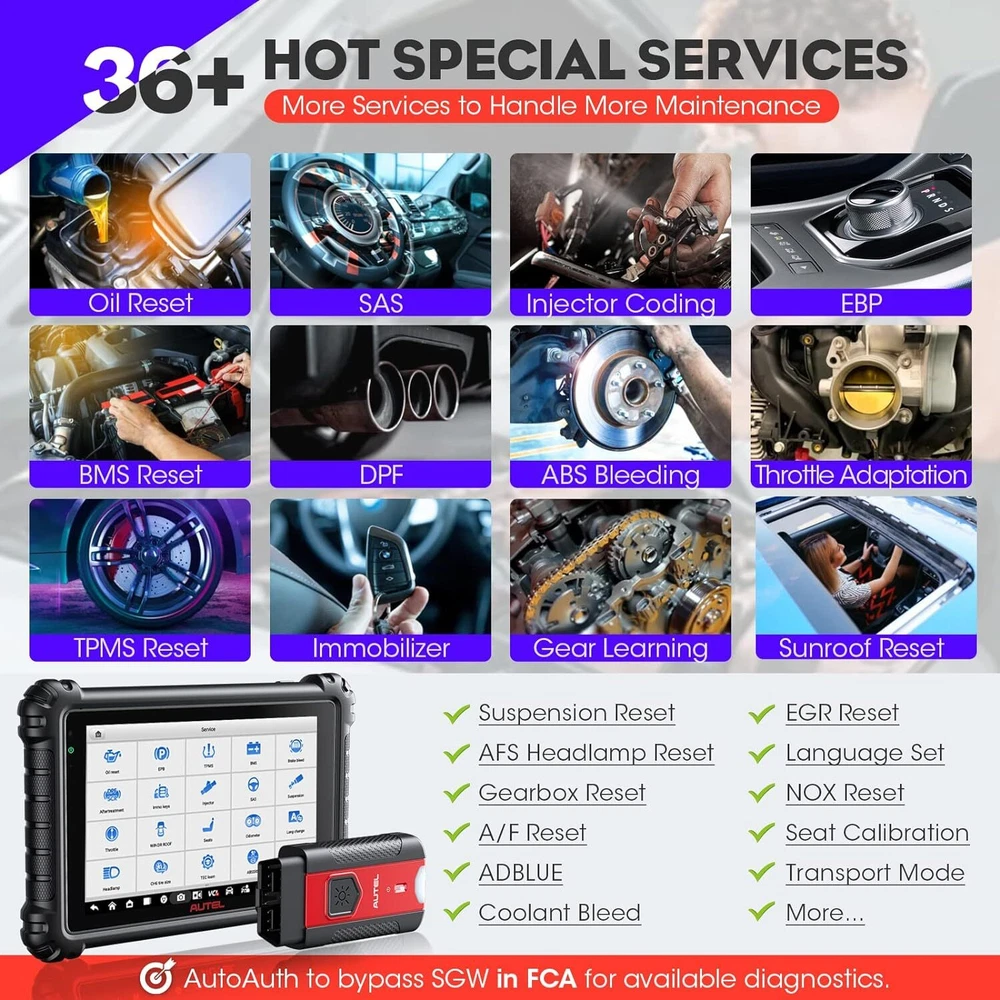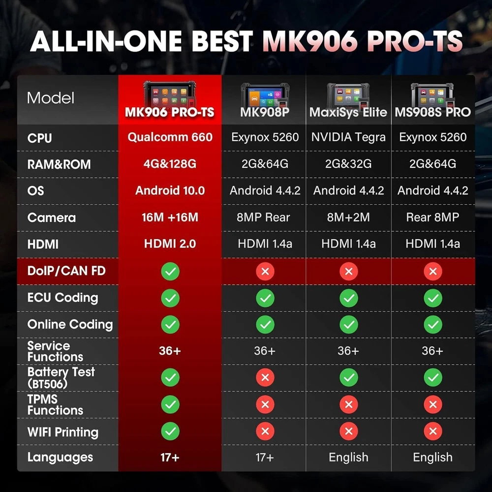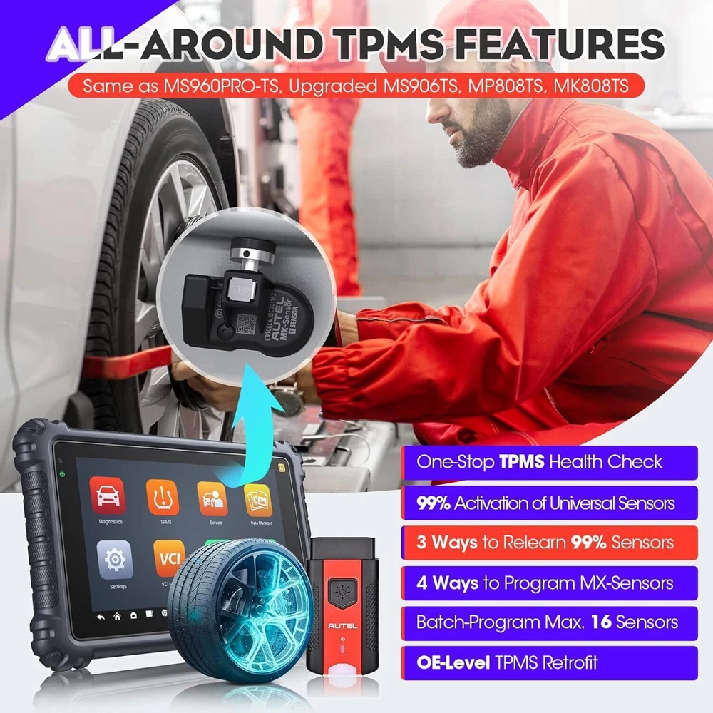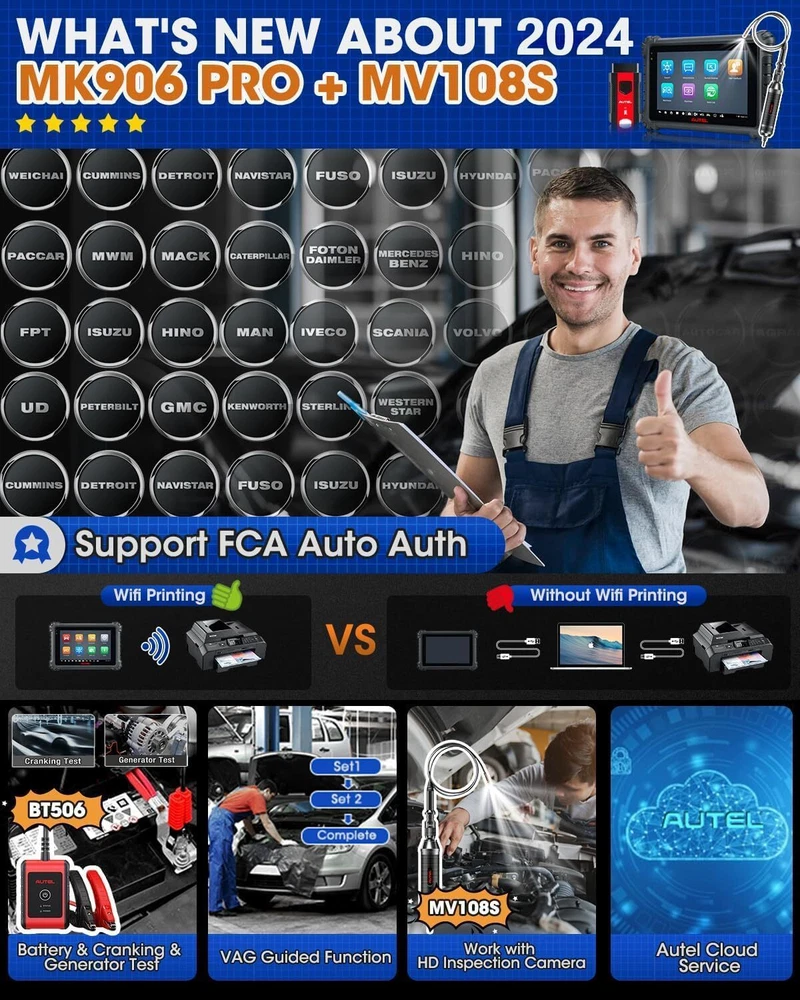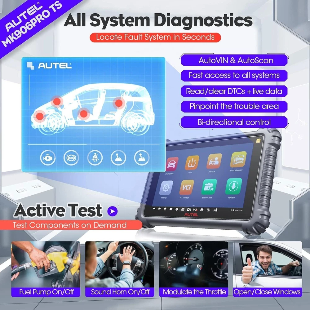 Autel Maxisys MK906 PRO-TS Full TPMS Car Diagnostic Scanner Tool Key Coding 2024 Autel MaxiCOM MK906 Pro-TS Scanner: 2024 Updated of MaxiSYS MS906 Pro-TS MS906TS with CAN FD/DoIP, ECU Coding, Full TPMS, Bidirectional Control, 36+ Service, Full Diagnose, WiFi Print, Auto Scan 2.0 ✅ Note:Multiple package options,pls choose what you want! Package option 1 : MS906PRO+MV108S ($1139) Package option 2 : MK906PRO+MV108S ($1139) Package option 3 : MK906PRO-TS+MV108S ($1349) About this item 🚗【 Ebay Choice MK906 Pro-TS, 2024 New Ver. of MS906TS】 As Autel’s most cost-effective model, MK906 Pro-TS is the combo.of MS906 Pro TS, MK908 and enjoys OE-level service: ➊TPMS Programming, Relearn and Reset ➋ECU Coding as MS908S Pro II Elite II ➌36+ Service for 150 Makes, FCA Auto Auth, Support DoIP/CAN FD & D-PDU/RP1210 ➍Active Test ➎All System Diagnosis as Snap-on Tool ➏Refresh Hidden Features ➐Component Match & VAG Guided ➑Auto Scan 2.0 ➒Battery Test ➓5X Faster, Android 11. 【 36+ HOT Services for 99% Cars 】Built to Autel’s usual high standards as automotive diagnostic scanners MS906BT, MS906TS, MS906PRO-TS, MK908 that you’re familiar with, MK906PRO TS boasts of ever-smooth processing to boost productivity thanks to the level-up core settings. It expands to 36+ service functions: TPMS, oil/EPB/SAS, injector coding, BMS, etc. and proved to be available for 99% mainstream car models based on 1000+ filed testing results. 【Advanced ECU Coding as MS908, MK908P 】Autel scanner MK906PRO-TS shares ECU Coding as MS908Pro/Elite/snap on tools to put factory-level power in your hands to break rules of a commercial-grade scanners can do: setup new ECU modules, fix complex ECU-controlled issues, compatible with VW, Skoda, Ford, BMW, Porsche, Infiniti, Hyundai … (online or offline). Rivals factory scan tools, but costs much less! 【 A Pro TPMS Tool for Tire Shops 】The top-notch combo of ALL Autel TPMS tools’s capabilities of TS408/501/508/601/608 combining with ALL pro features of MaxiSys & MaxiCOM scanners: MS906PRO, MS906TS, MS906BT, MP808TS, MK808TS, MS906, MP808, MK808 … this MK906PRO-TS is the second-to-none 2024 Autel scanner that handles all TPMS issues: Switch Off TPMS Light, 3000+ Relearn Guide, Activates/Reads All Sensors, Copy by OBD & Activation, Auto Create 1-16 Sensors, Manual Create, etc. 【All System Diagnosis + Active Test + FCA Access 】Autel keeps challenging the way of diagnostics to achieve optimal performance by integrating Bypass SGW in 2017+ FCA, OE-Level All System Diagnostics and Bi-directional Active Tests into this diagnostic tool MK906PRO, packing all factory-tool features needed with a fraction of the cost. Better, this Autel scanner lays out data the same way an OE scan tool does; a breeze to operate if you’re familiar with this setup logic. 【 2024 10+ Top Functions, Deserve Every Penny 】Equipped with ultra-level hardware, this all systems OBD2 scanner car code reader competes with OE-manufactured diagnostic tools with following 10+ top functions: Component Matching, Online Account Login, VAG Guided Functions, Power Balance, Refresh Hidden Features, Scan VIN/License and even IMMO Keys on many makes and models, for you to be more proficient at maintaining & repairing. It can work with BT506, MV105/108, MP408 to expand features. Product Description 2024 MK906PRO-TS COMPLETE TPMS WITH ALL-IN-ONE DIAGNOSTICS Car Diagnostics & TPMS in One Premium Tool Want to stay connected in the always-changing automotive world? Check out Autel who is introducing the 2024 new line of MaxiCOM diagnostic tools for your business that has never been greater! Take a look at the ultra-level features below to learn about the ALL-New MK906PRO-TS: Enhanced AutoVIN & AutoScan, PreSCAN & PostSCAN, VIN Scan (scan license/plate/VIN) for faster work process. 10+ High-end Functions: VAG Guided Function, FCA AutoAuth Access, Component Matching, Online Account Login Service, etc. VCI200 box supports CANFD, and DOIP protocols, also serves as a wireless VCI. 36+ service functions with more frequent updates to support more vehicles. OE-Level All System Diagnostics to read/clear codes for all available systems Bi-directional Scan Tool runs Active Tests to test car components on demand; Advanced Online ECU Coding & Adaptations brings more personal settings. Pro-TPMS Tool to Fix 99% TPMS Problems Overall by TPMS function: MK906PRO-TS > MS906TS > TS608 > MP808TS > MK808TS Activate 99% TPMS sensors and read sensor status; Diagnose ECU for complete TPMS health check; Program MX-Sensors in 4 ways; On-tool 3000+ relearn procedure and wide OBD relearn coverage, Access to retrofitted-TPMS system … Overall by function: MS906 Pro-TS = MK908 = MS908 = MS908S Pro > Elite = MS906TS > MS906 > MP808TS > MK808TS 2024 MK906PRO-TS COMPLETE TPMS WITH ALL-IN-ONE DIAGNOSTICS Essential TPMS Service Tool in Your Toolbox Equivalent to car tool MS906PRO +tire monitoring system diag TS601, the Autel MK906PRO-TS is a great combination of an ultra-level automotive scanner + TPMS service tool. If you are after a car computer that can also be a professional TPMS expert to activate OE & OEM sensors with built-in relearn procedures, program Autel MX-sensors, turn off TPMS light, and retrieves the sensors’ OEM part No … then this scan tool will do just that. equipped vehicle coverage: well-suited to mechanics in auto repair shops working on a wide range of cars. Powerful TPMS Activation Tool: activate all kinds of OEM & universal 315MHz + 433MHz sensors on the market. Effective TPMS Relearn Tool: easy automatic, stationary or OBDII relearn with 3000+ built-in TPMS relearn guidance. Autel MX-Sensor Programming Tool: get access to, copy old sensor ID, and write data into MX-Sensors; 4 programming ways: Copy by Activation; Copy by Manual Input; Auto Create 1-16 in batch; Copy by OBD. At-A-Glance TPMS Status Screen: display all sensors’ pressure, temperature, battery life, and sensor/ECU data to quickly 