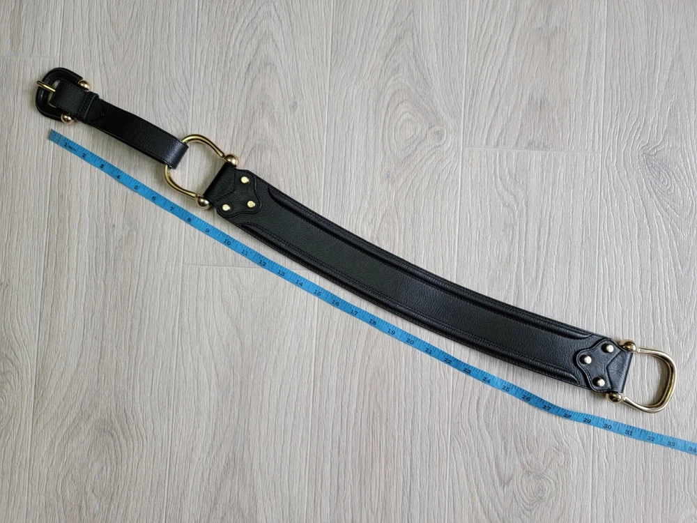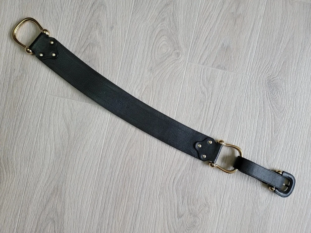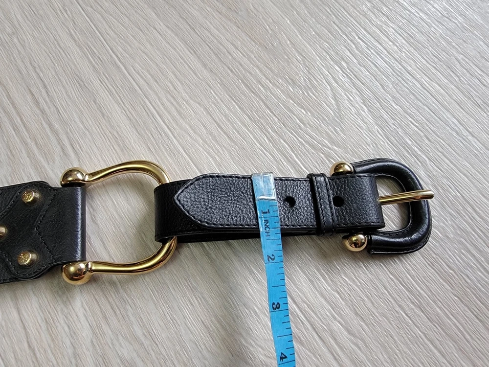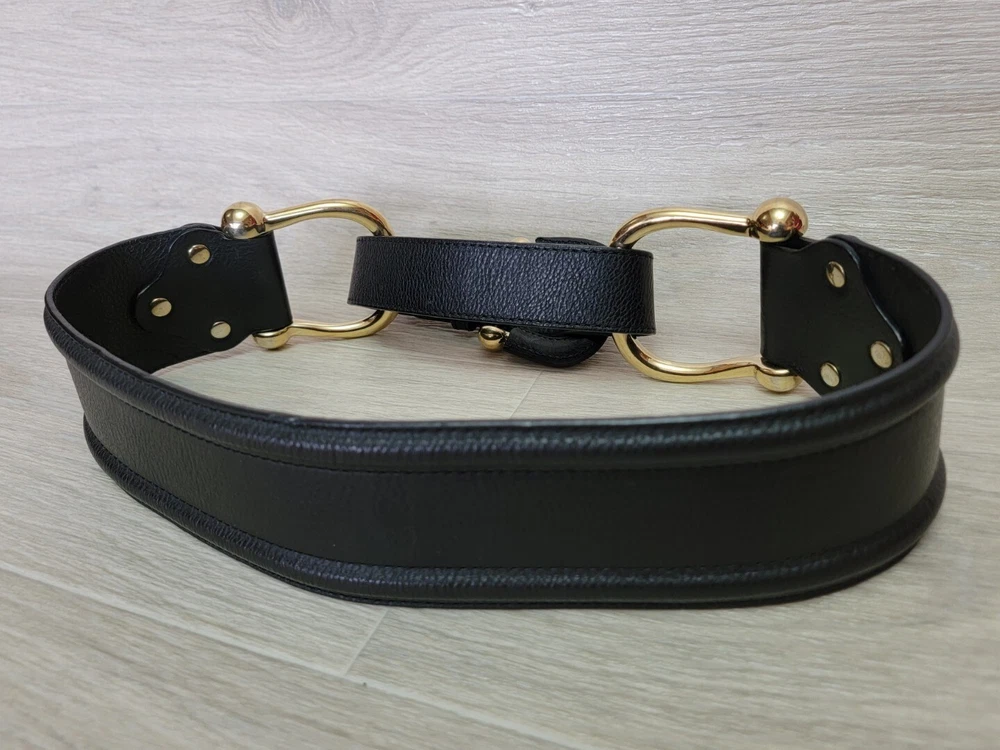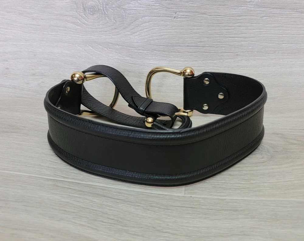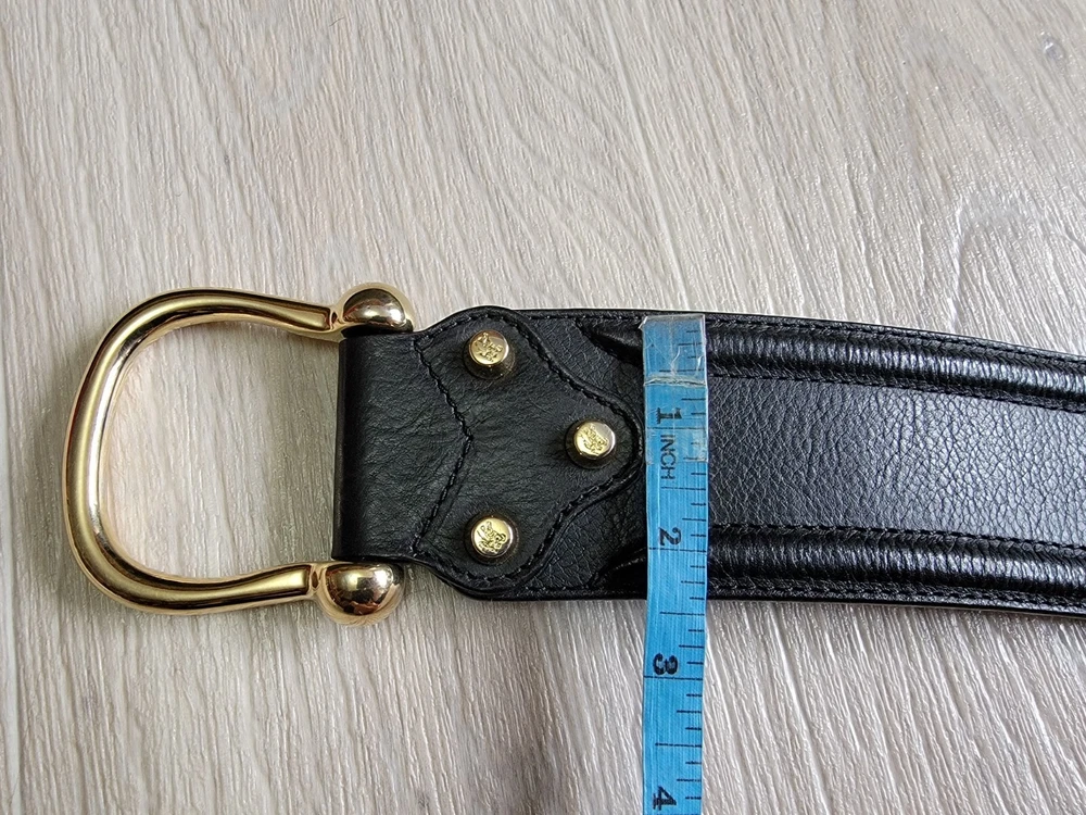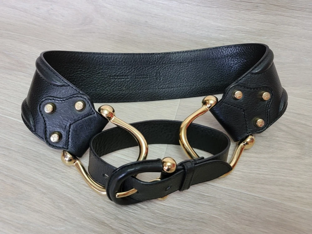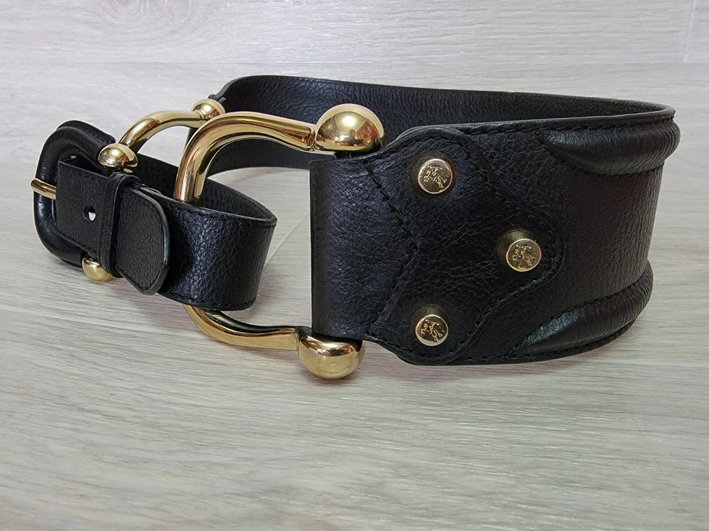 Authentic Rare Burberry Wide Waist Belt Studded Double Metal Stirrups Elements Gold Tone Black Leather Size 80 / 32 Condition: Excellent . No problem with future use. Please see all photos . Width 2.5" inches Length belt: 30.5" ~ 32" Inches Delivery ONLY Air Mail with Track Number !