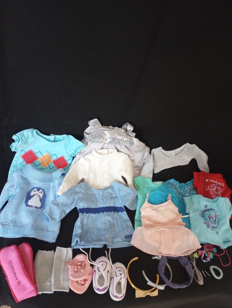 Lot of 34 prices including tops, a dress, pants, stocking, shoes and hair accessories. Some tops have little stains(Take a look at the last two pics). No holes, no other flaws. They are clean. They come from a smoke/pet free home. Sell as is.