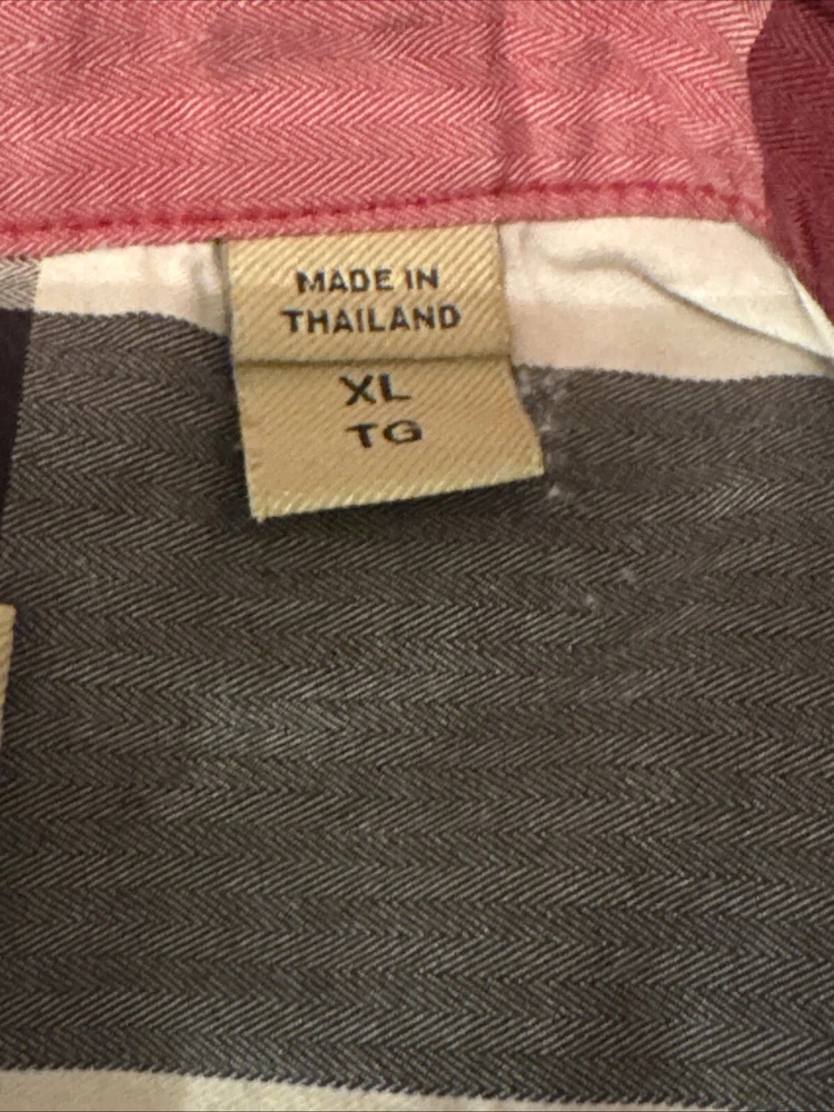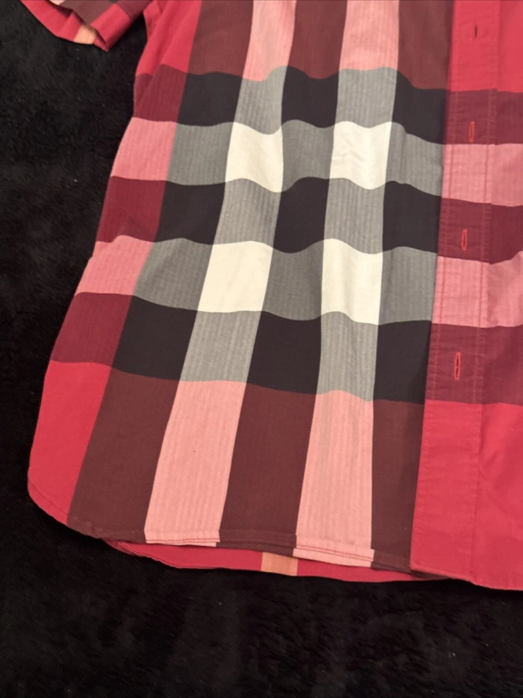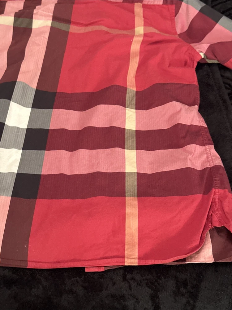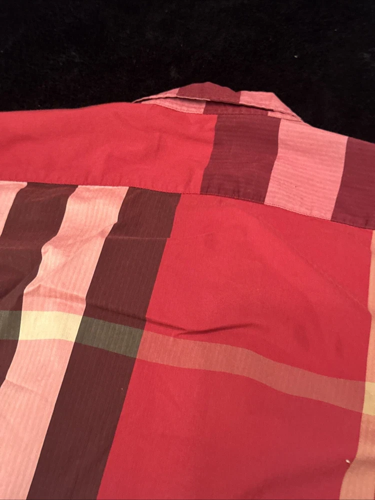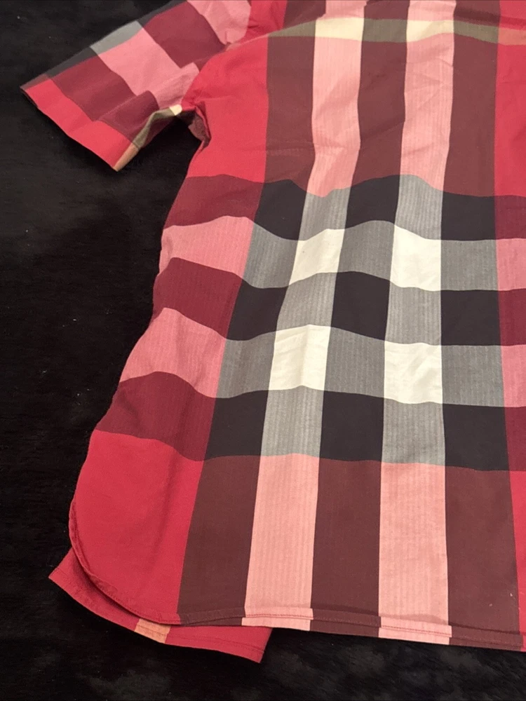This shirt was bought at Burberry Chicago. Elevate your wardrobe with this authentic Burberry London, England maroon plaid button-down shirt. This shirt features short sleeves, a collared neckline, and a button closure for a classic look. The shirt is made of 100% cotton and has a lightweight, all-season feel. It also includes pockets for added convenience. This designer shirt is perfect for both casual and business occasions. The shirt is a regular fit and is available in size XL. The shirt is part of the Burberry product line and has a classic theme. It is suitable for men and was made in the United States.