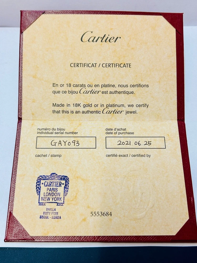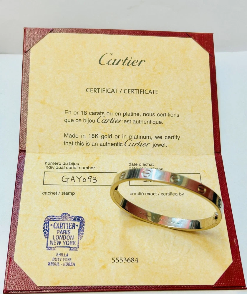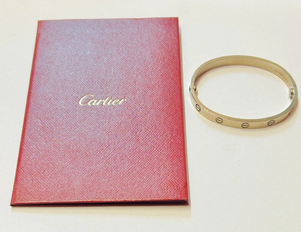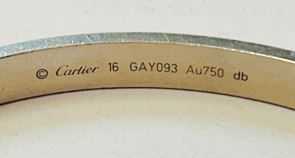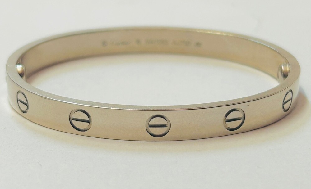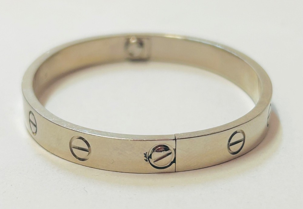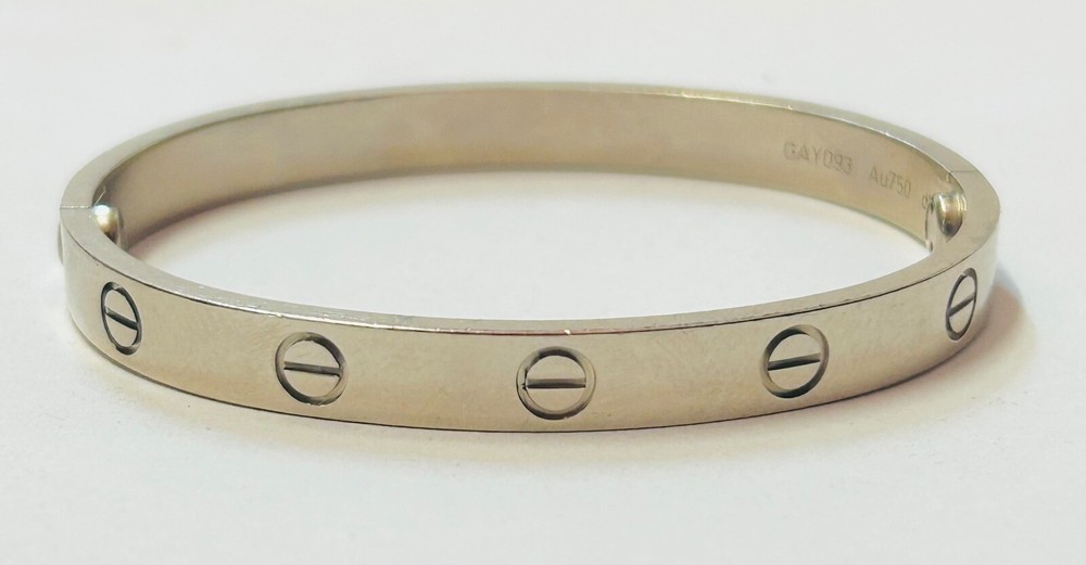 Genuine Cartier Love Bangle 18ct White Gold Size 16 w/ Papers Dated 2021 I am selling my genuine Cartier 18 carat white gold love bangle as I no longer wear it and I’m looking to move house so I need to free up some capital. It is in excellent second hand condition and was purchased in 2021 from Cartier in South Korea. The bangle is complete with its Cartier paperwork which is dated and stamped, please refer to photos. The bangle is a size 16 so please measure your own wrist size to make sure that this bangle will fit your wrist before buying it as I will not accept a return for the reason it doesn’t fit. Please refer to photos for hallmarks. It measures 6mm wide and weighs a heavy 32.1 grams of solid 18 carat white gold. It is in excellent second hand condition with no nasty scratches or dents, there are minimal signs of wear as you would expect. I have unfortunately misplaced the box which also contained the screwdriver needed to open the bracelet however I have retained the all important paperwork which confirms its authenticity. A superb iconic piece of Cartier jewellery which is sure to make a fine present for the lady in your life, or a strong addition to any collection of Cartier jewellery. OVERSEAS BUYERS PLEASE NOTE DUE TO THE VALUE OF THIS ITEM I WILL BE SHIPPING WITH FEDEX INTERNATIONAL EXPRESS AT A COST OF £69.95 I DO COMBINE POSTAGE IF MORE THAN ONE ITEM IS PURCHASED - I CHARGE THE FULL PRICE FOR THE 1ST ITEM AND THEN AN ADDITIONAL 50p PER ADDITIONAL ITEM THEREAFTER.