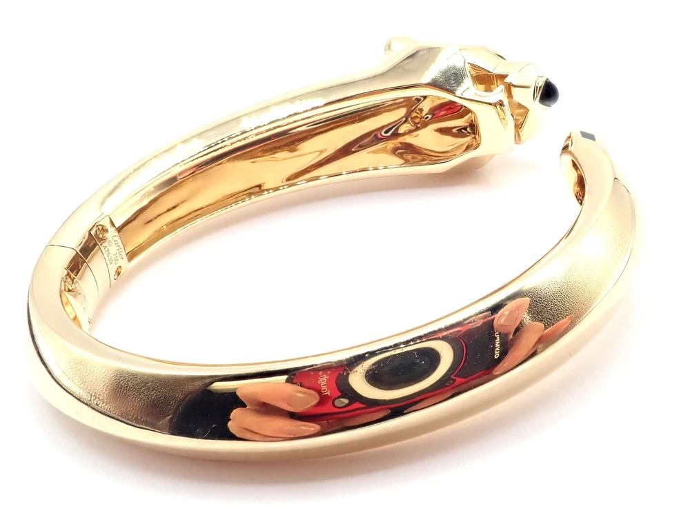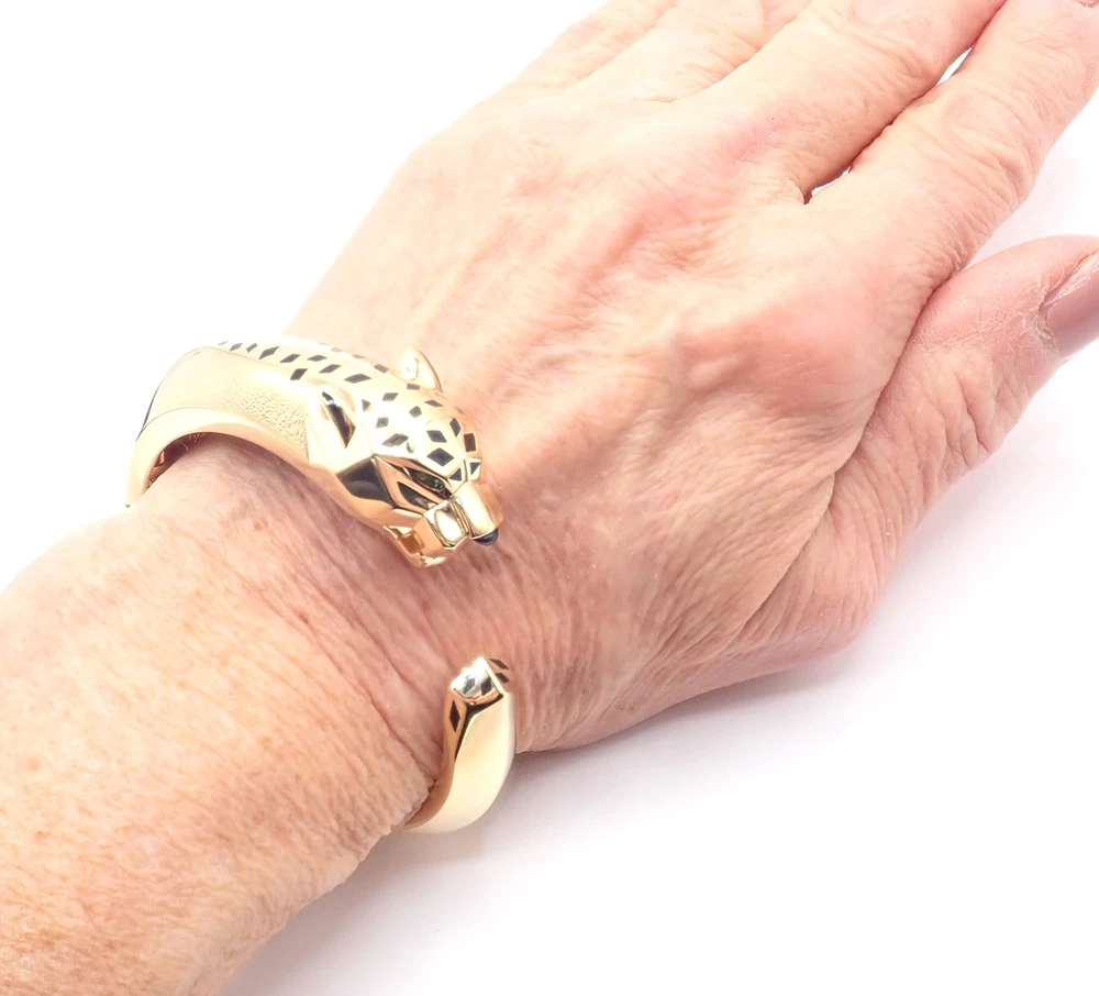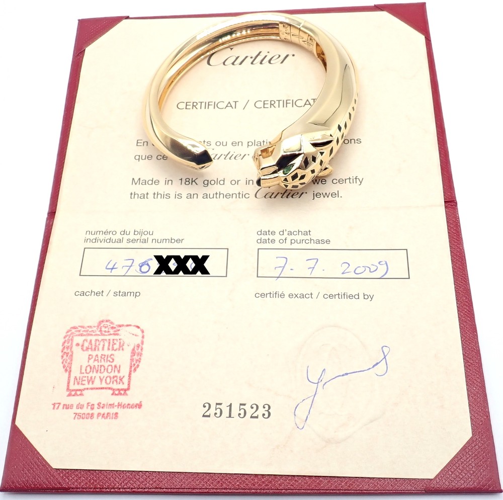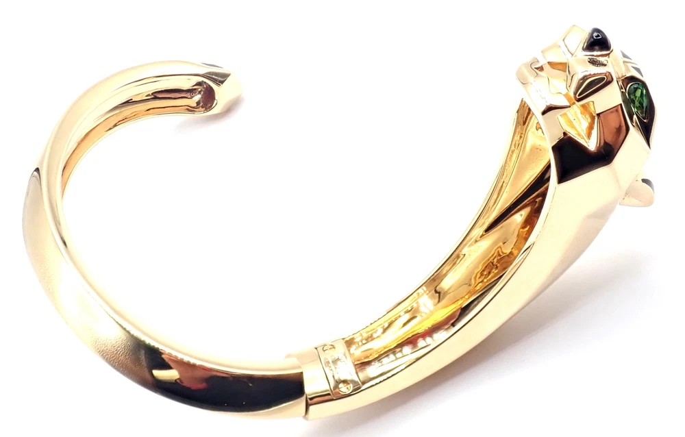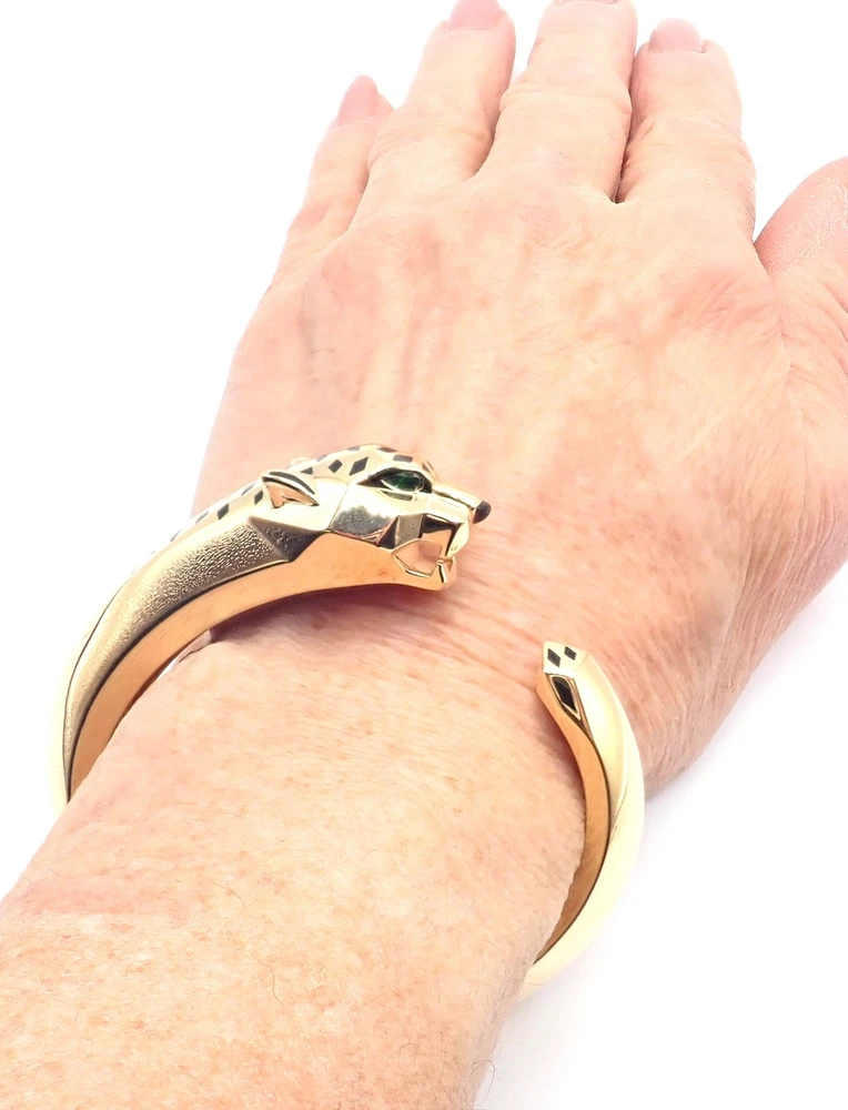 Authentic! Cartier Panther Panthere 18k Yellow Gold Bangle Bracelet Size 16 Cert Welcome to Fortrove Payment / Shipping / Returns STORE HOME About Us NEW ARRIVALS ENDING SOON Add to Favorites FEEDBACK Contact Us Authentic! Cartier Panther Panthere 18k Yellow Gold Bangle Bracelet Size 16 Cert Product Description About This Piece: The Cartier Panther Panthere bangle is a luxurious piece, crafted in 18k yellow gold. This size 16 bracelet features the iconic panther motif, a symbol of elegance and power. Its meticulous craftsmanship and sleek design embody Cartier's legendary style, making it a coveted accessory for any fashion-forward individual. This bracelet comes with certificate of authenticity from 2009 and a Cartier box. Size: 16 Fits wrists 6.25" to 6.75" Weight: 92 grams Width: Stones: From 19mm to 11mm 2 emerald eyes and a black onyx nose Hallmarks: Cartier 750 16 476XXX(serial number has been omitted) T3504onndd About Us Welcome to Fortrove, We have been providing fine estate and designer jewelry for over thirty-five years. We spent this time discovering treasures from all over the world. Originally located in Philadelphia on historic Jeweler's Row, Fortrove has expanded over the years and is now cultivated in the high end designer market to the world. We specialize in beautiful jewelry, handbags, and timepieces from around the globe. At Fortrove we believe that an artful piece of jewelry is a fine investment and wearable art. Now Fortrove is here to offer you a plethora of fine designer jewelry that is extraordinary in every way. From all of us to all of you at Fortrove. - Thank you and have an extraordinary day! Fortrove, Inc. Payment PayPal Payments Only. Buyer must have PayPal verified address. We accept Visa, MasterCard, Discover, and American Express via PayPal only. We charge 6% sales tax for sales in PA, this is applied at checkout. International Orders must pay by paypal with a high rating. Sorry No international credit cards. International law does not allow us to verify credit card holders valid address. Feel safe purchasing with FORTROVE Shipping World Wide shipping (excludes: Russia, Africa, and Indonesia) All international items are shipped via FedEx International which includes door to door tracking/signature and require phone number of destination. Returns *Returns are accepted for nearly any reason within 14 days. If you are not completely satisfied with your item please return to us for a full refund or an exchange. *Item must be in same condition as received Feedback Contact Us INFORMATION Fortrove Home Easy Payment Shipping info Returns policy FORTROVE New Arrivals Ending Soon Feedback Contact Us Newsletter Add Fortrove to your Favorites and receive my email newsletters about new items and special promotions! Subscribe Payment Options © Copyright 2023 Fortrove, Inc. All rights reserved.