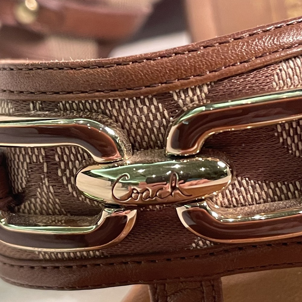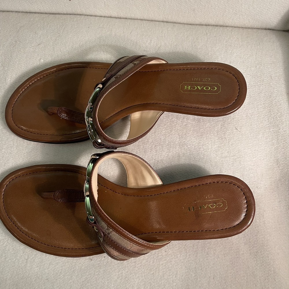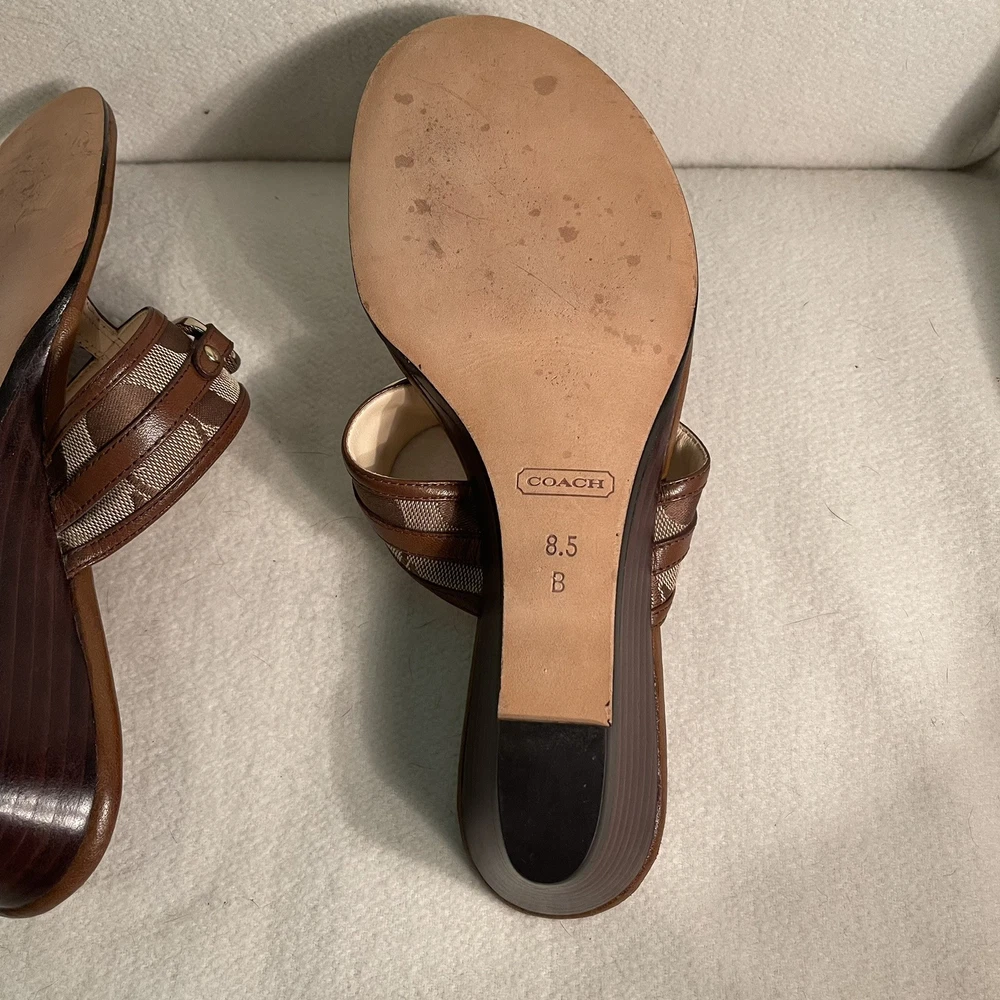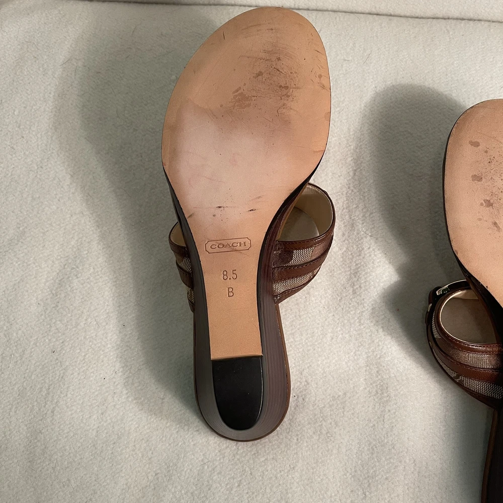 Heel Style: Wedge Pattern: Coach Logo Style: Low Wedge Sandal Type: Sandal Accents: Logo, Buckle Season: Summer, Spring, Fall US Shoe Size: 8.5 Model: Coach Signature Virginia A8567 Department: Women Upper Material: Leather Outsole Material: Leather Brand: Coach Insole Material: Leather Product Line: Coach Signature Color: Brown
