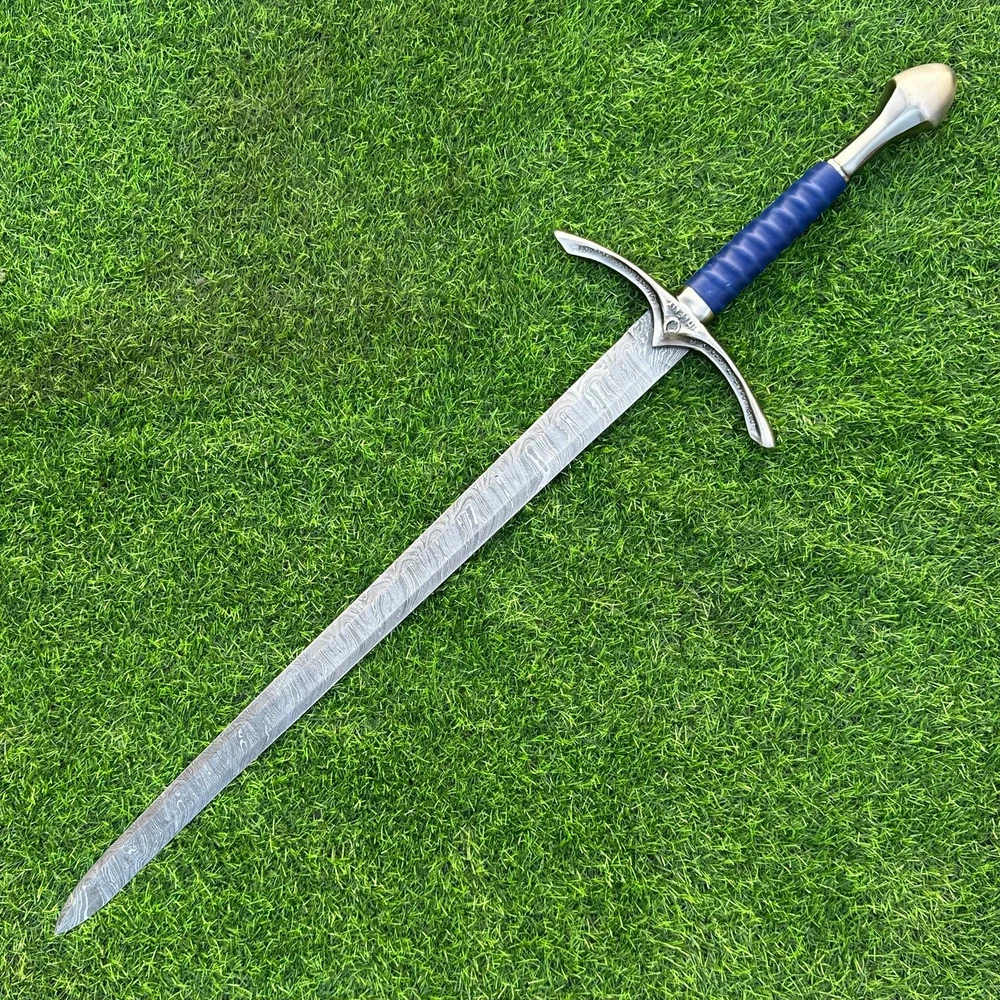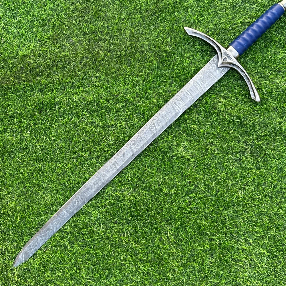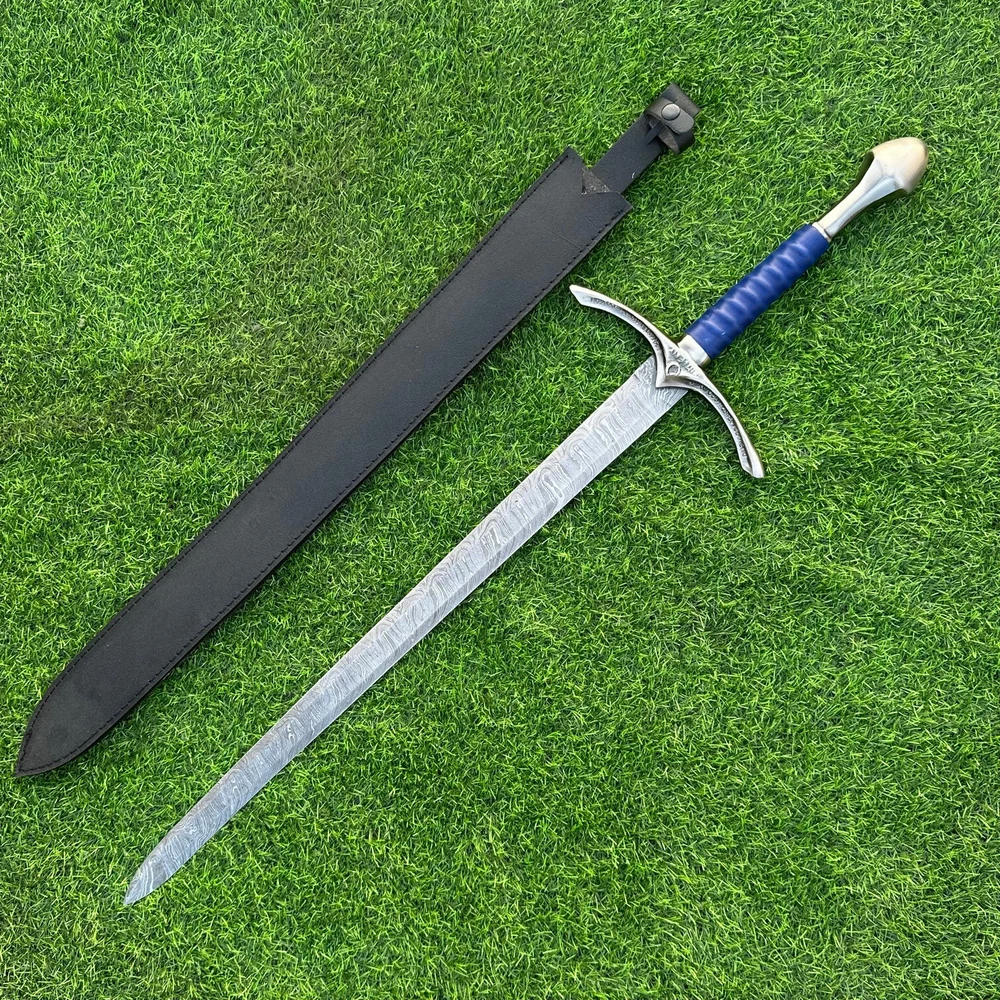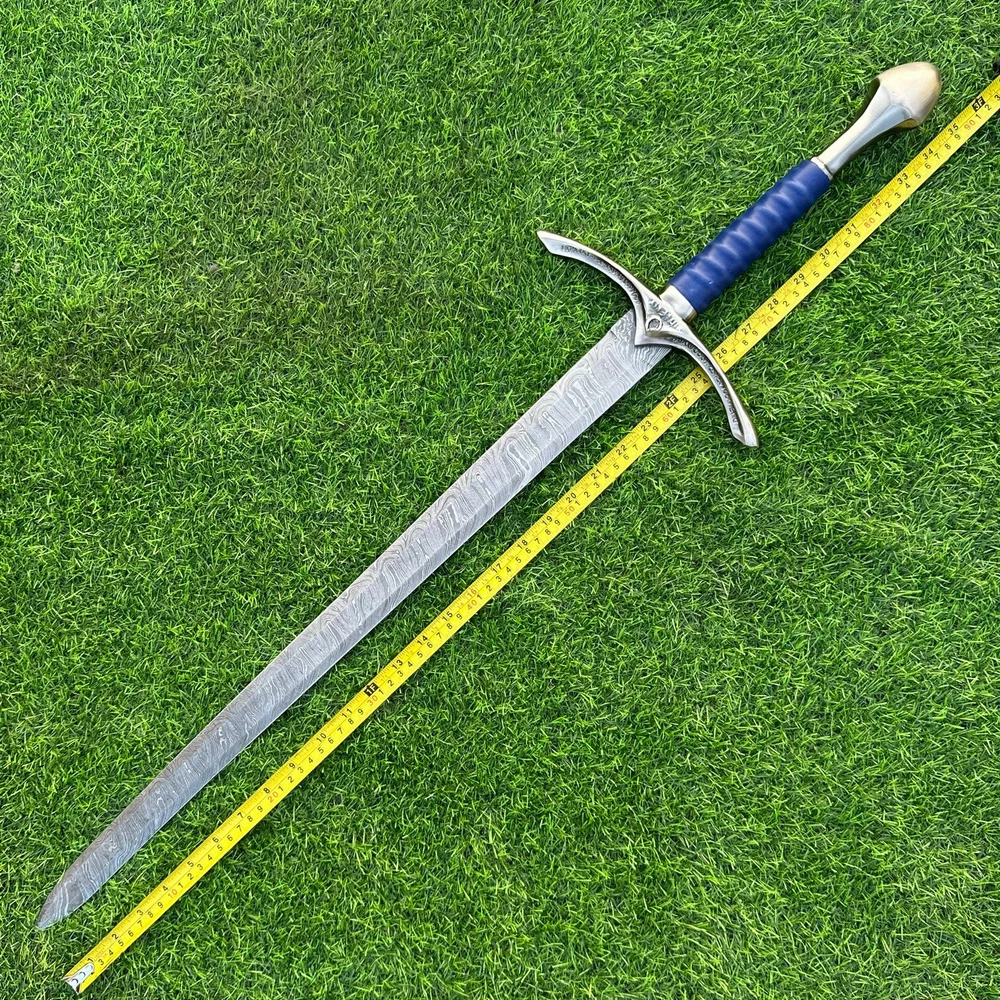 EXCLUSIVE HANDCRAFTED Damascus Steel Blade: A Legendary Sword for the Modern Warrior, Medieval Sword Swords Battle Ready, Hand Forged Sword, Damascus Sword, Long Sword, Viking Sword, Sword, Wedding Gift, With sheath Product Details: Overall Length: Approximately 35.0"inches (Approx.) Blade Material: Genuine Damascus Steel Blade Hardness: 54-58 HRC Handle Material: Leather Wrapped with handmade steel guard and but cap. Size Verification: To help you easily determine the size, we've included images with a scale for precise dimension reference. Thank you for your understanding. We appreciate your consideration. Included Accessories: Sheath -excellent husband wife gift -Wedding gift -Father's Day gift -Mother's Day gift -Birthday Gift -Groomsmen gift -Christmas gift -Luxury Gifts For Men -Anniversary gift for husband -Thanksgiving Gift For International Customers: We kindly advise our international customers to familiarize themselves with their country's regulations prior to making a purchase. If customs in your region request customs duties, please be prepared to cover these costs. Regrettably, we cannot assume responsibility, nor issue refunds in such cases. Our Damascus Steel Creation Process: At our workshop, we take immense pride in crafting authentic Damascus steel knives that surpass mere acid etching. Here's an overview of our Damascus steel-making process: 1. Material Selection: We meticulously combine 1095HC and 15N20 nickel carbon steel for our blades. 2. Layering: The chosen steels undergo repeated heating and folding to achieve a remarkable 384 layers. 3. Acid Burn: Following the layering process, the blade is treated with acid, revealing the brilliant nickel shine and a dark gray hue in the high carbon steel, thereby showcasing the stunning Damascus patterns. 4. Blade Finishing: Concurrently, we expertly sharpen the blade's edge, transforming the acid-treated edge into a striking satin finish. Our unwavering commitment to preserving the authenticity and craftsmanship of Damascus steel ensures that each knife in our collection showcases intricate layers and delivers exceptional performance. AGE LIMITATION: Please note that we exclusively sell knives to individuals who are 18 years of age or older. Additional Details: Leather Sheath (if pictured): Rest assured, this item comes with a superior-quality, sheath. Crafted with meticulous hand-tooling and stitching, it exemplifies fine craftsmanship and is designed for exceptional durability. The added stitching ensures it withstands years of demanding use, providing reliable protection for your knife throughout its lifetime. Care and Maintenance: When necessary, use a Diamond Wet Stone or a superior sharpening tool to maintain a 20-degree blade edge. After use, clean the item with soap and water, ensure thorough drying, coat it with gun oil, and store it separately from the sheath. Leather absorbs moisture from the air and can lead to blade rust if stored improperly. Customer Feedback: Your satisfaction and feedback are of utmost importance to us. We genuinely appreciate your positive reviews! When assessing shipping time, please consider international transit. Your recognition bolsters our confidence to enhance our services. If you encounter any issues with your order or product dissatisfaction, please reach out to us first. We are committed to resolving any concerns to your satisfaction and kindly request you not to leave neutral or negative feedback. Payments & Returns: All accepted eBay payment methods are available for this purchase. Our return policy typically extends to 14 days. Shipping and Handling: We offer free shipping on all our products (In the USA) Tracking Info: The buyer will receive the tracking number via email (if available). You can also track the shipment in the "Order Details" section on eBay. USPS UPS DHL updates tracking information nightly (if available). Contact: Feel free to contact us anytime via eBay messages. We are dedicated to responding to your inquiries within 24 hours and providing the best possible assistance.