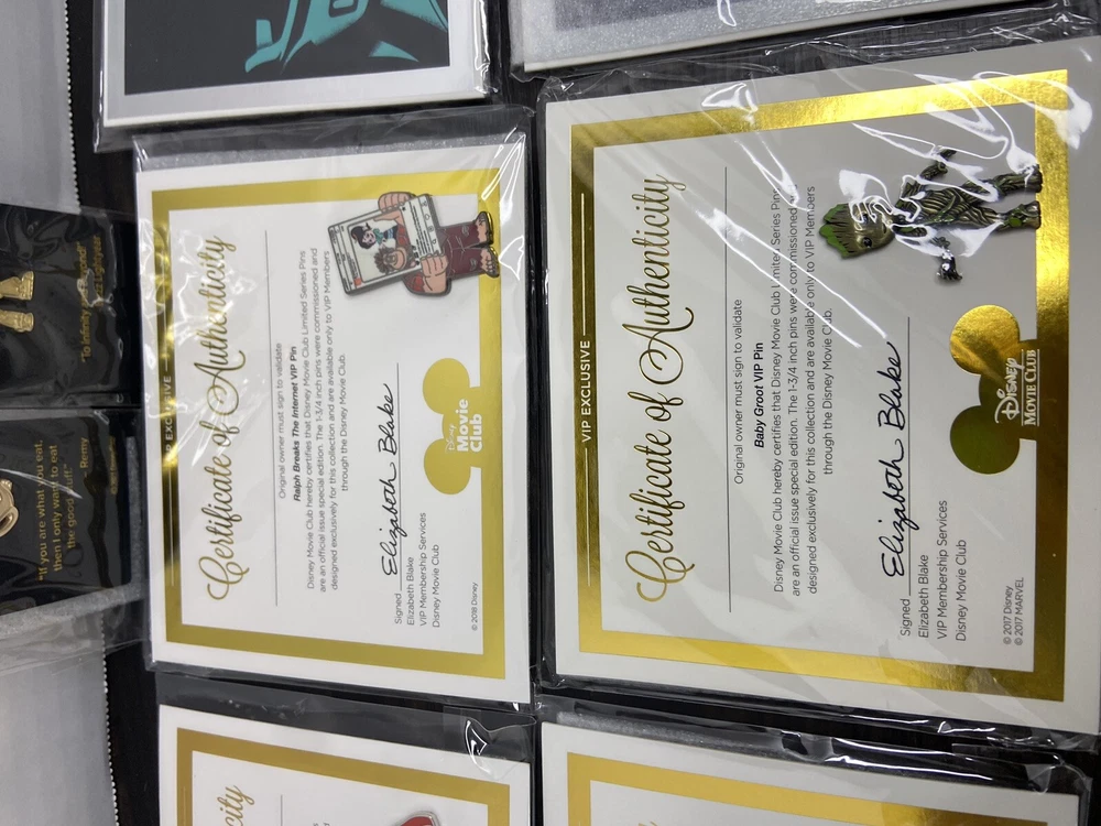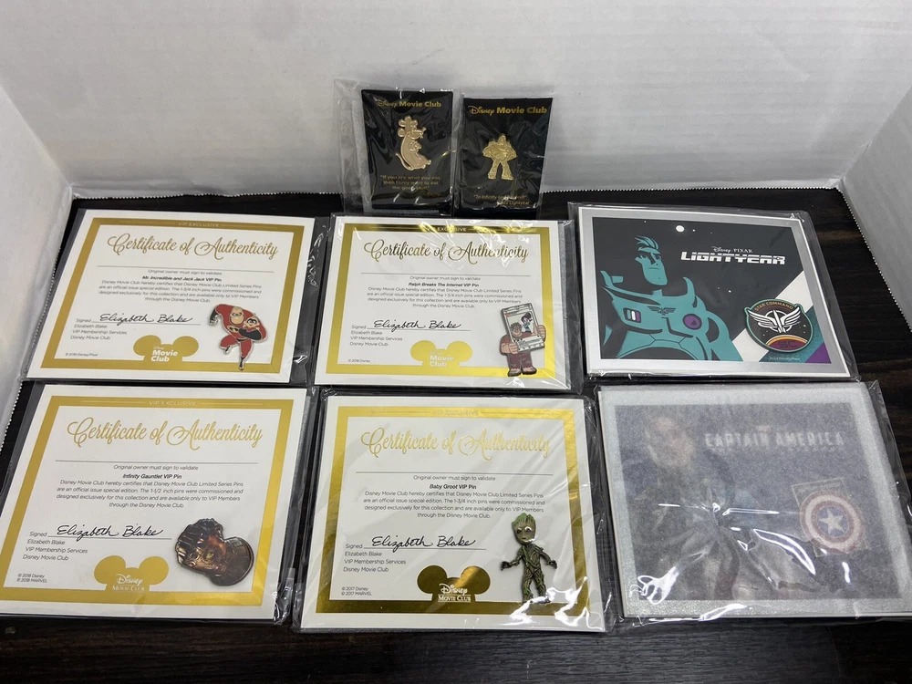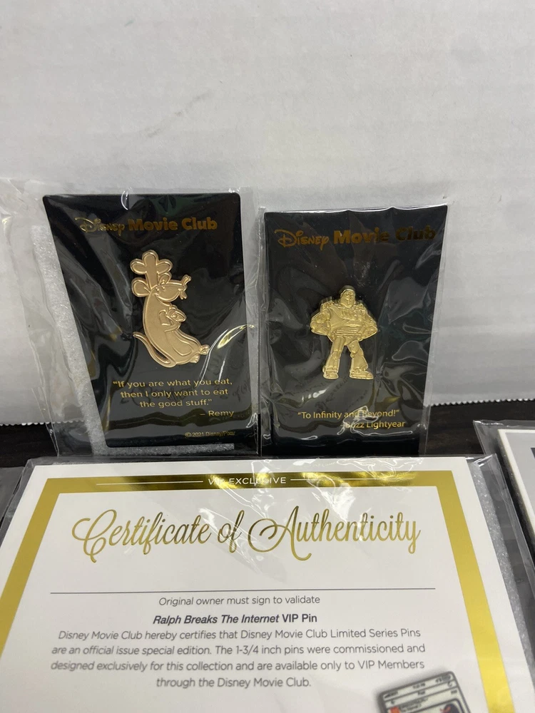 Immerse yourself in the magic of Disney with this exclusive lot of 6 Disney Movie Club (DMC) VIP pins, each accompanied by a charming pendant featuring beloved characters Groot and Buzz Lightyear. These pins are a must-have for collectors and fans, showcasing an array of vibrant designs inspired by the enchanting world of Frozen and the creativity of Pixar. Each piece in this collection stands out with its unique theme and high-quality craftsmanship, emblematic of the contemporary Disney era (1968-Now). Though the country of origin remains a mystery, the allure of these pins is undeniable, making them a prized addition to any Disneyana enthusiast's treasury.