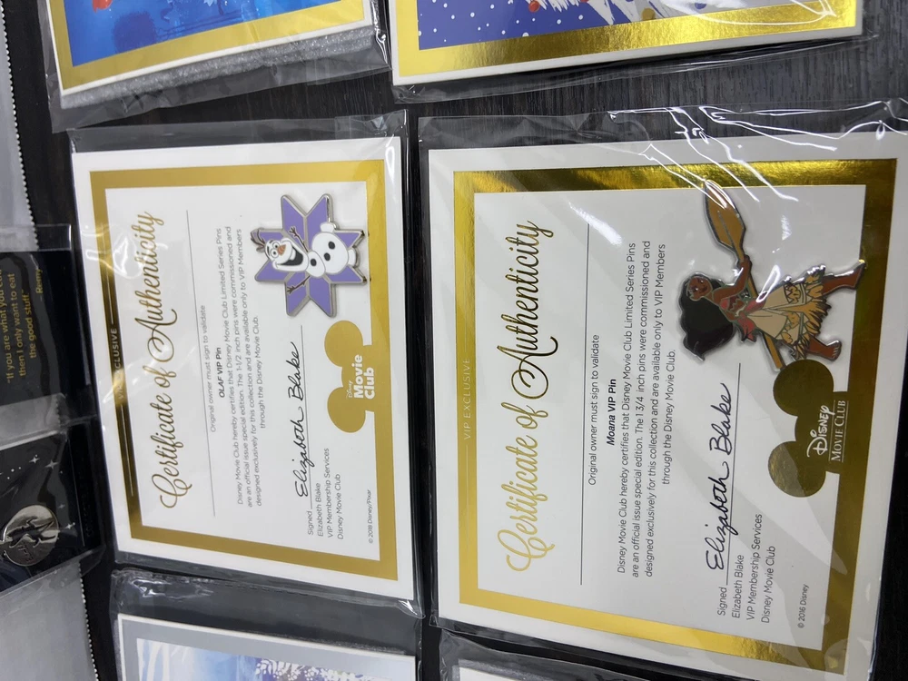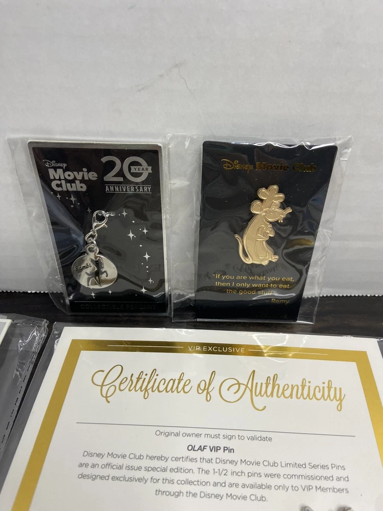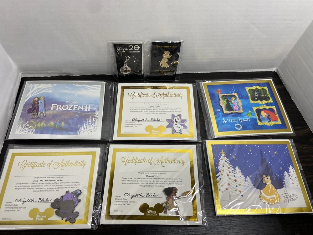 This lot of 6 authentic Disney Movie Club (DMC) VIP pins and pendants is a must-have for any Disney fan and collector. The pins feature various characters and stories from Disney movies, including Moana, Frozen, and Pixar's The Incredibles. Each pin is an exclusive DMC member-only item, making it a rare addition to any collection. The pins are in excellent condition and are perfect for displaying on a jacket or backpack. This set is ideal for those who love Disney and want to show off their fandom in a unique and stylish way. Add this incredible lot of Disney Movie Club VIP pins and pendants to your collection today!