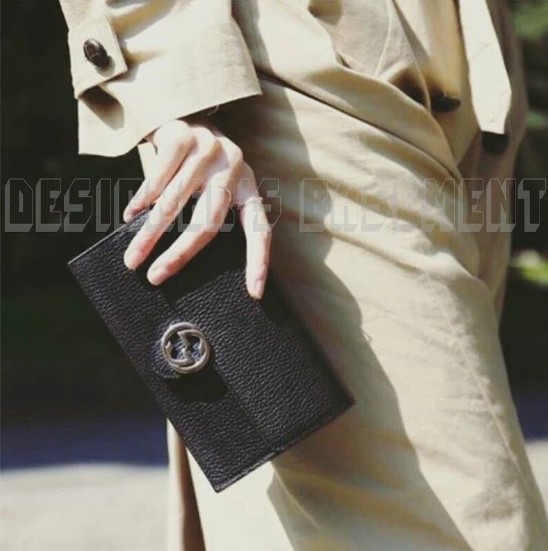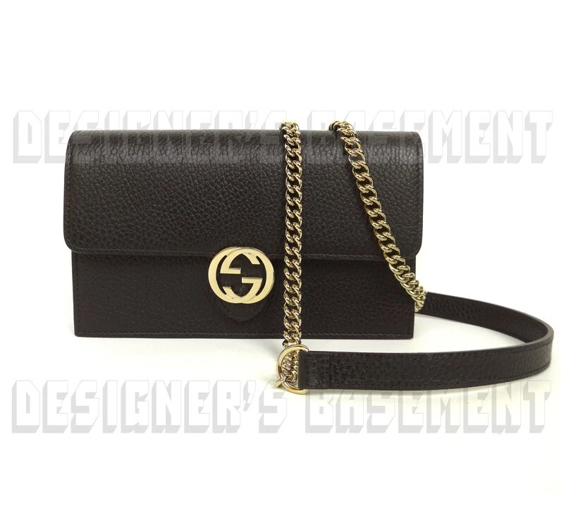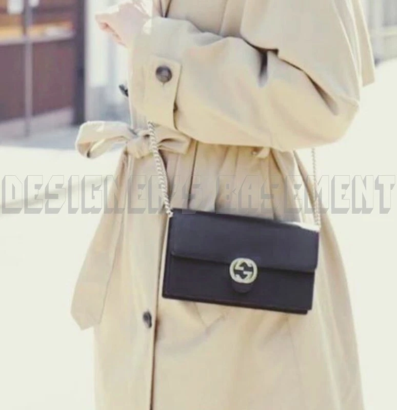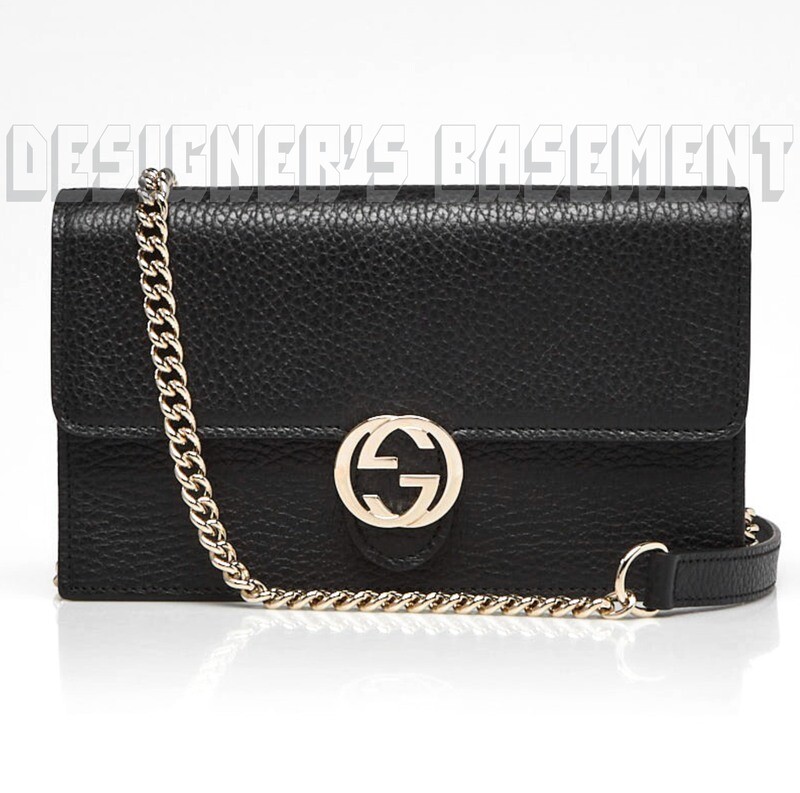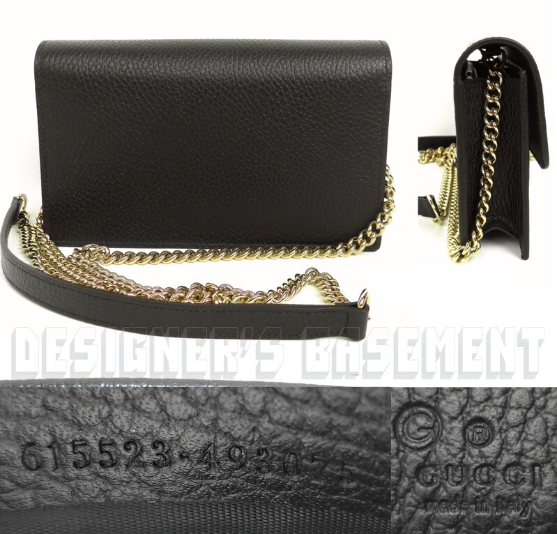 GUCCI black Leather INTERLOCKING G crossbody CHAIN bag wallet NWT Authentic $1290! Authentic GUCCI Outlet fabulous instantly recognizable black pebbled leather INTERLOCKING G snap flap MINI chain strap cross-body bag/wallet #615523. It's made in Italy of finest genuine leather exclusively for the Gucci Outlet stores . This fabulous bag has gold-tone "Interlocking G" logo on the flap over the snap closure and bold gold-tone chain 23"-drop detachable strap with leather shoulder panel . Inside it has a zip pocket on the back with a large compartment in the middle that has 18 credit slots built in on both sides with 8 slots on one side and 10 on the other side. There is a serial number embossed inside one slot . The measurements are approximately W 7.5"x H 4.5"x D 1.5" . Comes in it's original GUCCI box and dust bag! Brand new with tags on the box. You'll love it!