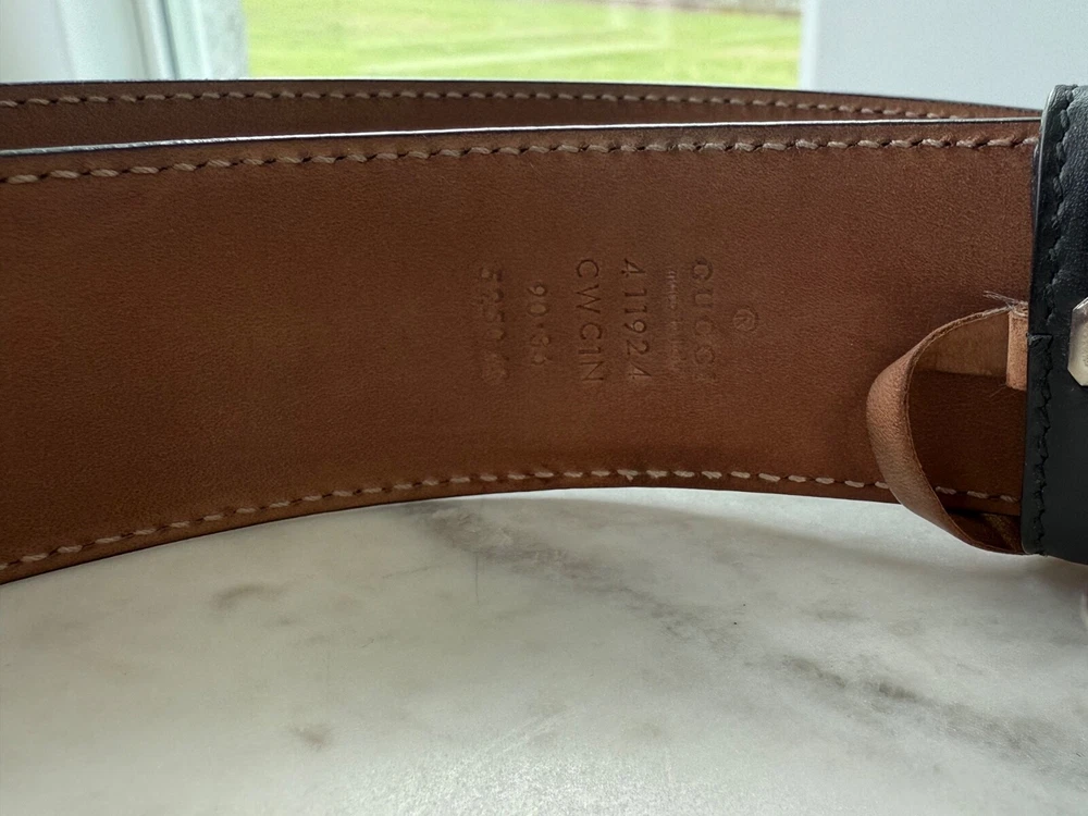 The product is an authentic Gucci belt in size 90/36, crafted from black leather with interlocking GG monogram detailing. This stylish designer belt features a solid pattern, buckle accent, and logo branding, making it a versatile accessory for men looking to add a touch of luxury to their outfit. Made in Italy, this dress belt embodies the sophisticated and high-quality craftsmanship that Gucci is known for, making it a must-have item for those seeking a designer touch to their wardrobe. No Box