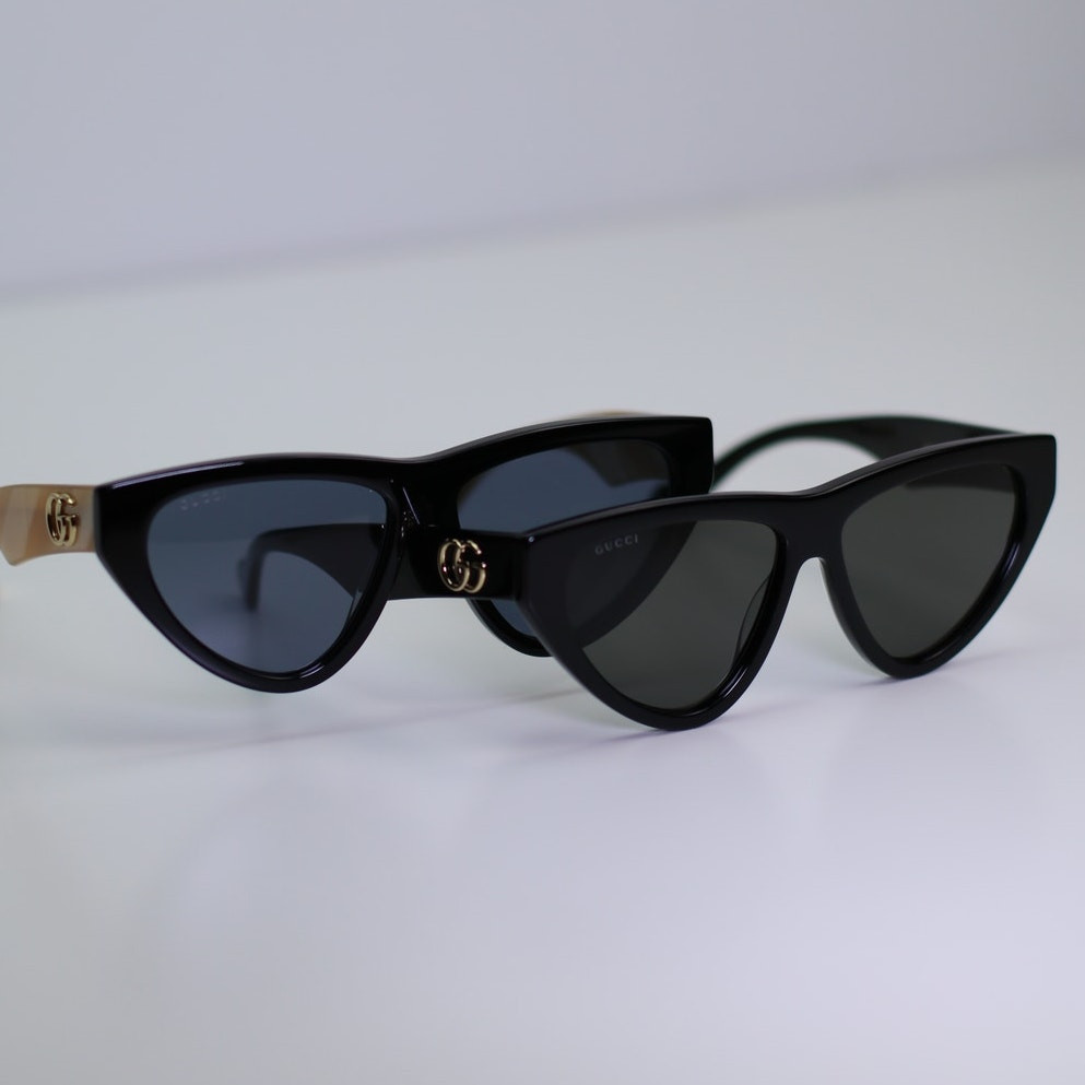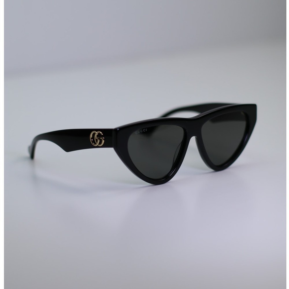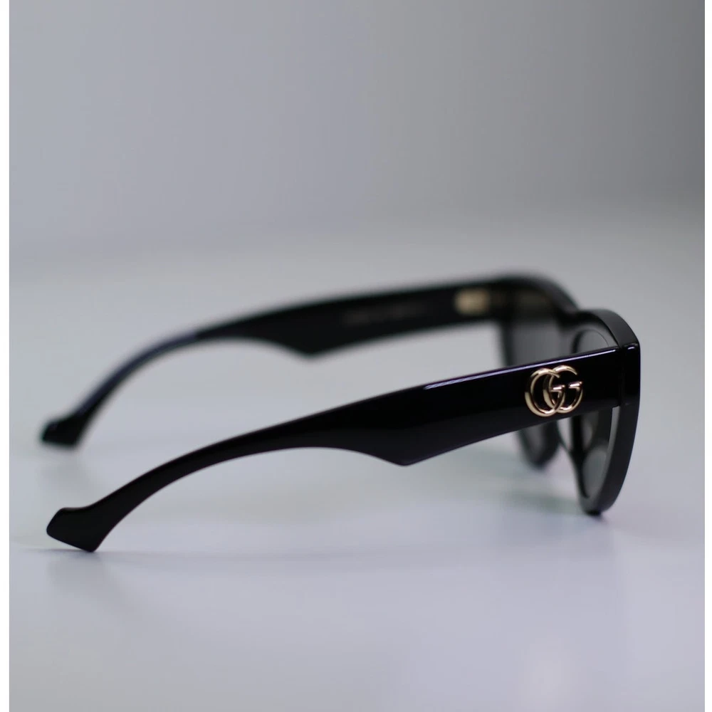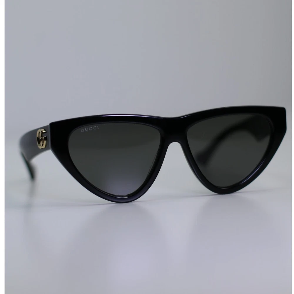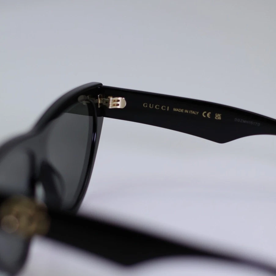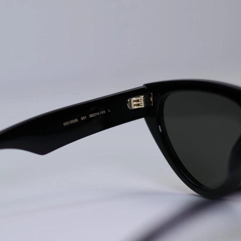 The Gucci GG1333S 001 sunglasses are a bold and stylish accessory designed for women, featuring a distinctive cat-eye shape. Frame Color: Shiny black Lens Color: Grey Frame Material: Acetate Lens Material: Bio nylon Lens Width: 58 mm Bridge Width: 14 mm Temple Length: 145 mm A notable feature of these sunglasses is the Gucci running logo on the temples, adding a touch of brand recognition to the design. The combination of the black frame and grey lenses creates a striking and fashionable look suitable for various occasions.