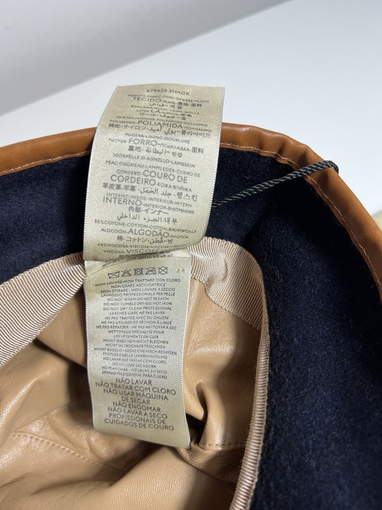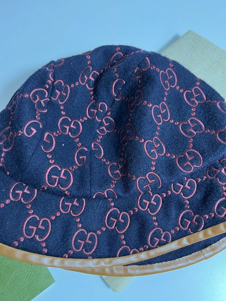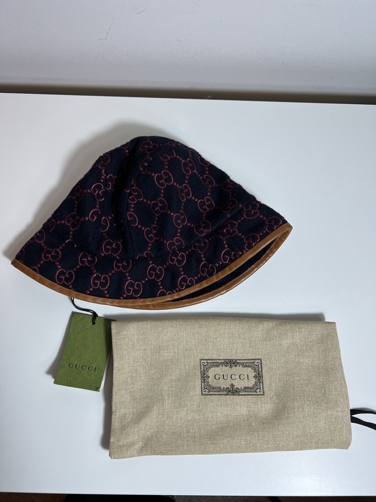 100% Authentic Gucci GG Supreme bucket hat in size Small (57 cm). Crafted from wool featuring GG monogram in red/purple on navy blue, trimmed with tan leather at the brim. Brand new with tags Includes original dust bag and Gucci tags Size: S (57 cm) Material: Wool, Cotton, Leather Color: Navy with red GG pattern and tan leather trim Made in Italy Ships securely with original packaging.