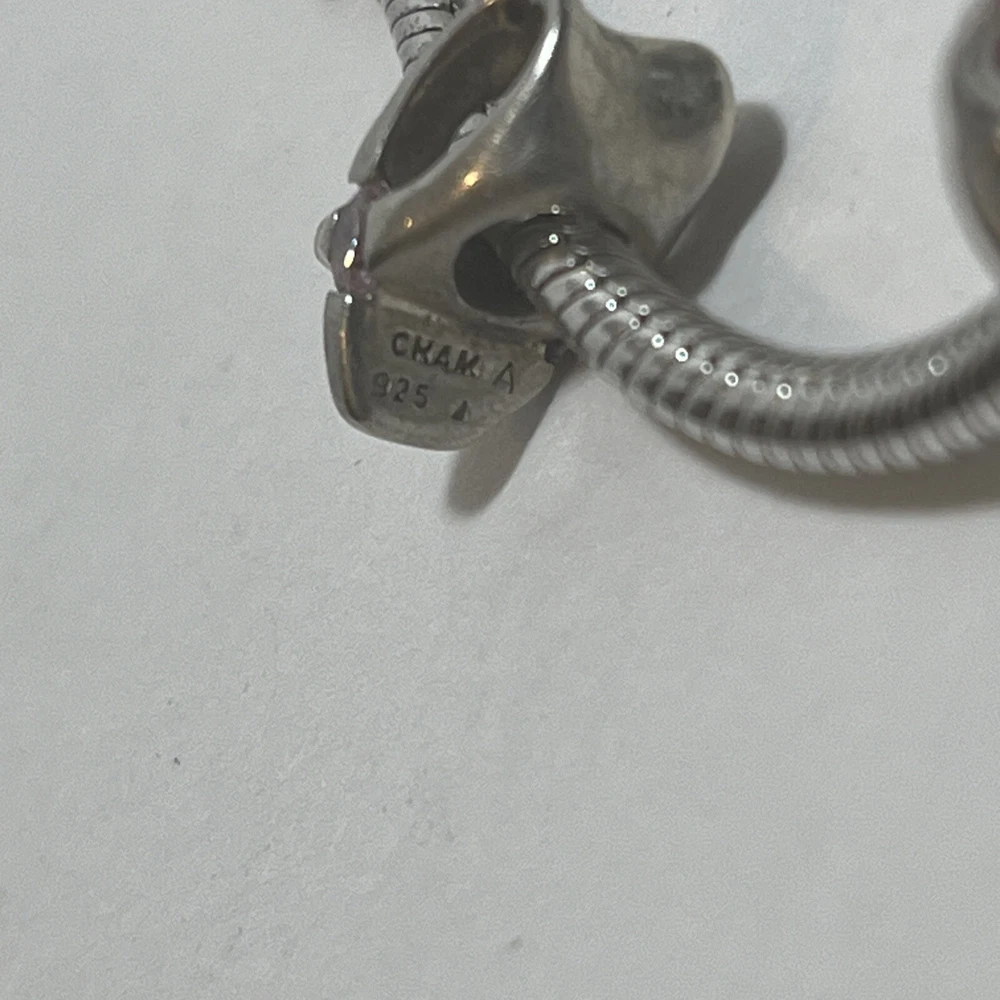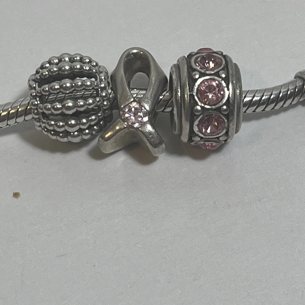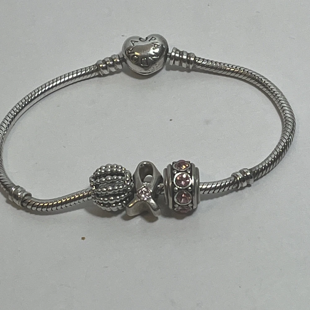 Show your support for those who have battled or are battling breast cancer with this beautiful bracelet. Crafted with authentic Pandora Sterling Silver, this heart-shaped closure charm bracelet is perfect for any occasion. The snake chain adds a touch of elegance and the 7.75 inch length makes it a great fit for most wrists. The charm is designed with a heart shape and features a stunning 925 metal purity. The round 925 silver charm is Pandora. The ribbon is a Chamila charm. The other charm is could not find any markings.