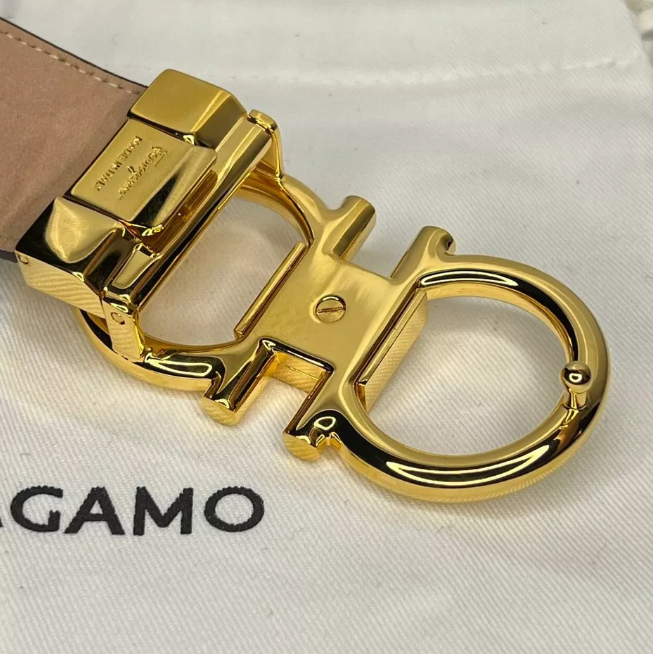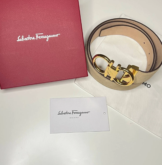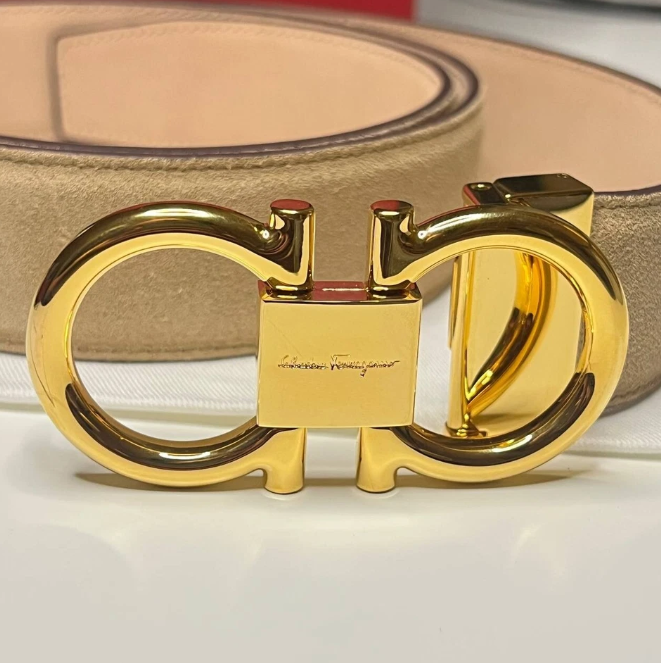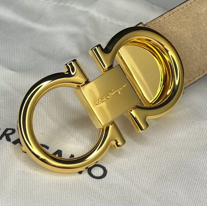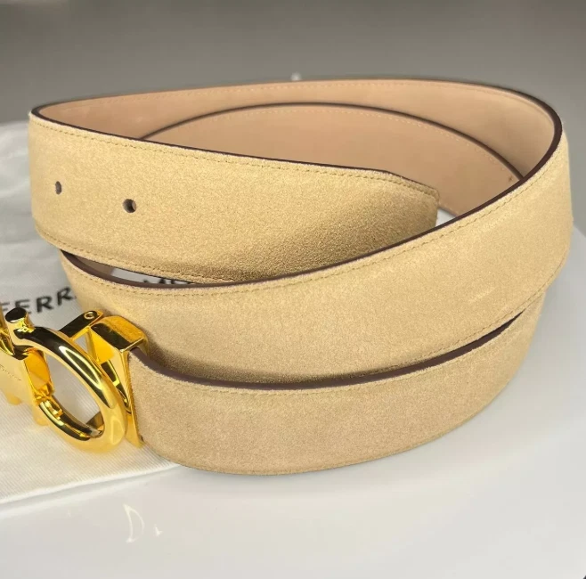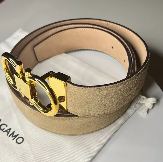 AUTHENTIC SALVATORE FERRAGAMO MEN'S BELT BEIGE SUEDE STRAP WITH SHINY GOLD BUKCLE COMES WITH DUST BAG, CARD, BOX. BUCKLE SIZE: 8x4 cm STRAP WIDTH: 34mm SIZE: 105CM/42IN - FITS MEN'S WAIST SIZE 36-38 INCHES. ADJUSTABLE FEATURE. BELT CAN BE ADJUSTED TO SMALLER SIZES IF NEEDED. REMOVABLE BUCKLE. ITEM SHOWS LIGHT COSMETIC FLAWS FROM AGING IN STORAGE. SMALL MARKS ON THE SUEDE, NOT VISIBLE WHEN IN USE. NO MARKS OF WEAR.
