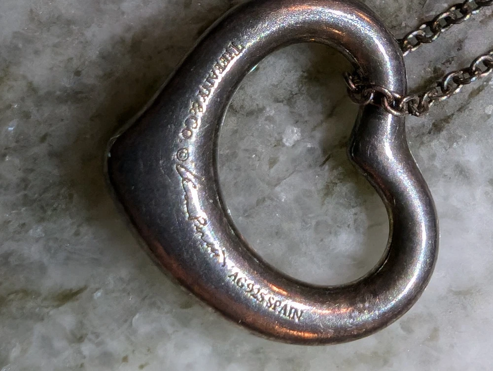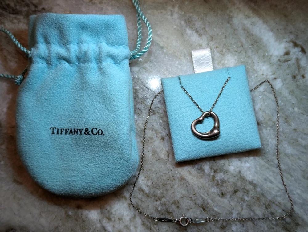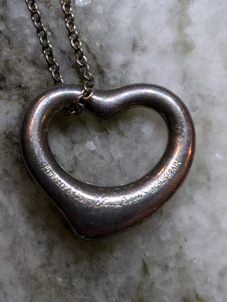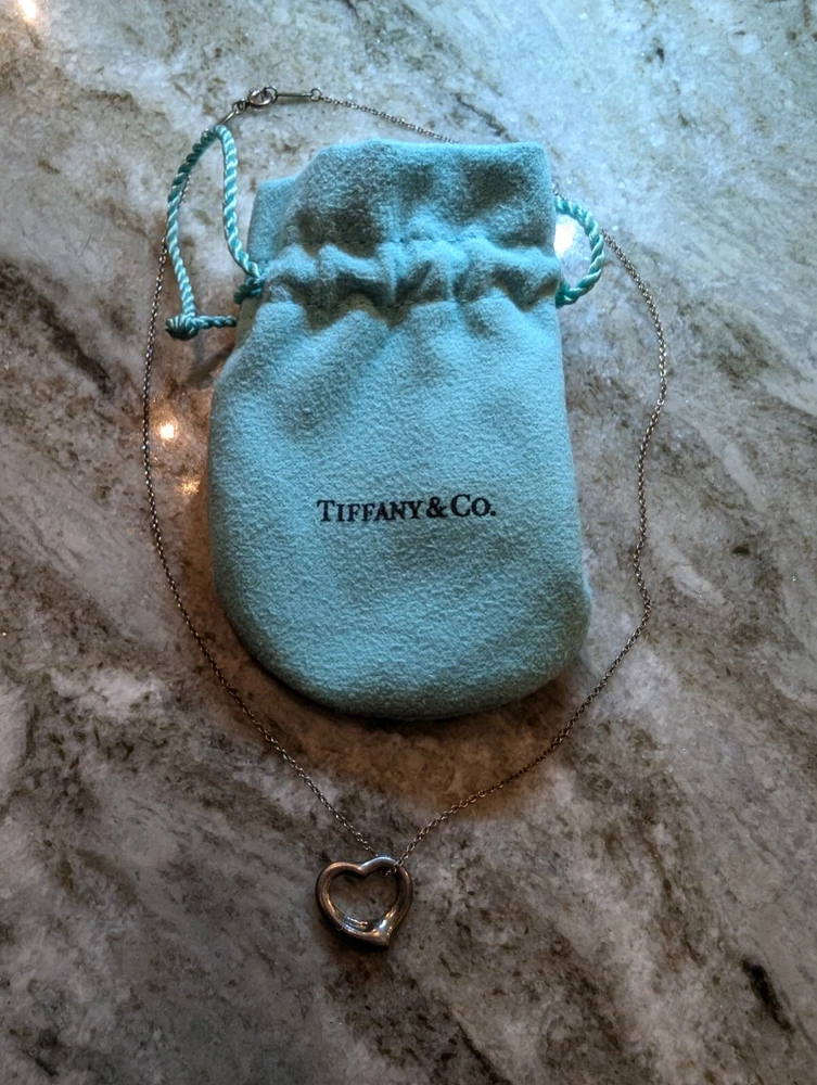 Authentic Tiffany & Co Open Heart Necklace Ag925 Silver Has original bag and chain holder. Loved necklace that can be cleaned up and polished.