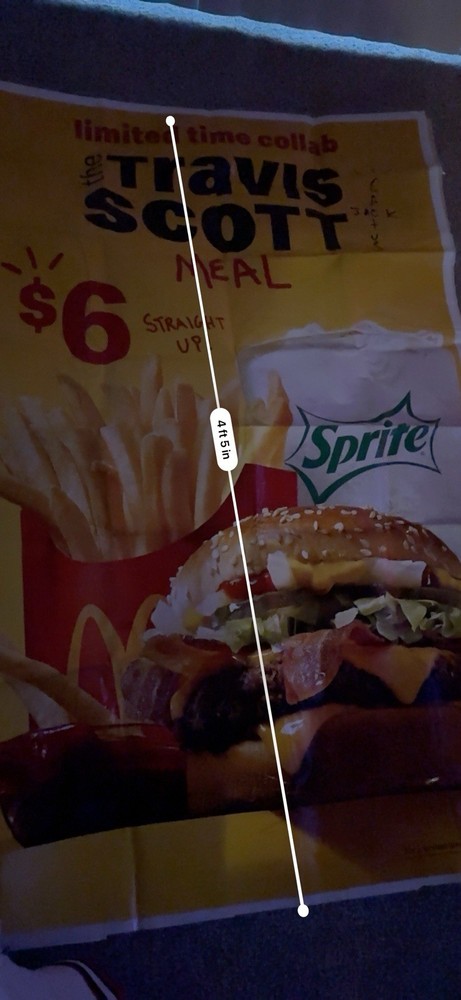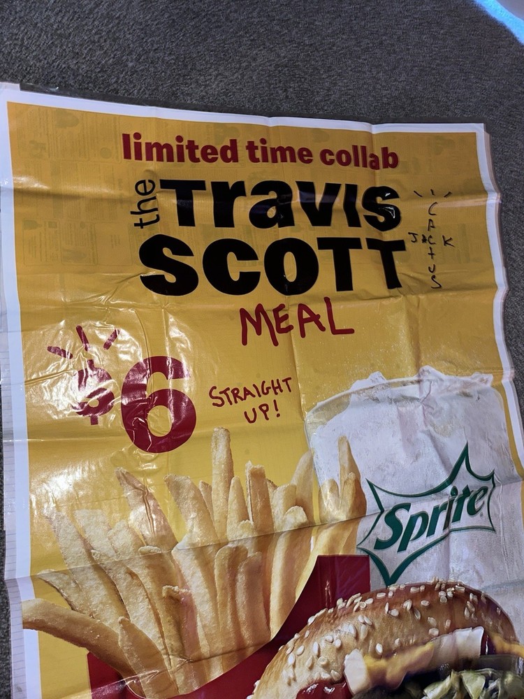 The product is an authentic Travis Scott Meal McDonald's poster, featuring the artist's collaboration with the fast-food chain. This limited-time collectible item is a large unframed poster of the Travis Scott burger, showcasing the unique design and style created by the artist himself. Perfect for fans of Travis Scott and collectors of exclusive merchandise, this poster captures the essence of the collaboration between the artist and McDonald's.
