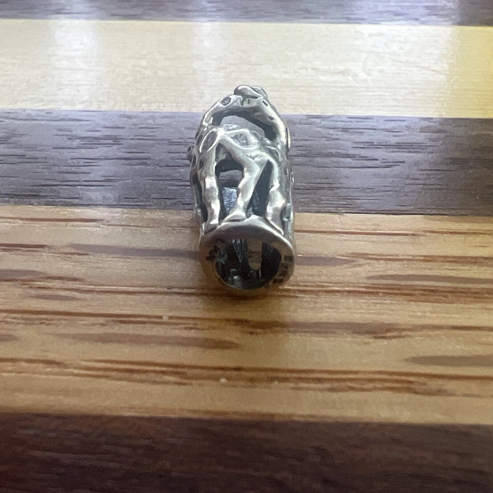 Enhance your jewelry collection with this authentic Trollbeads giraffe charm, model #11240. Made of high-quality 925 silver, this retired bead is a great addition to any bracelet or necklace. The bead's silver color and beaded style make it a versatile piece that can be paired with any outfit. This Trollbeads giraffe charm is perfect for those who love unique and stylish jewelry. Its charm type is a bead and it is made of silver metal. It is a great choice for those who are looking for a retired bead to add to their collection.
