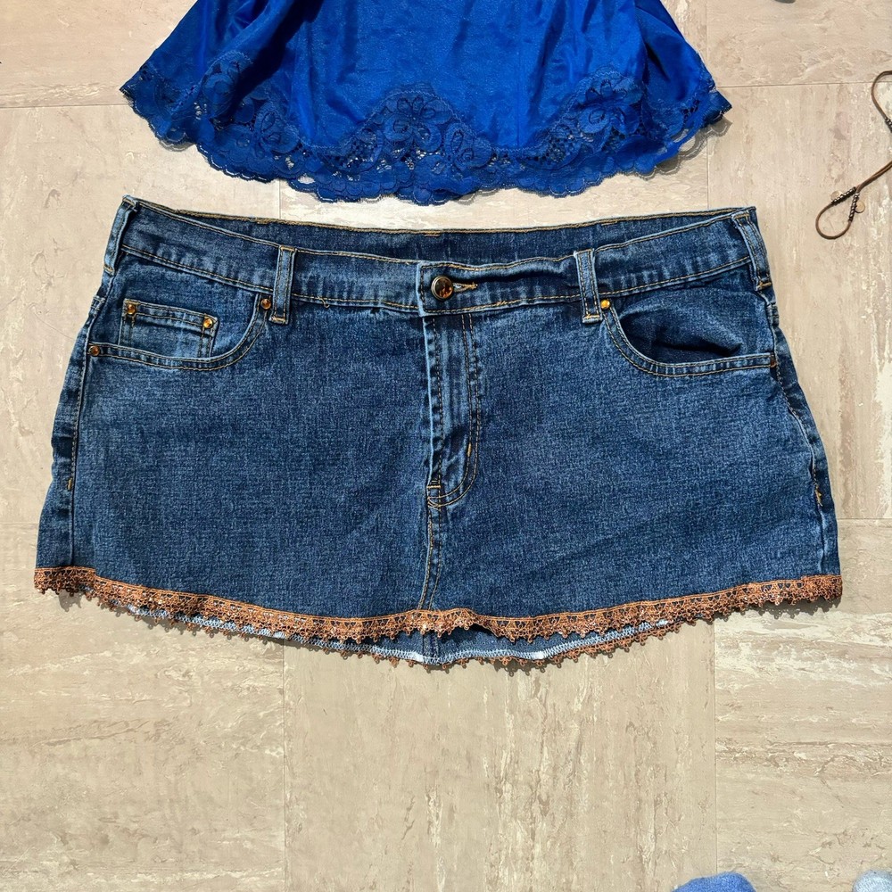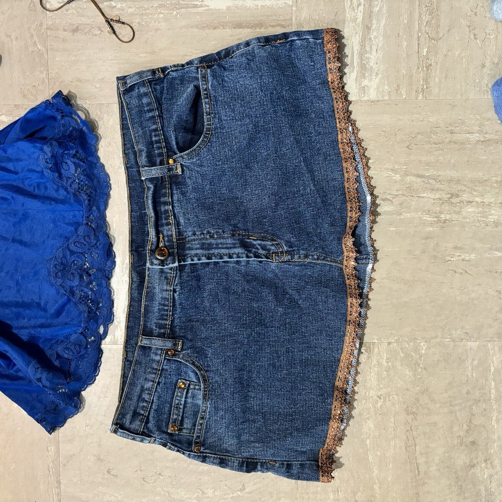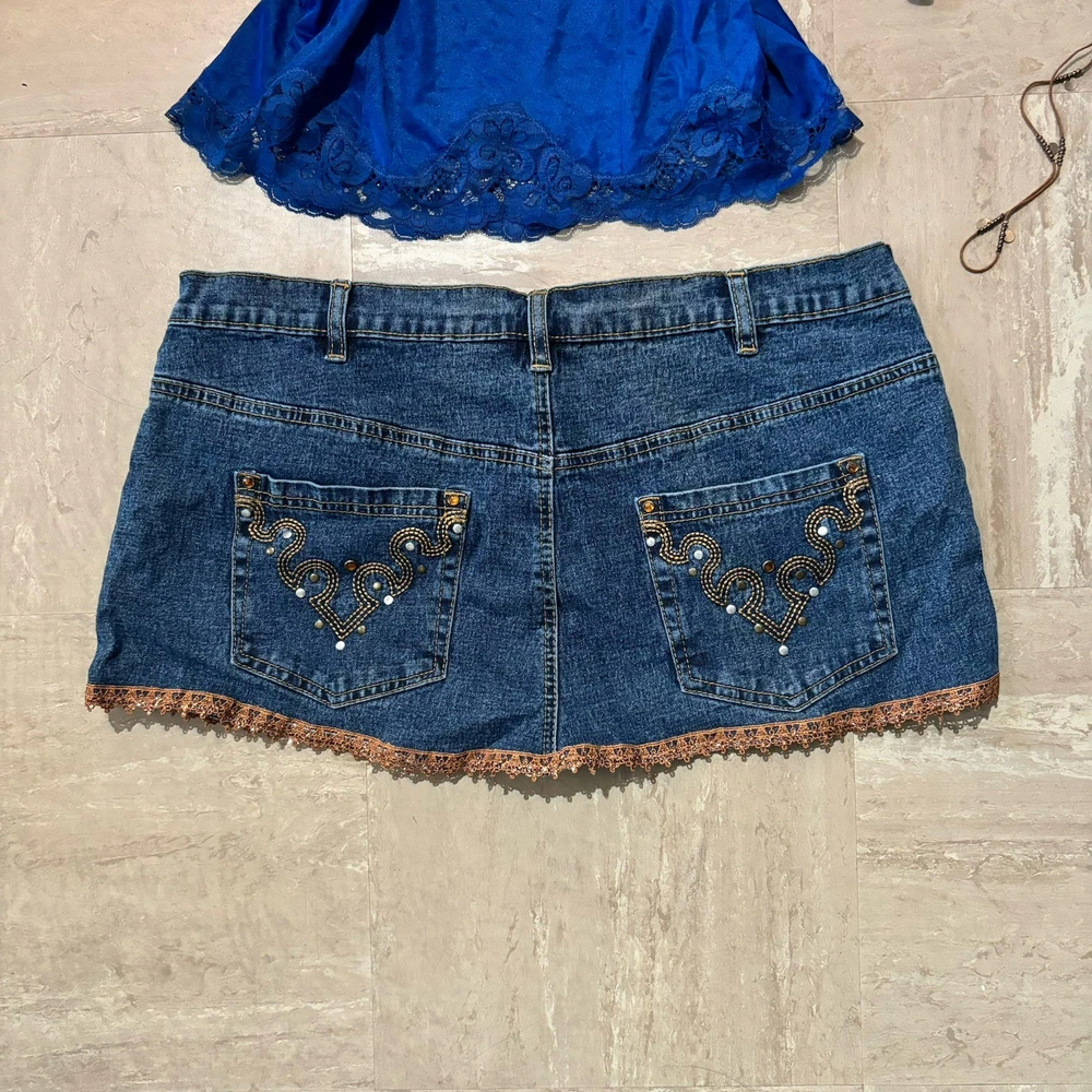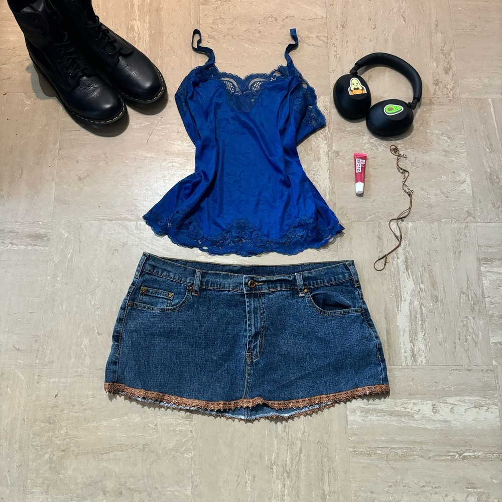 Extremely Rare vintage Y2K denim mini skirt - the exact 2000s style selling out everywhere. It's a must have! Ships today! Measurements: Waist: 36 inches Length: 11 inches Size guide: L - stretch DM for appropriate discounts/info #vintage #trending #y2k #90s #2000s #retro #indie #grunge #coquette #minimalist #softgil#streetwear #cottagecore #romantic #festival #tumblr #cami #camisole #tanktop #strappytop #lacetrim #satintop #sliptop #bustierstyle