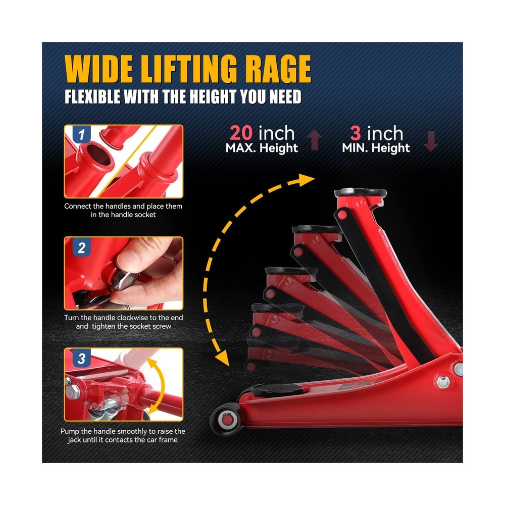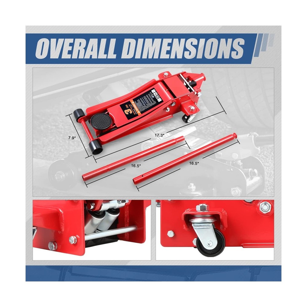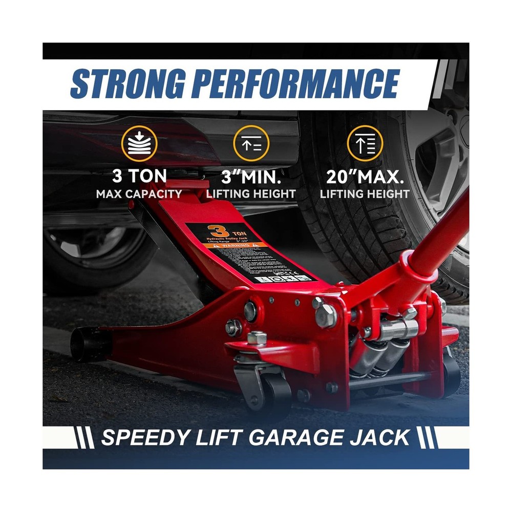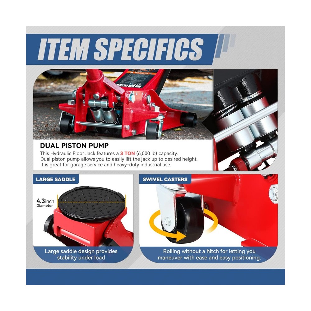 Auto Dynasty 3 Ton Low Profile Floor Jack, Heavy Duty Steel Hydraulic Car Jack with Dual Pistons Quick Lift Pump, Hydraulic Racing Floor Jack, Lifting Range 3" to 20", Red Description Features: Product DescriptionOur floor jack, which can help support raised loads, allows you to lift your vehicle more conveniently. Brilliant PerformanceThe low-profile floor jack, with its large saddle, casters, and built-in dependable safety release valve triggers, can provide extra stability and help protect your vehicle. Extraordinary QualityAuto Dynasty hydraulic floor jack is constructed of heavy-duty steel for strength and stability to ensure a long-lasting operating life. Great FunctionThis 3 ton garage car jack is a lightweight design, and hydraulic lifting allows you to easily lift the jack to the desired height, making it great for garage service and heavy-duty industrial use. Product SpecificationOverall Dimensions: 17.3" x 7.9" | Capacity: 3 Ton (6000LBS) | Lifting Height: 3" Min / 20" Max Product Details: Load Capacity: 6000 Pounds Maximum Lifting Height: 20 Inches Brand: Auto Dynasty Color: Red Style: Hydraulic Low Profile Load Capacity: 6000 Pounds Maximum Lifting Height: 20 Inches Brand: Auto Dynasty Color: Red Style: Hydraulic Low Profile Automotive Fit Type: Universal Fit Manufacturer: Auto Dynasty Model: Low Profile Floor Jack Item Weight: 74.1 pounds Package Dimensions: 30 x 15 x 8 inches Manufacturer Part Number: ADTOOLS00235A Special Features: 20 Inches Maximum Lifting Height, 3 Ton Load Capacity, Heavy Duty Steel Construction, Hydraulic Lifting Function, Lightweight Design Date First Available: February 17, 2023 Delivery We Do Not Ship Outside of the Continental US. Return Policy All items qualify for returns within 30 days of receipt. Buyer is responsible for return shipping on any item that is not damaged. Feedback We take our reputation seriously, we buy and sell online, so we understand the value of trust. If you are unsatisfied with your order, please contact us and we will work with you to resolve it to your satisfaction.