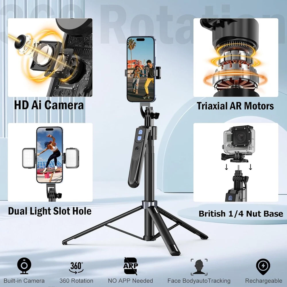 💚【360° Face Tracking Phone Holder & Smart AI】 360°Face-Tracking Tripod Adopts Smart Ai System Technology To Accurately Identify The Face or Body And 360° Rotate Steadily With Your Movement. You Can Control Pause/Start Based On Your Gestures Moving Steadily And Horizontally With Your Movements. AI Smart Camera follower meet your shooting needs. Wherever you go, you are always the focus. 💚【70"Selfie Stick Tripod's Built-in Tracking Camera】Compared to the traditional short-footed 360° Face-Tracking Tripod,We offering our portable adjustable length from 12.59 to 70.9 inches, our Portable Tripod provides the flexibility to choose the size that suits you best.Satisfy your shooting style in various poses.Free Your Hands From Video Calls And Live Streaming. 💚【No App & Intelligent Gesture Control & Remote】Our stand selfie stick blends simplicity and innovation,no app download is required.Face tracking 360 tripod for cell phone rotating adopts an excellent gesture recognition algorithm, doing the "👌" gesture means turn on the tracking, while doing the "🖐️" gesture means pause the tracking.Now you can take videos and photos yourself. 💚【Standard 1/4" Interfacer】The smart tracking holder comes with a standard 1/4" screw thread at the top that can be mounted on a tripod and adjust the angle and height.With a universal 1/4" screw mount is applicable for most digital cameras, action camera, gopr.o and ring light. 💚【Professional Video/Photo Assistant】Achieve 360° panoramic shooting, 270° up and down shooting, our phone tripod & camera tripod can adjust various angles for Horizontal & Vertical Shooting, allowing you to capture the perfect shot.Whether You Want to Use Tiktok, Facebook, Zoom, YouTube, Facetime or Other Live Broadcasts, or Take Photos And Videos, or Video Chat, or Meetings, or Online Classes. 📷Warmer Note: Our product is a face tracking selfie stick. If you move too fast or the distance exceeds a certain range(Face tracking selfie stick sensitivity optimal tracking distance within 5M), the face tracking selfie stick will not be able to track your face. Product Description 1. How to use the selfie stick tracking function? Step 1: First of all, make sure that the 360° rotation axis of the selfie stick is unlocked.The 360° rotation axis of the selfie stick is located on the back of the selfie stick. If you do not want the selfie stick to rotate, you can lock it. Step 2: Turn on the power switch on the side of the handle of the selfie stick. Step 3: Use the [OK] gesture to show the camera on the handle of the selfie stick that the camera is starting to recognize the rotation of your face. The [Palm] gesture means that the rotation is stopped. You can find more information on operating the selfie stick in the QR code video tutorial in our instructions!