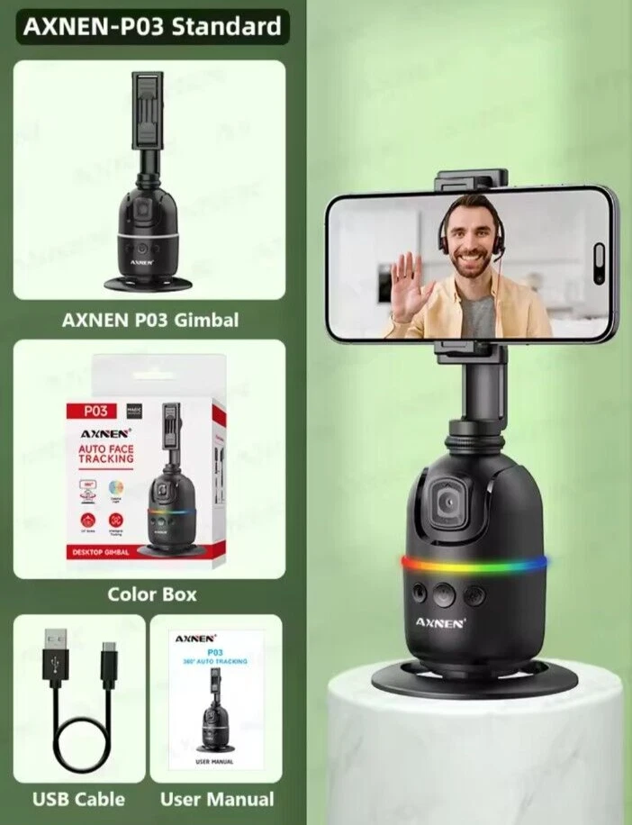 Elevate your content creation with the Axnen Auto Face Tracking Tripod Gimbal, a versatile and intelligent rotating holder designed for your mobile phone and camera. Compatible with a wide range of devices, its universal clip ensures a secure fit on any flat surface, making it ideal for vlogging, live streaming, and content photography. The sleek black design is crafted from durable ABS + PC materials, promising both style and longevity. The gimbal features a 1/2 ft USB cable for convenient power supply and comes with a base that allows for easy adjustment and perfect angle setting. Bluetooth connectivity ensures seamless operation, while the holder's design promises stability and convenience. The package includes the tracking gimbal, base, phone holder, USB cable, manual user, and a color box, making it a comprehensive solution for your mobile phone stabilization needs.