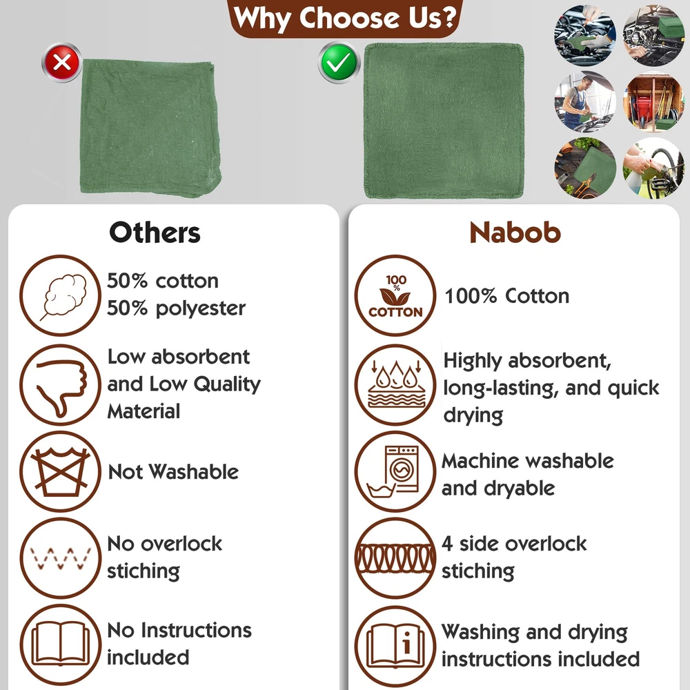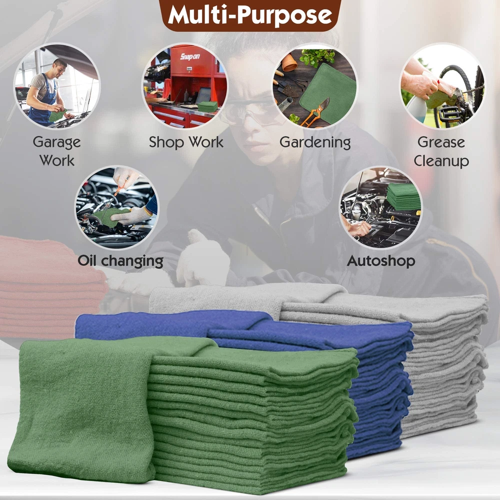 Auto Mechanic Shop Towels 25 Pack Rags 100% Cotton Size 25 Pack, Green Manufactured with 100% pure ring spun cotton and reinforced on 4 sides by overlocked stitching that makes our shop towels durable. Lint free rags that make cleaning super easy. Our shop towels won’t leave a bit of lint either used dry/wet or with a cleaner. Our 14x14 inches shop towels are highly absorbent and designed for wiping large or small spills of liquid, grease and paints. Our shop towels are machine washable and reusable. These features not only make them environment friendly but economical at the same time. Nabob Wiper’s shop towels are one in a tool that can be used in garages, auto body shops, car detailing, kitchens, gardens, bars, restaurants and hospitals. Shipping We offer FREE shipping on all orders! We ship within Three business days of payment, usually sooner. We use a selection of shipping services such as UPS, FedEx, USPS etc. We only ship to the lower 48 states, no APO/FPO addresses or PO Boxes allowed. Local pickups and combined shipping options are not provided at this time. Return You can return a product for up to 30 days from the date you purchased it. Any product you return must be in the same condition you received it and in the original packaging. Please keep the receipt. Payment We accept payment by any of the following methods: PayPal Please pay as soon as possible after winning an auction, as that will allow us to post your item to you sooner! Feedback Customer satisfaction is very important to us. If you have any problem with your order, please contact us and we will do our best to make you satisfied. Contact Us If you have any queries, please contact us via ebay. We usually respond within 24 hours on weekdays. Please visit our eBay store to check out other items for sale! Thank you for shopping at our store.