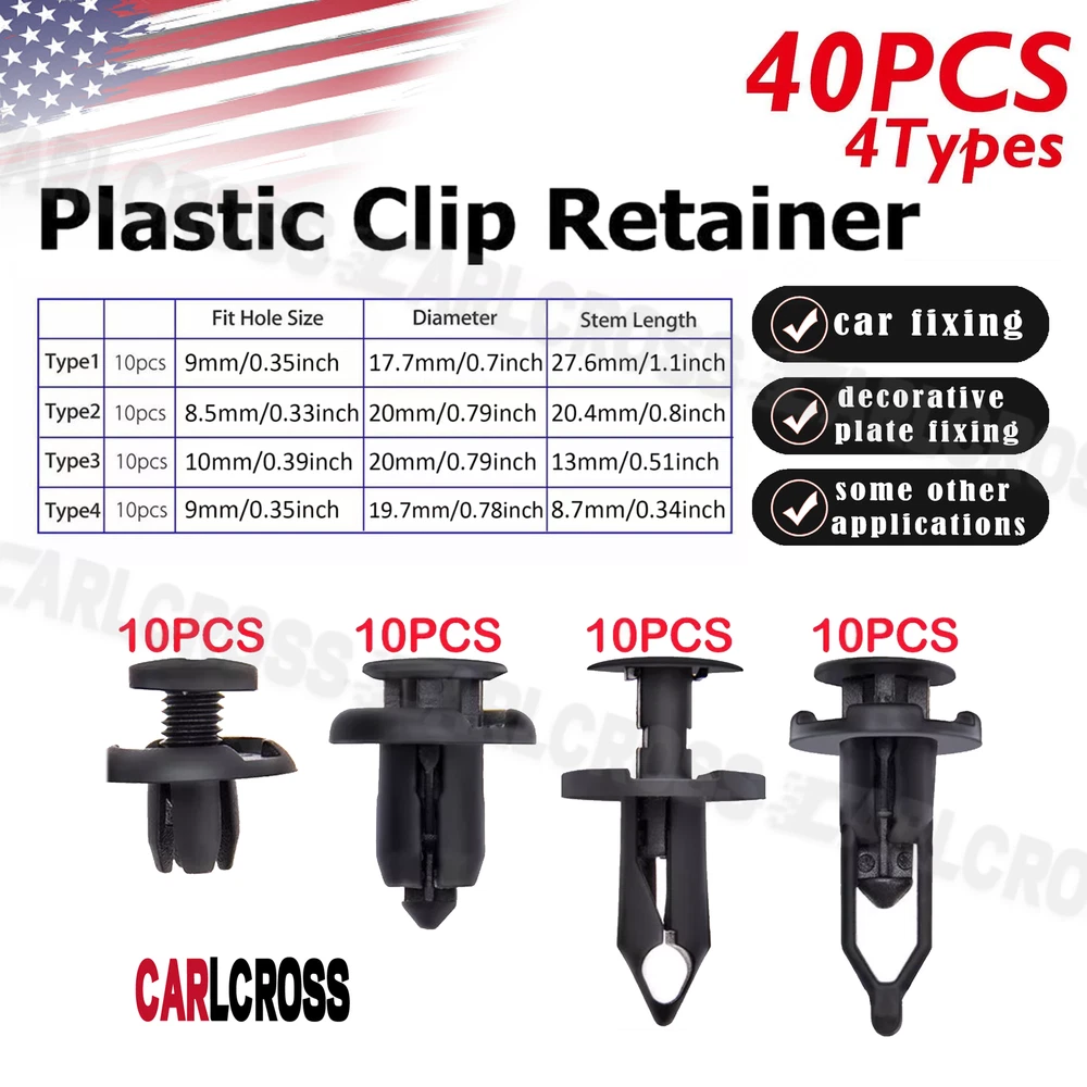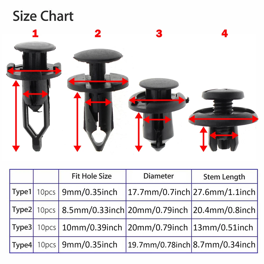 Description: Prime & High Quality 100% Factory Tested We recommend you find the Professional Installation. (Installation instruction is not included.) This product is Brand NEW Non-Original Aftermarket Parts, please check before buying. Durable nylon plastic rivet fasteners; 40pcs in total; 4 different sizes 7.5 mm to 10 mm hole size black nylon Manual measuring, please allow 1 ~ 3 mm error, thank you. Because the quantity is determined by a precision instrument weighing, please allow about 2% of the number error, please understand, thank you! Interchange Part Number: 91512SM4003 / 91512-SM4-003 91503SZ3003 / 91503-SZ3-003 5216102020 / 52161-02020 21030249 Fitment: Type1---10pcs--9mm/0.35inch----18mm/0.71inch---28mm/1.1inch Type2---10pcs--8mm/0.31inch----20mm/0.79inch--20mm/0.79inch Type3---10pcs--10mm/0.39inch--20mm/0.79inch---13mm/ 0.51inch Type4---10pcs--7.5mm/0.3inch--19.6mm/0.77inch--9.5mm/0.37inch 4 Type plastic rivets for your choice Cars good accessory, used by many manufacturers to hold all pieces of trim and upholstery including carpet, door cards, roof lining, engine covers, landing panels, boot linings, wheel arch linings etc. Package includes (as pictured): 40PCS (4 types) On Jan 24, 2025 at 16:15:47 PST, seller added the following information: