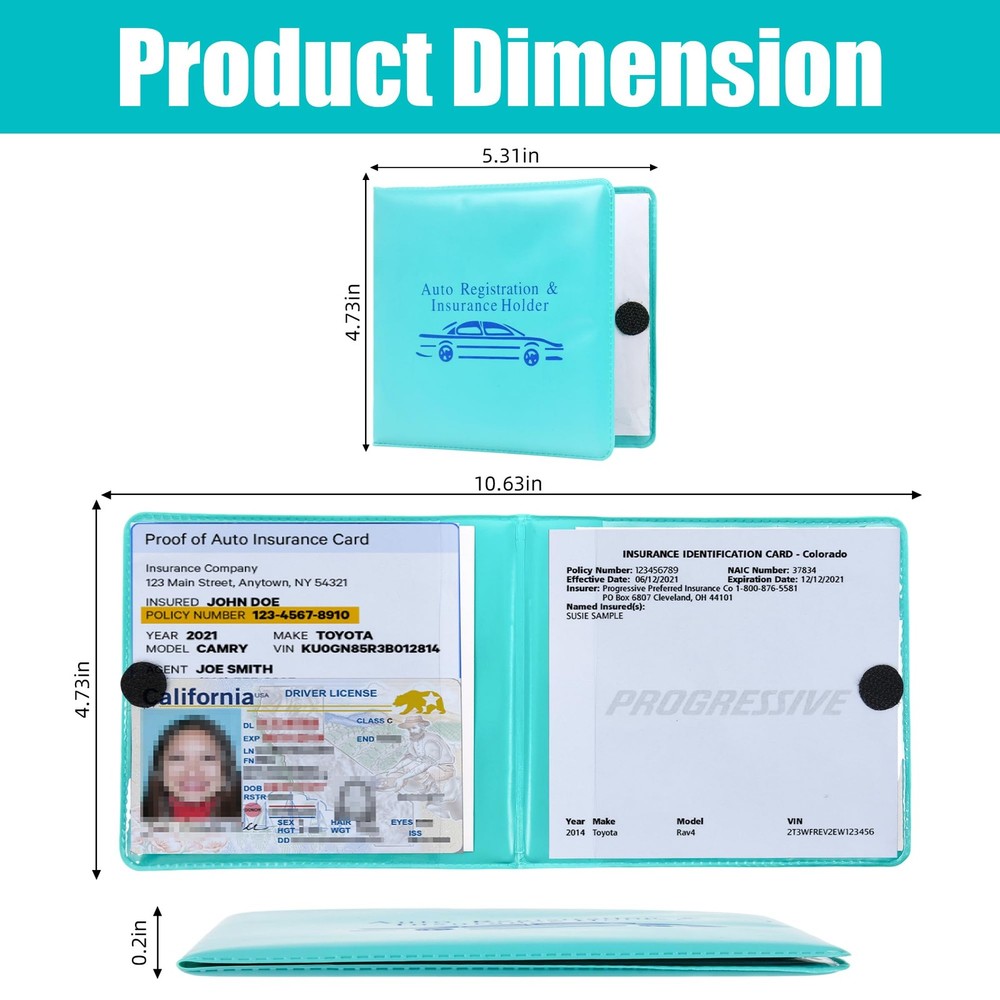 Auto Registration and Insurance Card Holder 2 Packs Car Document ID Holder Glove Box Organizer Car Accessories, Aqua Durable protection: car registration and insurance card holder crafted from high-quality faux leather materials. The auto registration and insurance card holder ensures your important documents are well protected from moisture, wear, and tear, keeping them intact and readable for years. Convenient organizational solution: Car insurance and registration card holder is featuring two clear, transparent pockets, this holder allows for easy storage and quick access to both your vehicle registration and insurance card, eliminating the hassle of rummaging through your glove compartment. Sleek and streamlined design: Designed with a slim profile, our holder seamlessly fits into your glove compartment, console, or side door, maintaining an uncluttered look while keeping your documents readily accessible. Perfect visibility: The clear pockets not only protect your documents but also enable you to display your registration and insurance without having to remove them from the holder, making it easier to present them during traffic stops or at registration renewals. Universal fit and versatile Use: This insurance holder is not just for cars; it's perfect for trucks, motorcycles, or any vehicle requiring documentation. Its universal design makes it a must-have accessory for any vehicle owner who values convenience and organization. Ensure your essential documents are both secure and stylishly organized with our Auto Registration and Insurance Holder. Designed with the modern driver in mind, this holder combines functionality with sophistication, providing an optimal solution for storing your vehicle's registration and insurance papers. Made from premium, water-resistant materials, it promises durability and protection against spills, tears, and wear and tear, ensuring that your documents remain in pristine condition. The holder features multiple pockets, tailored to fit standard auto documents, so you can easily separate and organize your insurance cards and registration papers without folding or damaging them. Its slim, compact design allows it to seamlessly fit into glove compartments, center consoles, or be tucked away in door pockets, making it effortlessly accessible. The elegant design, available in various colors, adds a touch of class to your car's interior, reflecting your attention to detail and care for your vehicle. Practical and chic, our Auto Registration and Insurance Holder is the perfect accessory for anyone looking to keep their important vehicle documents organized, protected, and ready at a moment's notice. Shipping We offer FREE shipping on all orders! We ship within Three business days of payment, usually sooner. We use a selection of shipping services such as UPS, FedEx, USPS etc. We only ship to the lower 48 states, no APO/FPO addresses or PO Boxes allowed. Local pickups and combined shipping options are not provided at this time. Return You can return a product for up to 30 days from the date you purchased it. Any product you return must be in the same condition you received it and in the original packaging. Please keep the receipt. Payment We accept payment by any of the following methods: PayPal Please pay as soon as possible after winning an auction, as that will allow us to post your item to you sooner! Feedback Customer satisfaction is very important to us. If you have any problem with your order, please contact us and we will do our best to make you satisfied. Contact Us If you have any queries, please contact us via ebay. We usually respond within 24 hours on weekdays. Please visit our eBay store to check out other items for sale! Thank you for shopping at our store.