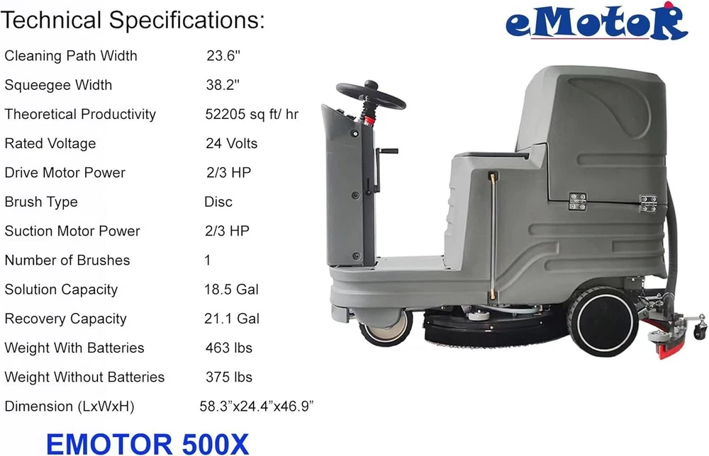 Auto Self-Propelled Ride on floor scrubber, 23.6" Brush 38" Squeegee Battery-powered ride on scrubber dryer, 23.6" brush, 38" squeegee width, 18.4 gallon fuel tank, brush speed 180 rpm, automatic scrubber with a full set of parts, can be viewed in the manual Ride on the battery-driven floor scrubber, suitable for daily cleaning of hard floors such as mirror tile floors, marble floors, epoxy floors, PVC floors, emery floors, terrazzo floors, concrete floors, etc., easy to use Advantages of using lithium batteries in the machine: Fast charge: It only takes 3-4 hours to fully charge the battery. The working time is up to 5-6 hours, and it can be used at any time by charging at any time Long lifespan: It can be recharged 1000+ times, and the use time is as long as 5~6 years. Low temperature resistance: Lithium battery is more resistant to low temperature and can be used normally in low temperature weather. Charging time: 8 hours. Working time: 3 hours. Shipped within 5-15 working days 1 year warranty (the manufacturer will ship the non-wear parts to the customer within two years) Please order new squeegee rubber and scrubber pads replace it every 3 months to get the ideal cleaning effect, otherwise you may find it difficult to push the machine forward. Clean tank: 18.4 gallon Recover tank: 21 gallon Battery: DC24V100AH Charging time: 8-10 hour Working time: 2.5-3 hour Work efficiency: 4580 ㎡/h Voltage: 24V Machine Weight: 464 lbs Brush size: 23.6 inch Squeegee width: 38 inch Machine Size: 58 x 24.4 x 46.8 inch Brush Pressure: 99 lbs Exactly Same as the Picture We offer 90 days warranty from the purchase date. Professional Installer Is Highly Recommend (No Instruction Included) Shipping Payment Returns About us: Shipping Please Domestic Lower 48 US States:Free Please Notice: Some products might ship out from our Indiana location if our CA location is not available All package over $150 will require signature for delivery. Sales Tax:Ebay will collect sales tax Note: Double check shipping address. We are not responsible for incorrect or undeliverable addresses. Please use Shipping & Payments tab on top of page for shipping details for your location. Shipping to PR, HI, AK and PO Box addresses will be charged the same as shipping to Canada. GU, VI, SAIPAN will be charged the same as international shipping rate. For Canada shipping please select the lowest price. We do not offer expedited shipping. US Territories such as GU, VI, SAIPAN will be charged the same as international shipping rate. Transaction will be held until a full shipping amount received. Some of the packages cannot be delivered to a PO Box. Customer is responsible to ensure PO Box address given is deliverable by the shipping company. Package will be held until a valid physical address is provided. Customer assumes shipping charges incurred in shipping to undeliverable address. International buyers are responsible for all customs duties, taxes, and other applicable fees incurred by the country's customs/border regulations. Please contact customs for more information. We ship 98% of all orders the same or next business day after payment received/cleared. Please understand that once orders are shipped, we cannot control the transit times thereafter. Most orders will ship via USPS First Class/Priority Mail or FedEx/UPS or the best suitable carrier for the specific size of the product. We are not responsible for any changes to address after item has been shipped. Payment Item will be shipped out within 24 hours after payment cleared, except for weekends and holidays. PayPal e-check takes 3-7 business days to be processed. We will not ship until an e-check has been cleared. Returns 14 Days money back, please notify us within 14 days after you've received your purchased item. All return requests must be submitted through your eBay account. You have to obtain a RMA (Return Merchandise Authorization) number from us, and have the RMA number written on the return package. Buyers pay for return shipping fee. Items to be returned must be in resalable condition. All returns are for refund ONLY. No exchange accepted. Returns for refund are subject to a 20% restocking fee. About us: Welcome to 2xspeed eBay Store. We specialize in aftermarket automotive car parts and is the One of Top industry distributor for Competitive prices and quality products. Our inventory is one of the largest and been consistently selling on eBay for a decade.Now we have 2warehouses located in LA and Chicargo.Please feel free to browse our catalog and contact us via phone or e-mail if you have any unanswered questions. Please note it may take up to 24-48 hours before a response is received by e-mail but rest assured your response is on file and will be attended to as soon as possible On Jan 19, 2023 at 11:47:34 PST, seller added the following information: