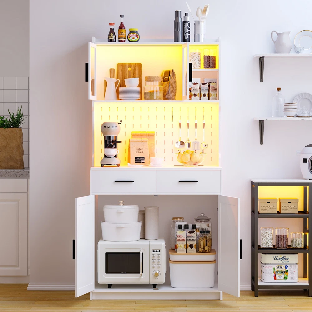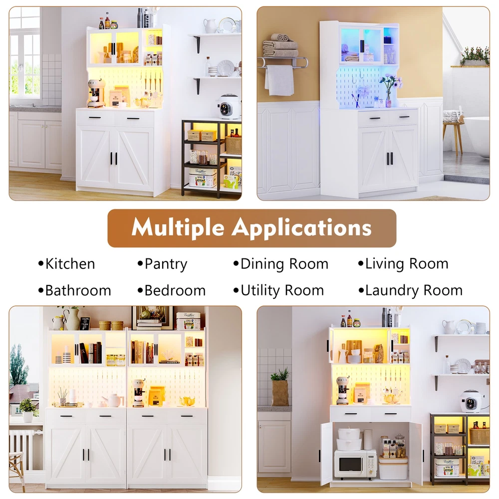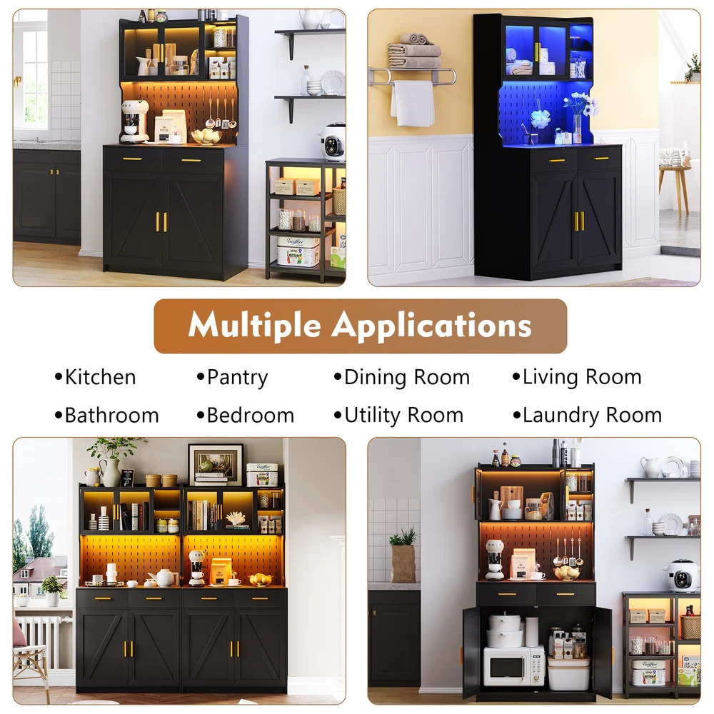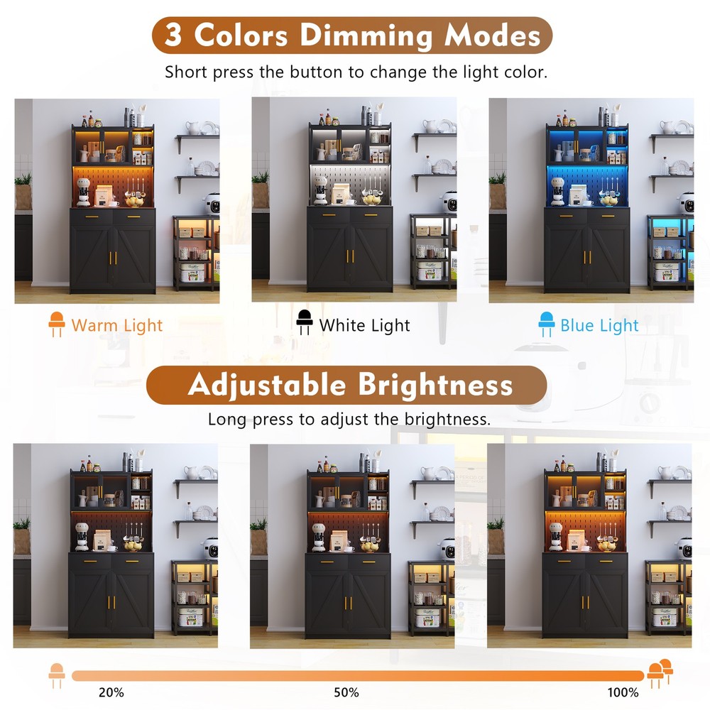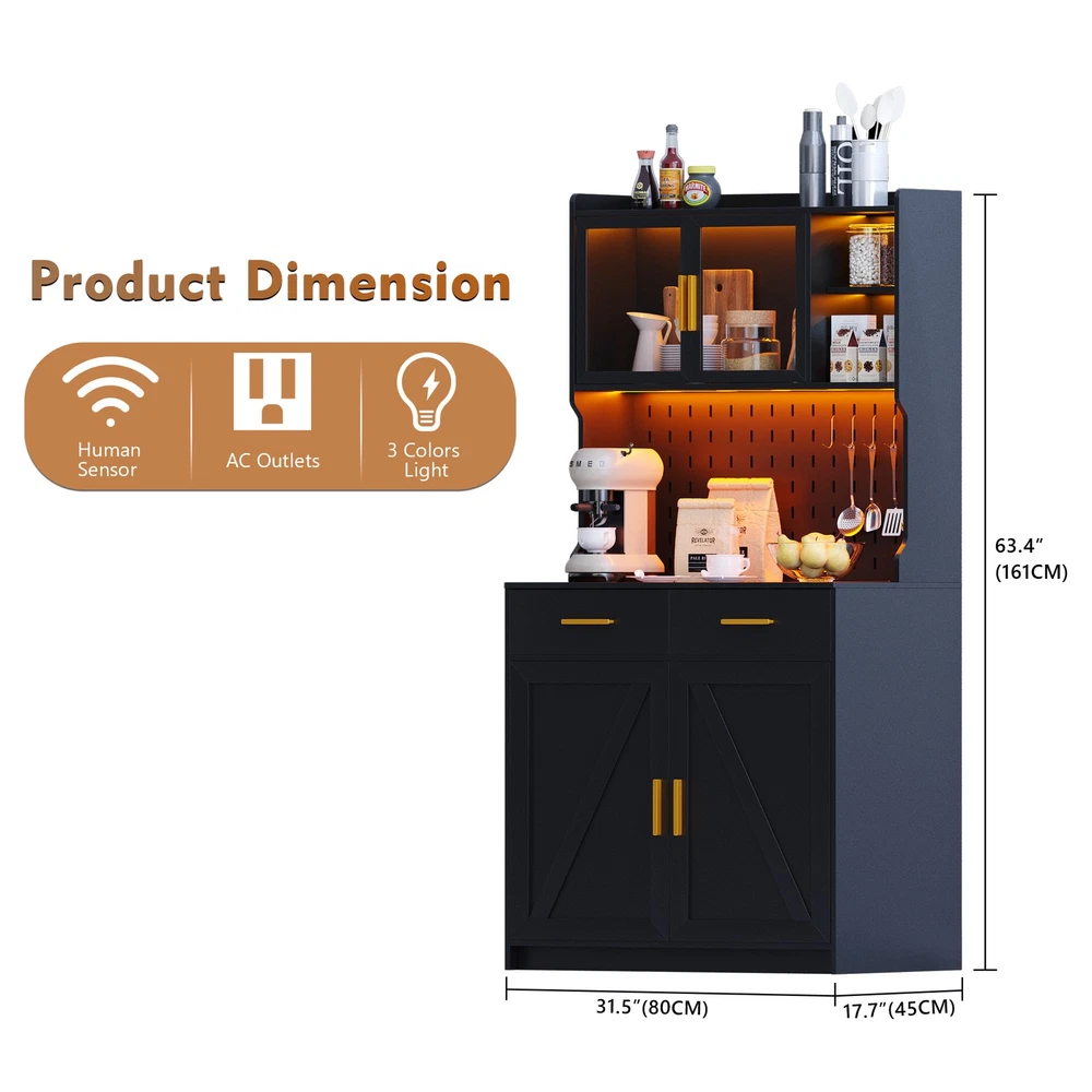 【Auto Sensor LED】Pantries has 3 dimmable colors (blue-white-warm white), adjust your favorite background color at any time. Auto-sensing mode: automatically turns on when you approach and off when you leave, making your life smarter and more convenient 【3-in-1 Charging Station】 The kitchen cabinets is equipped with 2 outlets and 1 USB port and 1 type-c port. It’s easier to plug in your coffee maker,microwave ,toaster,that makes your countertop neater 【Modern design】The doors above the cabinets are made of acrylic so you can clearly see what's inside. It also comes with a one-side pegboard with 6 hooks for hanging cups, towels, etc 【Storage space】The overall size is 17.7 "D x 31.5 "W x 63.4 "H. It comes with 2 cabinets, 2 drawers and a 3-tiered shelf where you can keep some utensils, and can also be used as a home storage cabinet/coffee bar cabinet, or a buffet sideboard with Human Sensor 3 Color Lights Gurexl LED Pantries 3 color Auto Sensor Light : white-warm-blue , the brightness can be adjusted Acrylic door : clearly see what's in the cabinet and improve the efficiency of finding thing Pegboard : with 6 hooks to hang some cups,towels Chaging Unit : 2 outlets & 1 usb & 1 type-c port Huge Storage Capacity : 2 cabinet & 2 drawers & 2-tier shelf & a large countertop 3-in-1 Charging Station - Convenient to charge your appliances,phone,headphone Huge Storage Capacity -