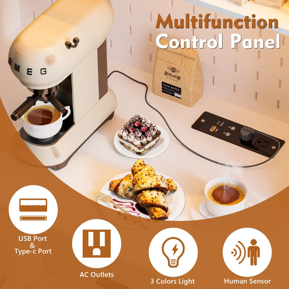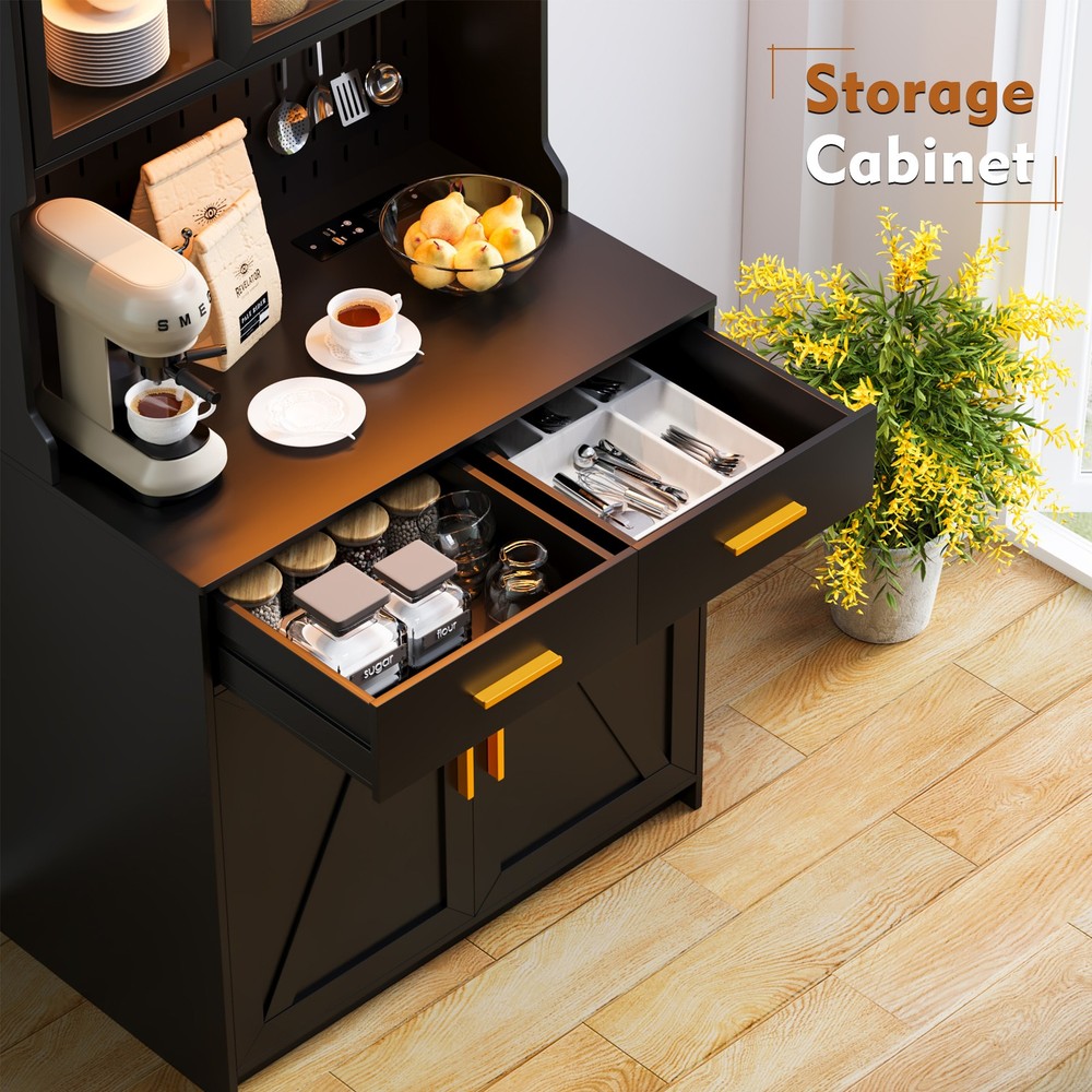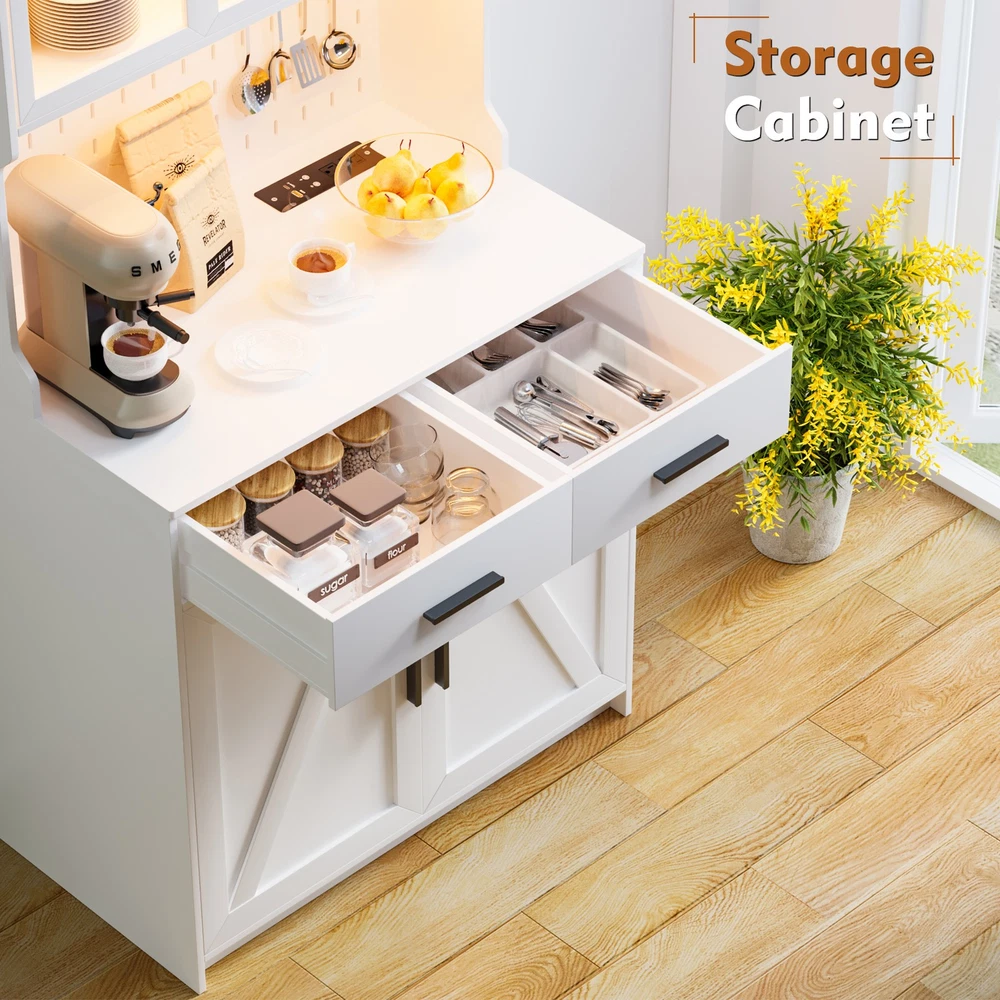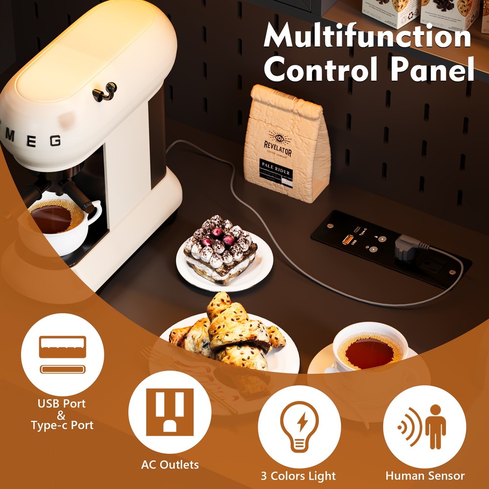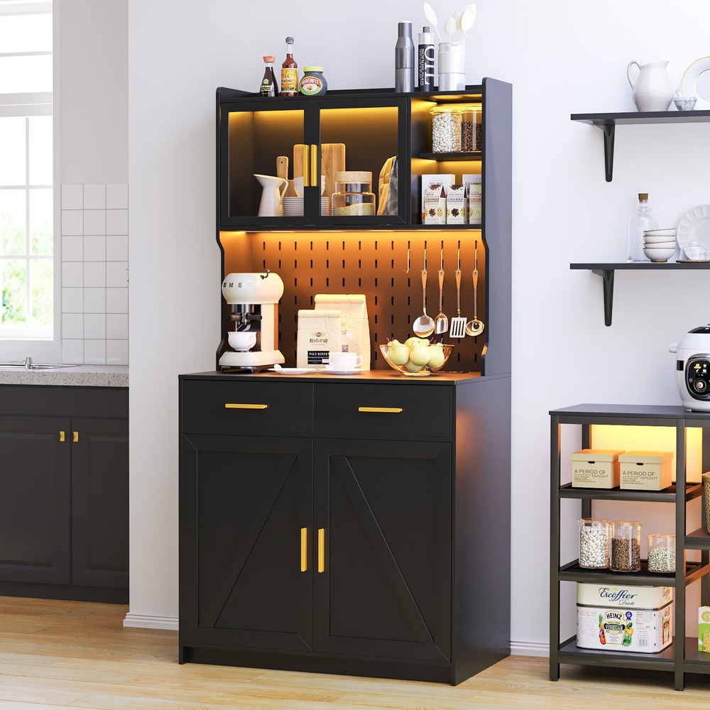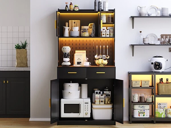 【Auto Sensor LED】Pantries has 3 dimmable colors (blue-white-warm white), adjust your favorite background color at any time. Auto-sensing mode: automatically turns on when you approach and off when you leave, making your life smarter and more convenient 【3-in-1 Charging Station】 The kitchen cabinets is equipped with 2 outlets and 1 USB port and 1 type-c port. It’s easier to plug in your coffee maker,microwave ,toaster,that makes your countertop neater 【Modern design】The doors above the cabinets are made of acrylic so you can clearly see what's inside. It also comes with a one-side pegboard with 6 hooks for hanging cups, towels, etc 【Storage space】The overall size is 17.7 "D x 31.5 "W x 63.4 "H. It comes with 2 cabinets, 2 drawers and a 3-tiered shelf where you can keep some utensils, and can also be used as a home storage cabinet/coffee bar cabinet, or a buffet sideboard with Human Sensor 3 Color Lights Gurexl LED Pantries 3 color Auto Sensor Light : white-warm-blue , the brightness can be adjusted Acrylic door : clearly see what's in the cabinet and improve the efficiency of finding thing Pegboard : with 6 hooks to hang some cups,towels Chaging Unit : 2 outlets & 1 usb & 1 type-c port Huge Storage Capacity : 2 cabinet & 2 drawers & 2-tier shelf & a large countertop 3-in-1 Charging Station - Convenient to charge your appliances,phone,headphone Huge Storage Capacity -