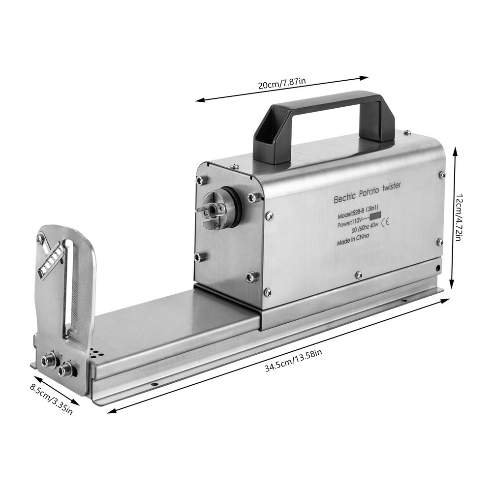 Electric Twisted Spiral Potato Cutter Auto French Fry Twisted Potato Tower 110V Specifications Model: 528-8(3 in 1) Color: Silver Style: Modern Shape: Rectangular Blade Shape: Round Material: Stainless Steel Process: Cnc Machining, Polishing, Stamping Recommended Uses for Product: Vegetable Operation Mode: Semi-automatic Power Source: Corded Electric Plug: Us Standard Voltage: 110v Frequency: 50/60hz Power: 40w Rotate Speed: 200r/Min Power Cord Length: 1.5m/4.9ft Blade Thickness: 2.7mm/0.1inch The Thickness of the Slice: 2mm/0.078inch, 2.5mm/0.098inch Product Size: 34.5*8.5*12cm/13.58*3.35*4.72inch Package Size: 42*19*15cm/16.5*7.48*5.9inch Net Weight: 3.2kg/7.05 Lbs Gross Weight: 4kg/8.8 Lbs Package Included 1* Electric Potato Twister 1* Handle 1* Sharp Blade 1* Power Cord Other Accessories for Installation Description Come and Enjoy the Delicious Food with Your Family and Friends Now! Our Electric Potato Twister Has High Quality, Exquisite Workmanship, 3 in 1 Functions, Great Cutting Effect, and Various Thoughtful Designs, Making It Convenient and Easy to Use. with It, Your Kids Will Eat Their Favorite Potato Chips or Your Customers Will Have More Choices. Key Features 3 in 1 Electric Potato Twister: It Can Cut Potatoes into Spiral Potato Chips, Curly Fries, and Potatoes Wrapped Around Hot Dogs, Adding Special Dishes to Your Shop and Satisfying the Different Needs of Your Customers. Efficient Cutting: Adopting an Ac 110v Motor with 200r/Min Speed and a High-strength Blade, This Machine Can Easily Cut Even and Beautiful Slices of 0.078" and 0.098", Providing You with Ideal Potato Chips. Easy to Install&Use : with the Simple Structure, Complete Accessories, and User-friendly Buttons, You Can Install and Use This Machine Easily. You Can Also Secure It to the Workbench Through Pre-drilled Holes on the Base to Ensure Stable Use. Easy to Clean: Because of the Smooth Surface with a Polishing Treatment, You Can Wipe the Dirt from This Machine with a Cloth. Protective Package: to Prevent the Product from Being Damaged and Bumped During Transportation, We Packed It with Environmental-friendly Pearl Cotton to Protect Your Products to the Maximum Extent Possible. Details Practical Handle: It Allows for Convenient Operation While Protecting Your Hands from Hurting and Ensures Easy Carrying with less Effort. Powerful Accessories: the Spare Fuses and Small Blades Ensure Convenient and Easy Replacement When Needed, Which Can save You Money Without Additional Purchase and Prolong the Machine's Lifespan. Long Power Cord: the 4.9ft Power Cord Allows You to Have Plenty of Disposable Lengths, Thus Reducing the Limitation When You Use It. Application It Is Specially Designed for Commercial and Household Use. It Is Ideal for Homes, Western Restaurants, Snack Bars, Fast Food Restaurants, Hotels, Apartments, Booths, Etc. to Cut Potatoes, Yams, Taros, White Radishes, Carrots, Cucumber, Onions, and Other Vegetables Without Kernels. How to Use Stick in the Peeled Potato with a Bamboo Stick(Not Included). Push the Bamboo Stick into the Center of the Hole. Connect the Machine to the Power Supply and Turn on the Switch. Slowly and Gently Push the Handle. The Delicate Potato Tower Is Finished. Push the Handle Back to the Proper Position and Turn off the Power. Notes There Is a Blue Plastic Seal Film Around the Entire Unit to Prevent the Machine from Scratches While Shipping, Please Remove It Before Using. This Machine Is Not Suitable for Foods That Are Too Soft and Have Kernels. Please Be Careful Not to Put Your Fingers on the Blade to Avoid Scratching During Operation and Cleaning. When Cleaning and Maintenance, the Power Should Be Cut off to Prevent Accidents. After the Work Is Finished, Please Gently Wipe the Machine with a Non-corrosive Detergent and a Wet Towel. Please Do Not Wash the Machine Directly with Water! You Can Place a Towel Under This Machine to Prevent It from Scratching the Countertop. Please Allow the Slight Color Difference Caused by the Shooting Light and 1-3cm Error Due to Manual Measurement, and Make Sure You Do Not Mind Before You Order. Payment Delivery details Terms of sales About us Contact us Payment We accept ebay payment 。 Fees such as import duties, taxes are not included in the item price or shipping costs. These charges are the buyer's responsibility. Delivery details Shipping: 2-9 working days to: USA Terms of sales We maintain high standards of excellence and strive for hundred percent customer satisfaction. Feedback is very important to us. We hope that you contact us immediately before you give neutral or negative feedback, so that we can address your concerns. It is impossible to address issues if we do not know about them! About us Your satis faction is our ultimate goal. We work hard to earn your trust and future business. Our certified technicians have tested each item before shipping. The unit comes with 1 year limited warranty on all manufacturing defects. a) If you receive a defective item, you may return it or ask for a discount. Please contact us within 14 days after you receive the package. b) What you returned must be intact and in its original packaging as re? u. Customer is responsible for shipping costs of the returned item. c) We will cover the cost of shipping back t with the shipping rate indicated in the registration page. We will send you a new unit or refund the full payment you paid. Thank you. Contact us Business Hour Business Hour: Monday To Friday: 8:30 AM to 5:00 PM (Beijing China time) Due to time zones, our reply to your questions may not be immediately. But within above working time, we will reply your email within 24 hours. If it's non-workdays, please kindly be patient and wait till Monday. Please contact us with ebay message. Please feel free to contact us if you have any questions. Monday To Friday: 8:30 AM to 5:00 PM (Beijing China time) Due to time zones, our reply to your questions may not be immediately. But within above working time, we will 