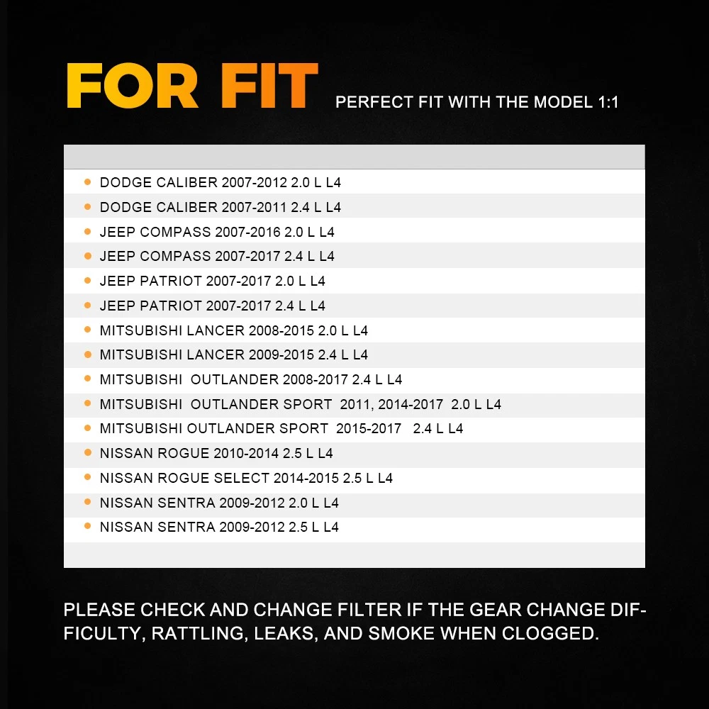Transmission Oil Filters Fit For Dodge,Jeep,Mitsubishi,Nissan etc Specifications: OE: Auto Transmission Filter: 31728-1XF03 / 31728-1XZ0D / 31728-1XZ0A New Transmission Oil Cooler Return Filter: 31726-1XF00 / 31726-1XZ0A / 2824A006 PAN Gasket: 31397-1XF0D Material:Aluminum銆丼ilicone Features: Superior material: The Transmission Filter is Made of High-Quality Materials,Which can Filter the Oil,Remove the Impurities,Keep the Oil Clean,Prevent the Valve Body and Other Parts of the Blockage,Which can Effectively Extend the Service Life of the Gearbox. Excellent Replacement: Auto Transmission Filter Oil Pan For Gasket Rogue Nissan Altima Juke 2007-18 new Transmission Oil Filters Fit For Dodge,Jeep,Mitsubishi,Nissan etc Specifications: OE: Auto Transmission Filter: 31728-1XF03 / 31728-1XZ0D / 31728-1XZ0A New Transmission Oil Cooler Return Filter: 31726-1XF00 / 31726-1XZ0A / 2824A006 PAN Gasket: 31397-1XF0D Material:Aluminum銆丼ilicone Features: Superior material: The Transmission Filter is Made of High-Quality Materials,Which can Filter the Oil,Remove the Impurities,Keep the Oil Clean,Prevent the Valve Body and Other Parts of the Blockage,Which can Effectively Extend the Service Life of the Gearbox. Excellent Replacement: Please check and change filter if the gear change difficulty, rattling, leaks, and smoke when clogged. All tested before shipment: All products were tested for performance and to ensure the accurate parameter for your vehicle. Packaging include: 1X Auto Transmission Filter 1X Gasket 1X Transmission Oil Cooler Return Filter FITMENT: FOR DODGE | DODGE CALIBER 2007-2012 2.0 L L4 DODGE CALIBER 2007-2 Item Specifics Type Transmission Filter Placement on Vehicle Front Features Easy Installation Manufacturer Part Number WWD-BSXLQQ-56111 OE/OEM Part Number(Auto Transmission Filter) 31728-1XF03 / 31728-1XZ0D / 31728-1XZ0A OE/OEM Part Number(New Transmission Oil Cooler Return Filter) 31726-1XF00 / 31726-1XZ0A / 2824A006 PAN Gasket 31397-1XF0D Universal Fitment No Material Aluminum & Silicone Fitment Fit For Dodge,Jeep,Mitsubishi,Nissan etc Manufacturer Warranty 2 Years keyword 1 Auto Transmission Filter Oil Pan Gasket Kit keyword 2 Transmission Filter Oil Cooler Return Pan Gasket keyword 3 Transmission Filter & Gasket & Oil Cooler Filter Fits for DODGE CALIBER 2007-2012 2.0 L 2007-2011 2.4 L L4 Fits for 1 JEEP COMPASS 2007-2016 2.0 L2007-2017 2.4 L L4 Fits for 2 JEEP PATRIOT 2007-2017 2.0 L 2.4 L L4 Fits for 3 MITSUBISHI LANCER 2008-2015 2.0 L 2009-2015 2.4 L L4 Fits for 4 MITSUBISHI OUTLANDER 2008-2017 2.4 L L4 Fits for 5 MITSUBISHI OUTLANDER SPORT 2011, 2014-2017 2.0 L L4 Fits for 6 NISSAN ROGUE 2010-2014 2.5 L L4 SELECT 14-2015 2.5 L L4 Fits for 7 NISSAN SENTRA 2009-2012 2.0 L L4 2.5 L L4 Auto Transmission Filter 31728-1XF03 / 31728-1XZ0D / 31728-1XZ0A New Transmission Oil Cooler Return Filter 31726-1XF00 / 31726-1XZ0A / 2824A006 Brand Unbranded Warranty 3 Year Payment Returns DESCRIPTION PAYMENT SHIPPING RETURN POLICY CONTACT US Shop Category Store Home LED Headlight ◈ H4 ◈ H13 LED Reverse Light ◈ T15/921/W16W LED Side Marker Light Car Parts & Accessories Tail Light assemblies Other Hot Item 10ft Seal Strip Trim For Car Front Rear Windshield Sunroof Weatherstrip Rubber USD 12.34 Ignition Control Module 4 Pin HEI Distributor for GM Chevy 1974-1988 Replacement USD 12.34 REPLACEMENT Radio Touch-screen GLASS Digitizer LCD For Chevy GMC 15-18 MYLINK USD 32.99 New Fits 2013-20 Nissan Pathfinder Front Left & Right Outer Bumper Cover Bracket USD 16.14 Fuel Gas Door Lock Cylinder & Keys For Toyota 1995-2004 Tacoma 2000-2003 Tundra USD 13.99 Picture New List Item AUXITO H3 LED Fog Light Bulb Conversion Kit Golden Yellow DRL Lamp 6000K USD 23.74 For Volkswagen Beetle 1998-2010 Car Dashboard Cover Dash Mat Shade Pad Black NEW USD 20.89 AUXITO 6000K Red 3157 Anti Hyper Flash LED Turn Signal Light Bulb w/ Resistors USD 17.09 6pcs Chrome PC Window Pillar Post Cover Trim For 2018-2023 Chevrolet Traverse USD 17.09 Mirror Glass Lower Convex Passenger Side LH for Transit Ford 150 250 350 2015-22 USD 12.34 Help & Info Payment Policy Shipping Policy Return Policy FAQ About Us Auto Transmission Filter Oil Pan For Gasket Rogue Nissan Altima Juke 2007-18 new Transmission Oil Filters Fit For Dodge,Jeep,Mitsubishi,Nissan etc Specifications: OE: Auto Transmission Filter: 31728-1XF03 / 31728-1XZ0D / 31728-1XZ0A New Transmission Oil Cooler Return Filter: 31726-1XF00 / 31726-1XZ0A / 2824A006 PAN Gasket: 31397-1XF0D Material:Aluminum銆丼ilicone Features: Superior material: The Transmission Filter is Made of High-Quality Materials,Which can Filter the Oil,Remove the Impurities,Keep the Oil Clean,Prevent the Valve Body and Other Parts of the Blockage,Which can Effectively Extend the Service Life of the Gearbox. Excellent Replacement: Please check and change filter if the gear change difficulty, rattling, leaks, and smoke when clogged. All tested before shipment: All products were tested for performance and to ensure the accurate parameter for your vehicle. Packaging include: 1X Auto Transmission Filter 1X Gasket 1X Transmission Oil Cooler Return Filter FITMENT: FOR DODGE | DODGE CALIBER 2007-2012 2.0 L L4 DODGE CALIBER 2007-2 Payment Returns All rights reserved. On Dec 5, 2025 at 11:21:38 PST, seller added the following information: