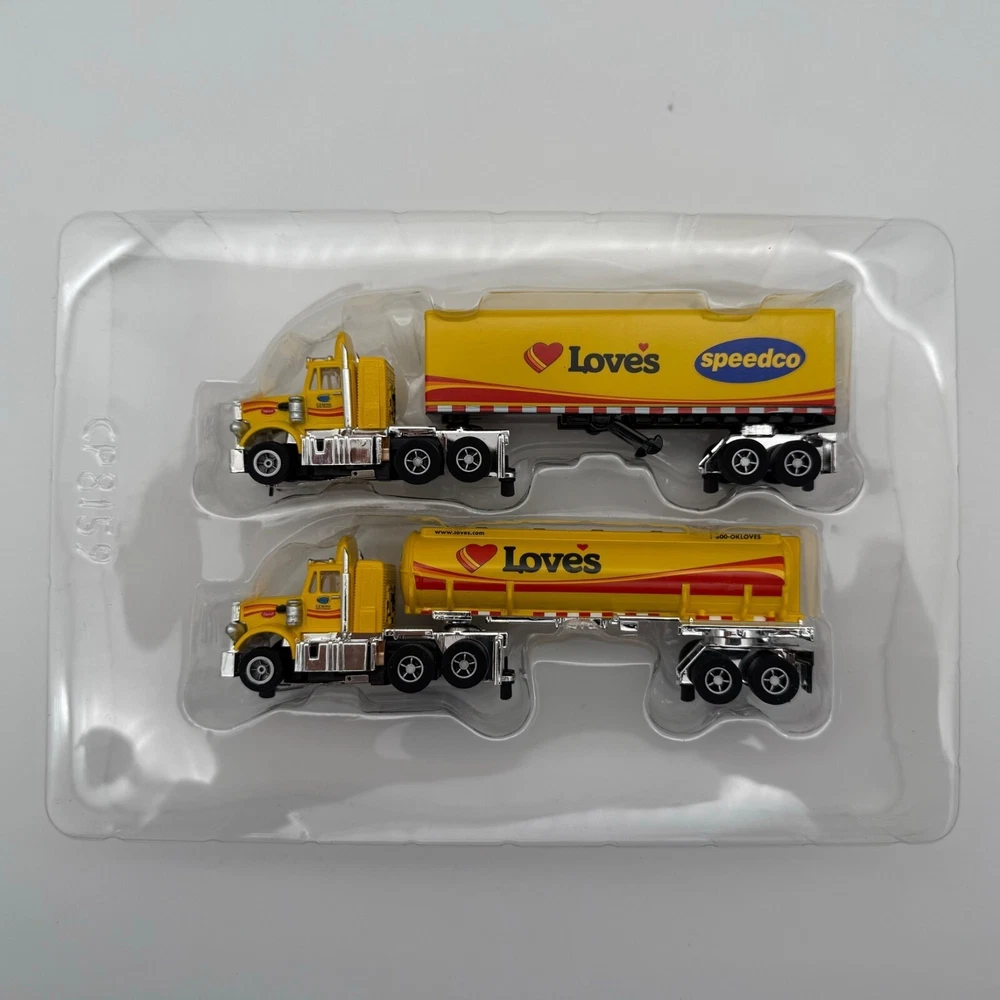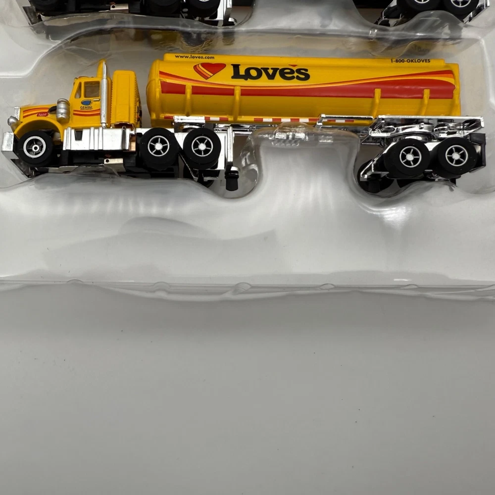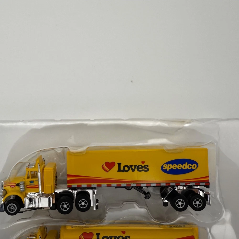 A collectible New Auto World Slot Car trucks Only featuring the Loves and Speedco branding. Vibrant yellow finish and detailed design elements make it a standout piece. • New Semi Truck Slot Cars • Yellow color • Loves and Speedco branding • Includes truck and trailer • Detailed design