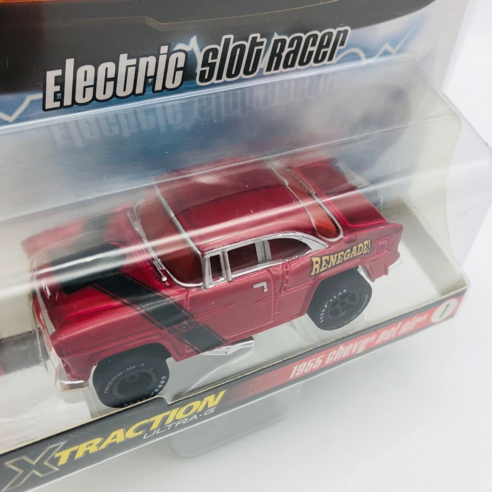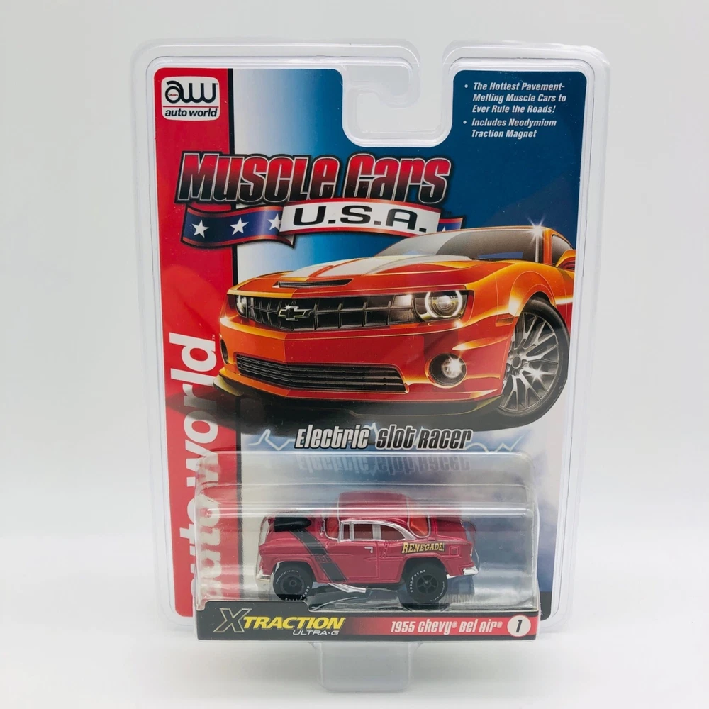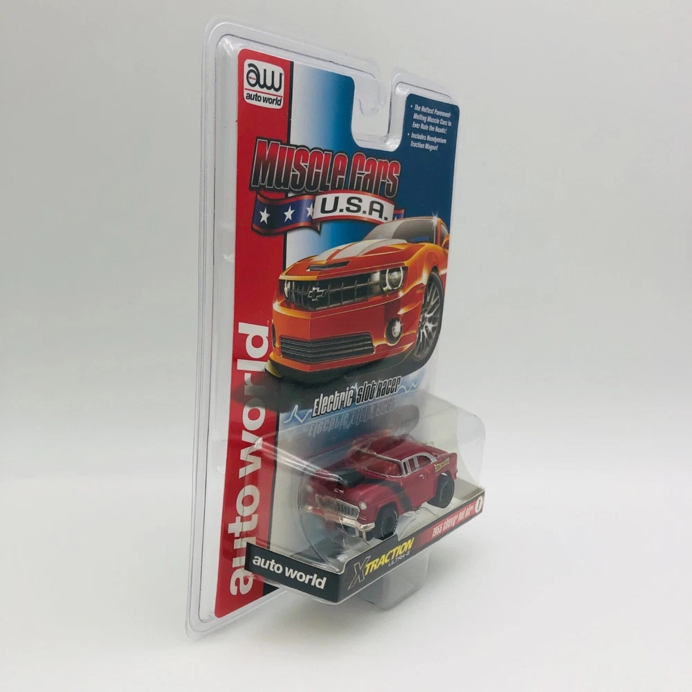 Experience the thrill of racing with this 1955 Chevy Bel Air electric HO slot car from Auto World. • Ultra-G Magnatraction • Xtraction Ultra G • 1955 Chevy Bel Air • Electric HO Slot Car • Auto World • Collector's Item Condition: New With Tags