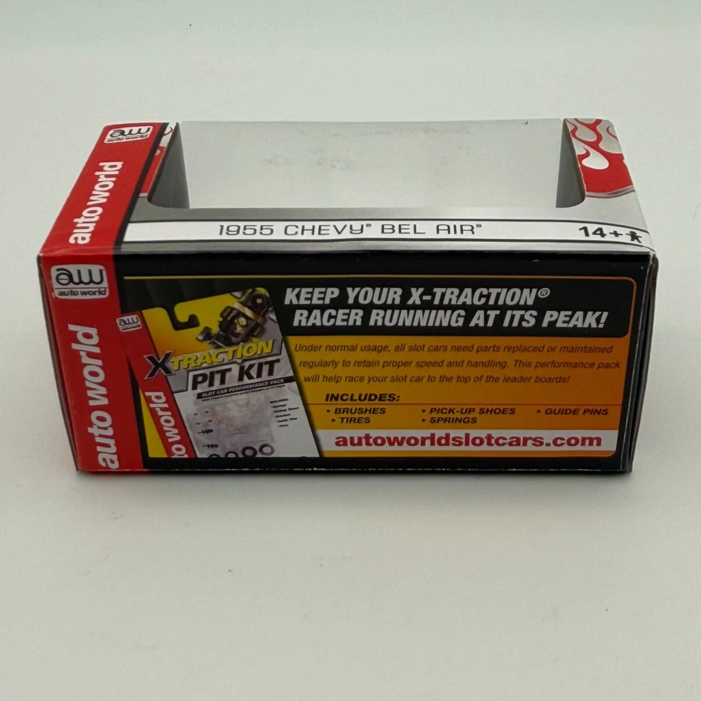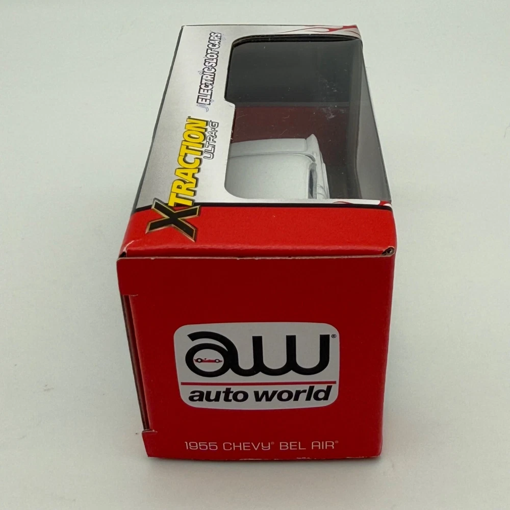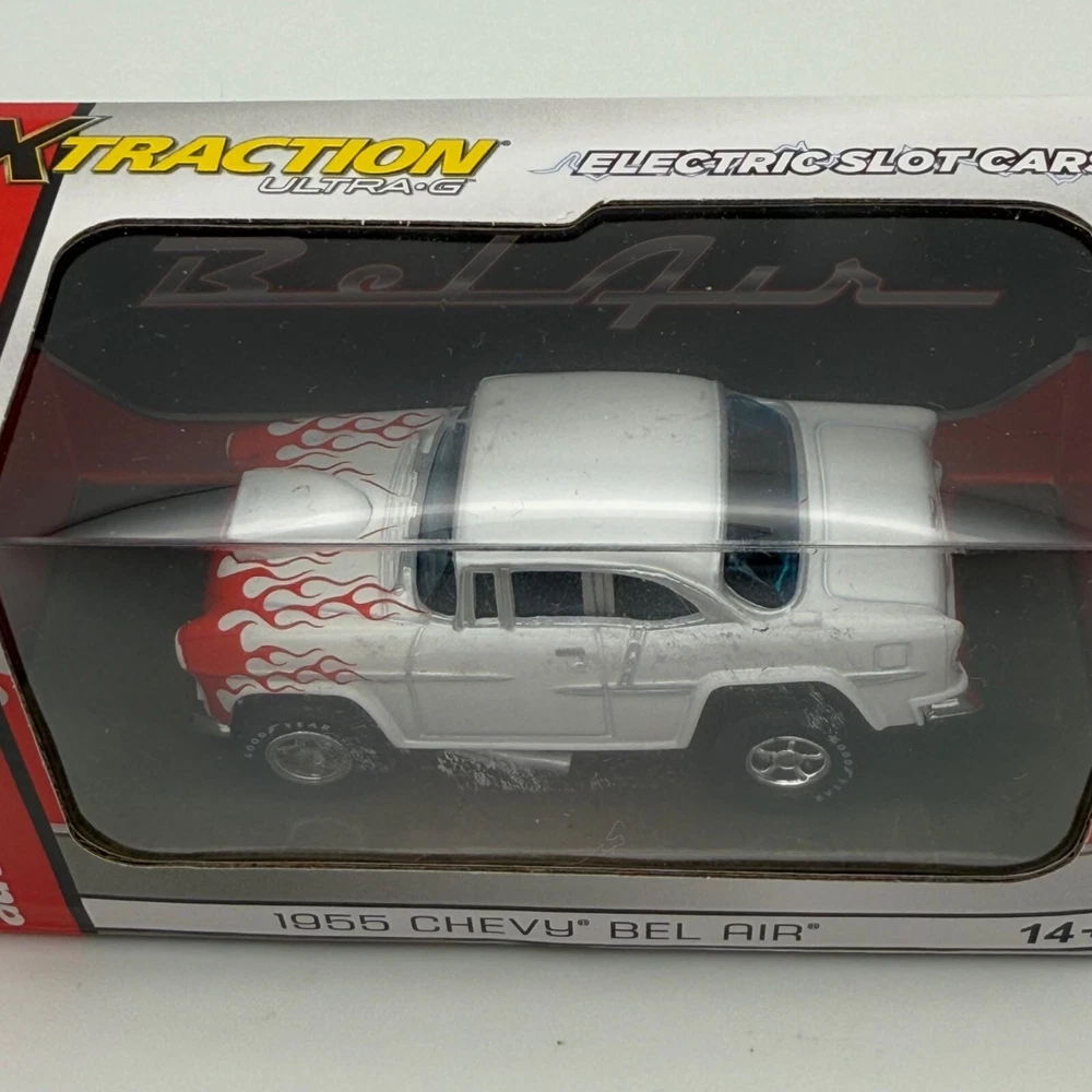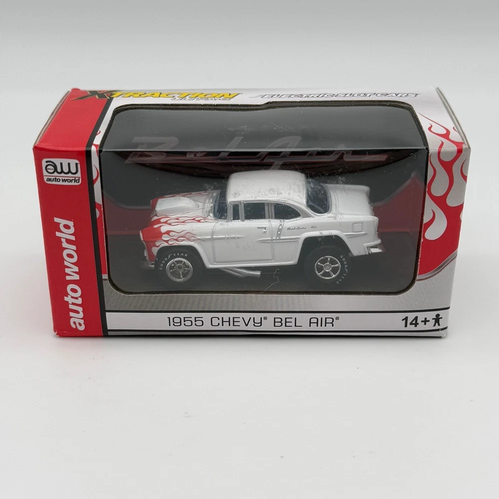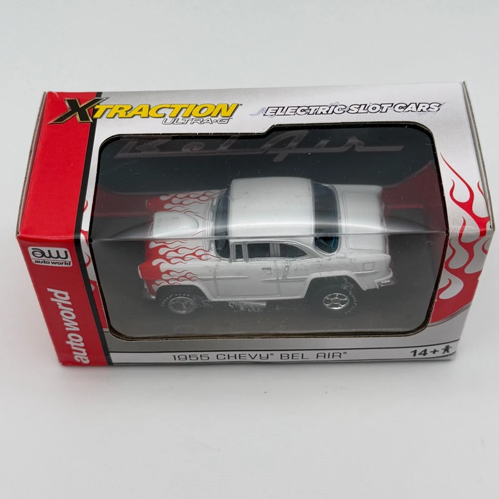 Auto World Xtraction Ultra-G 1955 Chevy Bel Air HO Slot Car New White Red Flames • 1955 Chevy Bel Air • HO scale slot car • White with red flame accents • Auto World • Xtraction Ultra-G