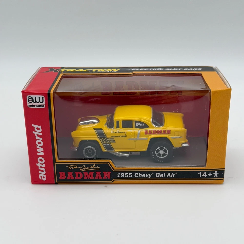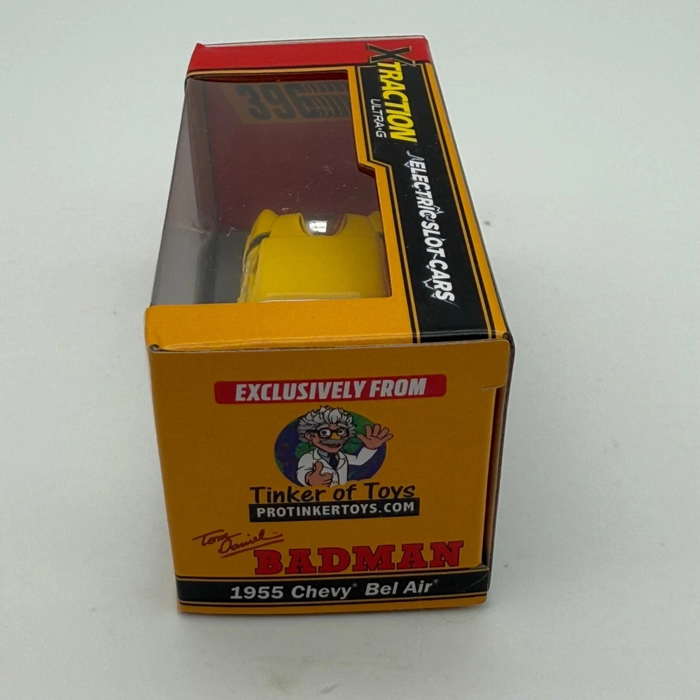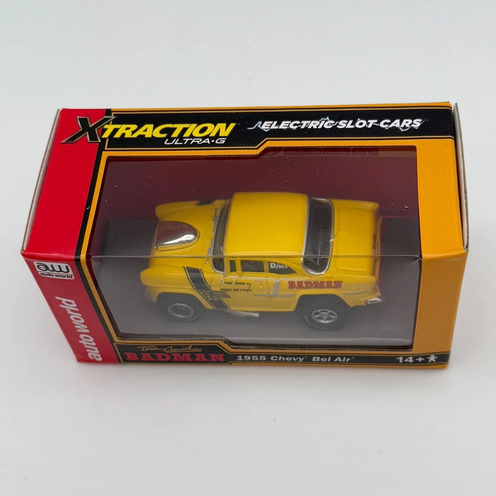 Auto World Xtraction Ultra-G 1955 Chevy Bel Air Tom Daniel Badman HO Slot Car • HO slot car • Detailed 1955 Chevy Bel Air • Ultra-G chassis for improved traction • Tom Daniel Badman • Yellow with Black Stripe Condition: New With Box New in Box