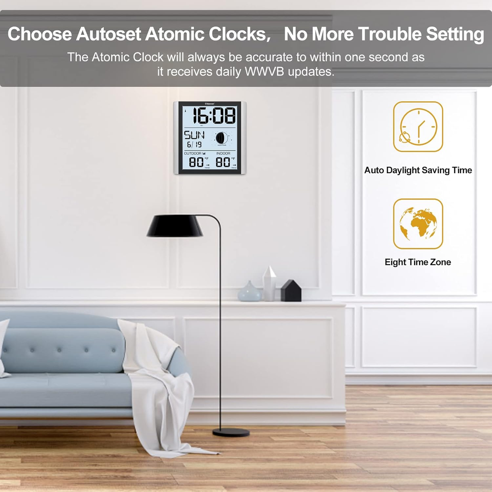 This clock is fantastic! It set itself perfectly and the backlight is so clear. I love being able to see the outdoor temperature and moon phase at a glance. It's incredibly accurate and easy to read.