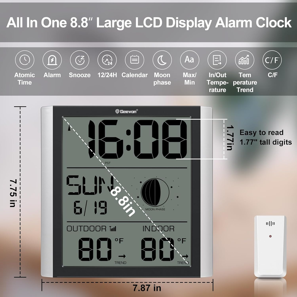Store New Arrivals Add to Favorite View Feedback Contact Atomic Wall Clock with Backlight, Auto-Set Digital Atomic Clock with Indoor Outdoor Temperature,Calendar,Moon Phase for Home Office Elderly(1 Wireless Outdoor Sensor) Description Item model number GN-228614-T2 Style Contemporary Are Batteries Included No Power Source Power Cord /Battery Operated Upper Temperature Rating 1.4E+2 Degrees Fahrenheit Country of Origin China Product Dimensions 1.7"D x 7.87"W x 7.75"H Material Acrylonitrile Butadiene Styrene (ABS) Shape Rectangular Number of Batteries 3 AAA batteries required. Specific Uses For Product Temperature, DST, Moon Phase, Time, Date Included Components Main Unit, Wireless Outdoor Sensor, Power Cord Item Weight 1.57 pounds Connectivity Technology 433 MHz or 868 MHz Special Feature function(f) {var _np=(window.P._namespace("DetailPageProductOverviewTemplatesJava"));if(_np.guardFatal){_np.guardFatal(f)(_np);}else{f(_np);}}(function(P) { P.when('A').execute(function(A){ A.on('a:truncate:po-attribute-truncate-4:updated', function(data) { var isTruncated = !data.truncateInstance.getIfTextFits(); var seeMoreElement = document.getElementById('po-attribute-see-more-id-4'); if(seeMoreElement) { seeMoreElement.style.display = isTruncated ? '' : 'none'; } }) }); })); Atomic Clock, Backlight (Adjustable), Wall Clock & Desk Clock, Gradually Ascending "Beeping" Alarm Noise for Heavy Sleeper, Indoor & Outdoor Temperature See more Display Type LCD Color Backlight Sensor Technology Capacitive Batteries 3 AAA batteries required. Recommended Uses For Product Office, Garden, Restaurant, Kitchen, Library, Home 【8.8'' Large Digital Atomic Clock with Backlight】Large atomic wall clock battery operated with an 8.8'' LCD TN high definition slim display, can simultaneously display date, time (12/24H), week,moon phase,indoor&outdoor temperature(° C/° F),records the daily MIN & MAX data and display tendency.And the digits are big enough for easy-viewing.If you would like the backlight to stay on, please plug in the power cord (included). 【Atomic Clock with Indoor/Outdoor Temperature 】Digital atomic wall clock with temperature monitor function,The Wireless outdoor sensor (included) transmits the outdoor temperature ( ° C /° F optional)to the digital wall clock large display. Which means you can put them inside your patio, backyard, garden or courtyard,easily monitor outside conditions without going out. 【Enhanced Atomic Clock Technology】Battery powered atomic clock will always be accurate to within one second as it receives daily WWVB updates, just select your time zone (7 time zone)at the setting buttons of the clock and turn on the DST if applicable. Automatically updates for daylight saving time,weekday,day,month,time,help you manage regular life. 【Atomic Alarm Clock with Snooze Function】Not only a Calendar and Thermometer, but also can be used as a loud alarm clock. When the alarm goes off,atomic digital clock with day and date will send out a gradually ascending "beeping" sound to wake you up. Before the alarm stops itself, press the "SNOOZE" button to get an extra 5-minute nap. Perfectly designed for heavy sleepers. (NOTE: The alarm goes off for 2 minutes, and if there is no action during this period, it will no longer continue to alarm.) 【Digital Wall Clock & Atomic Desk Clock】Our atomic weather clock features 2 hanging holes and a kickstand, can not only be placed on the nightstand, but also hung on the wall. The bold, simple styled silver bezel of the clock gives it a modern look, with a classic feel. Perfect for any room in the house, office, bedroom, closet, classroom or living room. Product Description 1.Please kindly make sure if you set the correct time zone for the atomic clock. 2.Please confirm whether you have turned on the daylight saving time function (If you don’t need this feature, please turn it off) Package Contents: 1. Geevon Atomic Clock (Use 3 AAA batteries, not included) 2. Outdoor Temperature Sensor (Use 2 AAA batteries, not included) 3. Power Adapter (Length: 80 Inches) 4. Instructions Manual Radio controlled signal: WWVB Temperature measuring unit: °C / °F Indoor / outdoor temperature: 1.Indoor temperature 0°C – 50°C (32°F – 122°F) 2.Outdoor temperature-30°C – 70°C (-22°F – 158°F) Geevon 228614C Atomic Wall Clock with Indoor & Outdoor Temperature and Backlight Easy to Read - Easy to Use - Permanent Backlight --Time, Month, Date, Day and Moon Phase are clearly shown and using radio frequencies broadcasted from NIST’s Colorado atomic clock. Geevon atomic alarm clock will receive the signal within the broadcast range anywhere an AM signal can be received; generally, the time signal cannot be picked up in massive metal and concrete structures unless near a window. Choose between EST AST HAST AKST PST MST CST with option to turn on or off Daylight Savings Time. (Atomic feature only functions in North America). In addition, some environmental effects may affect the transmitting distance and reception. For more information, please refer to the WWVB web page of NIST. Temperature accuracy: -40°C ~ -20°C: ± 4°C;-20°C ~ 0°C: ± 2°C;0°C ~ +50°C: ±1°C Note: when the temperature in 50°C ~ 70°C range, the temperature is only for reference. 3 Dimmer Levels & Permanent backlight 1.Permanent backlight mode is only possible when plugged into power supply. Touch top button of the clock to adjust the clock brightness( Off - Dim - Bright ) 2.Please note that in order to prevent reception interference, all buttons are temporarily unavailable when the atomic clock is receiving the signal (the whole process may last 1-2 minutes). To ensure accurate signal reception, the backlight will temporarily turn off. Once the atomic clock wall receives the signal, Everything is back to normal. 3.When the Atomic wall/desk clock is only powered by the battery,touch the top button to turn on the backlight.(Automatically turn off after 10 seconds) Alarm with Sn