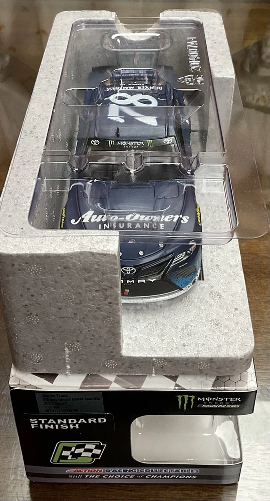 This autographed 2017 Martin Truex Jr. 1:24 scale diecast car is a must-have for any NASCAR fan. Celebrate Truex's victory at the Kansas race with this blue Toyota NASCAR racecar. The car is made of high-quality diecast material and features intricate details that make it a great addition to any collection. The autograph on this car is very faint, but it is signed by Martin Truex Jr. The car is suitable for ages 17 and up and is part of the Cars character family. The Lionel brand ensures that the collectible is of great quality. This must-have item is perfect for display and is a great gift for any NASCAR enthusiast.