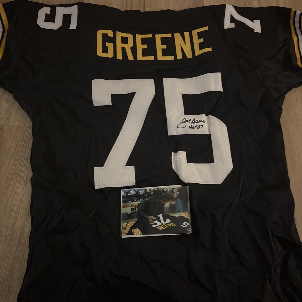 The product is an authentic autographed Pittsburgh Steelers Mean Joe Greene Hall of Fame 1987 black jersey, graded and authenticated by Beckett Grading Services. This unique item is a must-have for football fans and collectors alike, showcasing the signatures of the legendary player himself. It is a rare and valuable piece of sports memorabilia that would make a great addition to any fan's collection, especially for fans of the Pittsburgh Steelers and football enthusiasts.