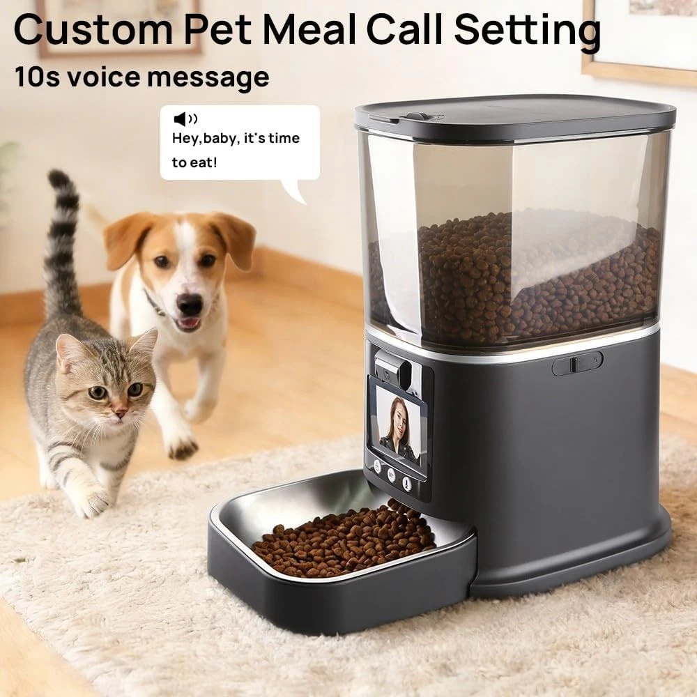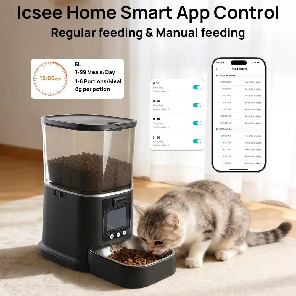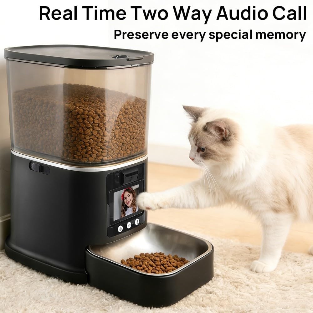 Features two Way Video and Audio Interaction Unlike standard feeders this unit features a screen on the front so your pet can see your face while you hear and speak to them in real time High Definition Camera with Night Vision Features a one hundred fifty degree adjustable camera up down for wide angle monitoring and clear Night Vision to check on your pet in the dark Stable five G and two point four G WiFi Supports dual band WiFi for a faster more stable connection ensuring uninterrupted monitoring and control Handles Freeze Dried Food The anti jam mechanism is robust enough to dispense varied food types including staple kibble freeze dried treats and complete freeze dried meals without getting stuck Quadruple Freshness Lock Keeps food fresh with a four part system a lockable top with a full airtight seal a built in desiccant box a sealing strip and a unique auto closing food outlet to prevent oxidation and bugs Dual Power Supply Never worry about power outages This unit runs on a wall adapter and has a battery backup system batteries not included to ensure feeding schedules continue even if power or WiFi fails App Control and Scheduling Use the mobile app to set timed feeding plans portion control and view the live video feed anytime Mischief Proof Design Features a chew proof cord an L shaped plug that wont pull out easily a lockable lid to prevent spills if knocked over and a secure feeding port to stop sneaky snacking Specifications Capacity five Liters Large Capacity Connectivity two point four GHz and five GHz WiFi Camera HD with Night Vision and one hundred fifty degree Tilt Bowl Material Stainless Steel Detachable and Washable Food Compatibility Dry Kibble and Freeze Dried Mixes Power AC Adapter plus Battery Backup Whats in the Box one Smart Automatic Feeder with Camera one Stainless Steel Food Bowl one Power Adapter with Chew Proof Cord one User Manual