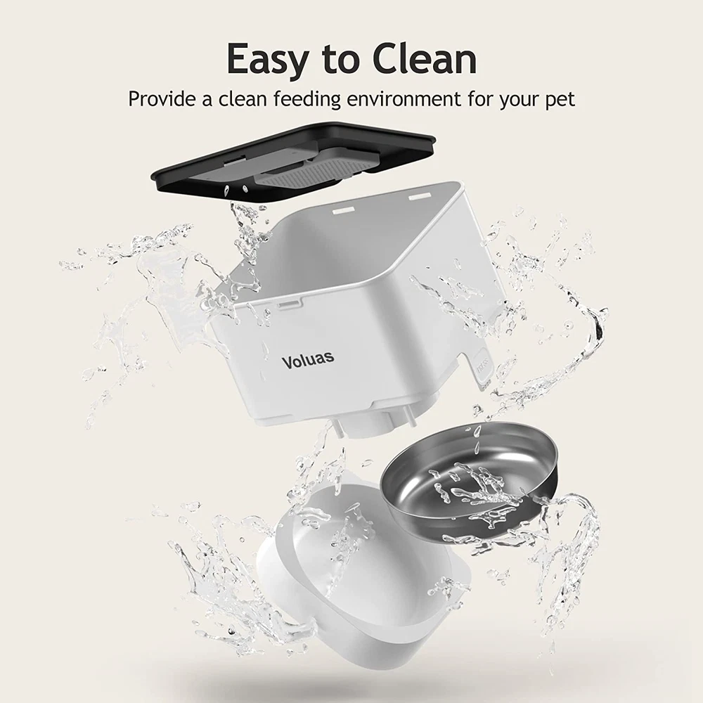 Easy Programmable Feeding Times: Reliably feed your beloved pet at your convenience any time during the day or night; Set between 1-4 meals with 0-40 portion choices to automatically dispense food to give a personal customized diet for your pet Wired or Battery Power: Choose between a fixed wired connection with the 5V adapter USB power cable or a portable 3 D-cell battery-powered feeding station; Flexible options prevent your pet from going hungry during power outages Voice Record Meal Call: Let your cat hear your voice when it’s mealtime to create a strong bond and set good eating habits; Record up to 10 seconds of audio for your furry friend User Friendly Operation: Intuitive LCD screen makes setup and programming a breeze; Removable cleanable parts foster a healthy environment for your pet’s food High-Capacity Food Storage: The 4L/16.9 Cup (1 Cup = 48 Tsp) food storage will keep most pets comfortably fed for several days; Easily keep your cat or dog fed during long weekends and short business trips; Get the peace of mind of a full and happy pet Product description Voluas Automatic Cat Feeders Simplified Pet Care, Always Within Reach The video showcases the product in use. The video guides you through product setup. The video compares multiple products. The video shows the product being unpacked. VOLUAS Automatic Cat Feeders Merchant Video Replaceable Desiccant Bag Keep your pet’s food fresh and dry with these desiccant packets; They effectively prevent moisture, ensuring your pet always enjoys fresh food. Stainless Steel Cat Water Fountain Keep your pet fed and hydrated with a stainless steel fountain—fresh, flowing water even when you're away. No more worries! 6L Automatic Feeder for 2 Cats This Automatic Cat Food Dispenser for 2 Cats is a must-have! Feeding both cats simultaneously, it averts fights. 5L Automatic Feeder for Two Cats Stainless steel build, sturdy and durable. Transparent window, monitor food easily. Dual-feeding for two cats, no food fights. Ideal for multi-cat homes, style meets convenience.