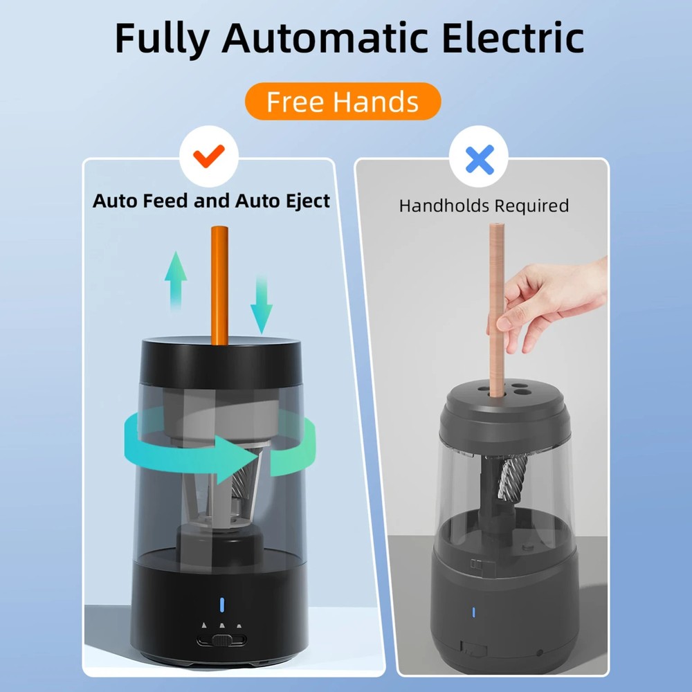 ONLY WHITE !!!! Upgrade your workspace with this Automatic Electric Pencil Sharpener , designed for speed, precision, and convenience. Featuring a powerful motor and durable helical blade, it sharpens new pencils in just 5 seconds and dull ones in 3 seconds—perfect for students, artists, and office use. ✔ Fast & Efficient – Sharpens quickly with auto-stop at optimal sharpness. ✔ Versatile Fit – Works with 6–8mm round, hexagonal, and triangular pencils. ✔ Rechargeable & Long-Lasting – Built-in 1800mAh battery, up to 600 uses per charge. ✔ Adjustable Sharpness – Choose fine, medium, or coarse points. ✔ Large Capacity – 400ml waste bin for less frequent emptying. Compact, portable, and reliable—this sharpener is the smart choice for school, office, or art projects. ✅ About This portable automatic pencil sharpener combines power and durability with modern convenience. With adjustable sharpness, universal compatibility, and long-lasting rechargeable battery, it’s designed to make sharpening quick and hassle-free. Perfect for teachers, students, and professionals who need precise results every time.
